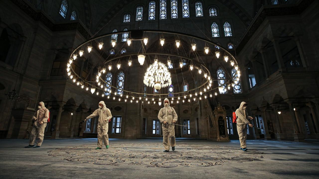 Fatih Belediyesi ekipleri, yeni tip koronavirüs (Covid-19) önlemleri kapsamında Nuruosmaniye Camisi`nde dezenfekte işlemi gerçekleştirdi. (Arşiv)