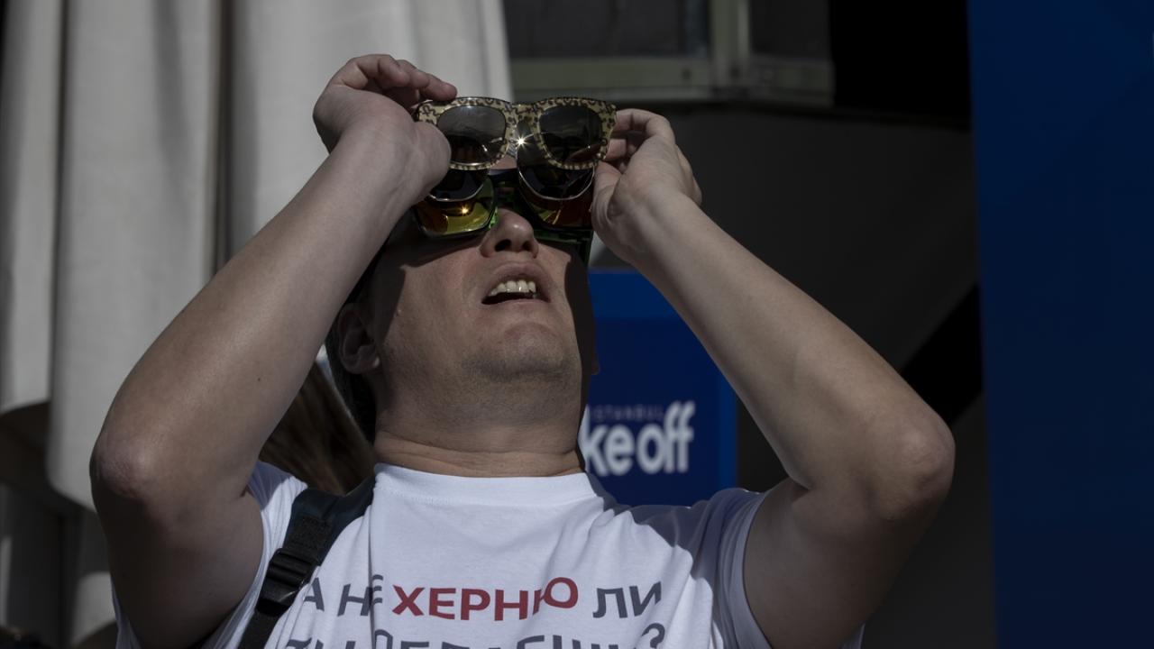 Bazı vatandaşlar, güneş tutulmasını güneş gözlükleriyle izlemeye çalıştı.