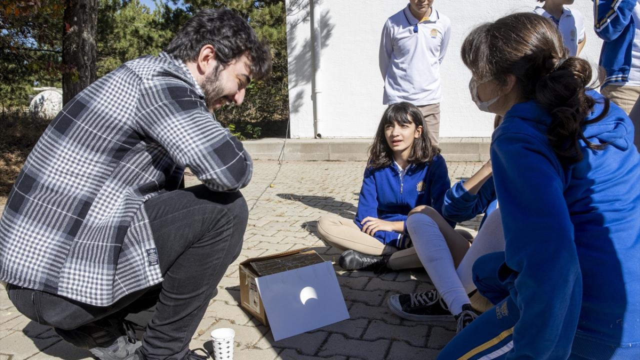 Güneş tutulmasını atık malzemelerle yaptıkları projektörle izlediklerini ifade eden Günşen, "Kutuların üzerine bir delik açtık. Arkasına beyaz bir kağıtla perde hazırladık. Alüminyum folyoyu da küçük bir iğne deliği şeklinde deldik ve projektörü hazırladık. Karşıdan ışığı alarak güneş tutulmasını görüyoruz." dedi.