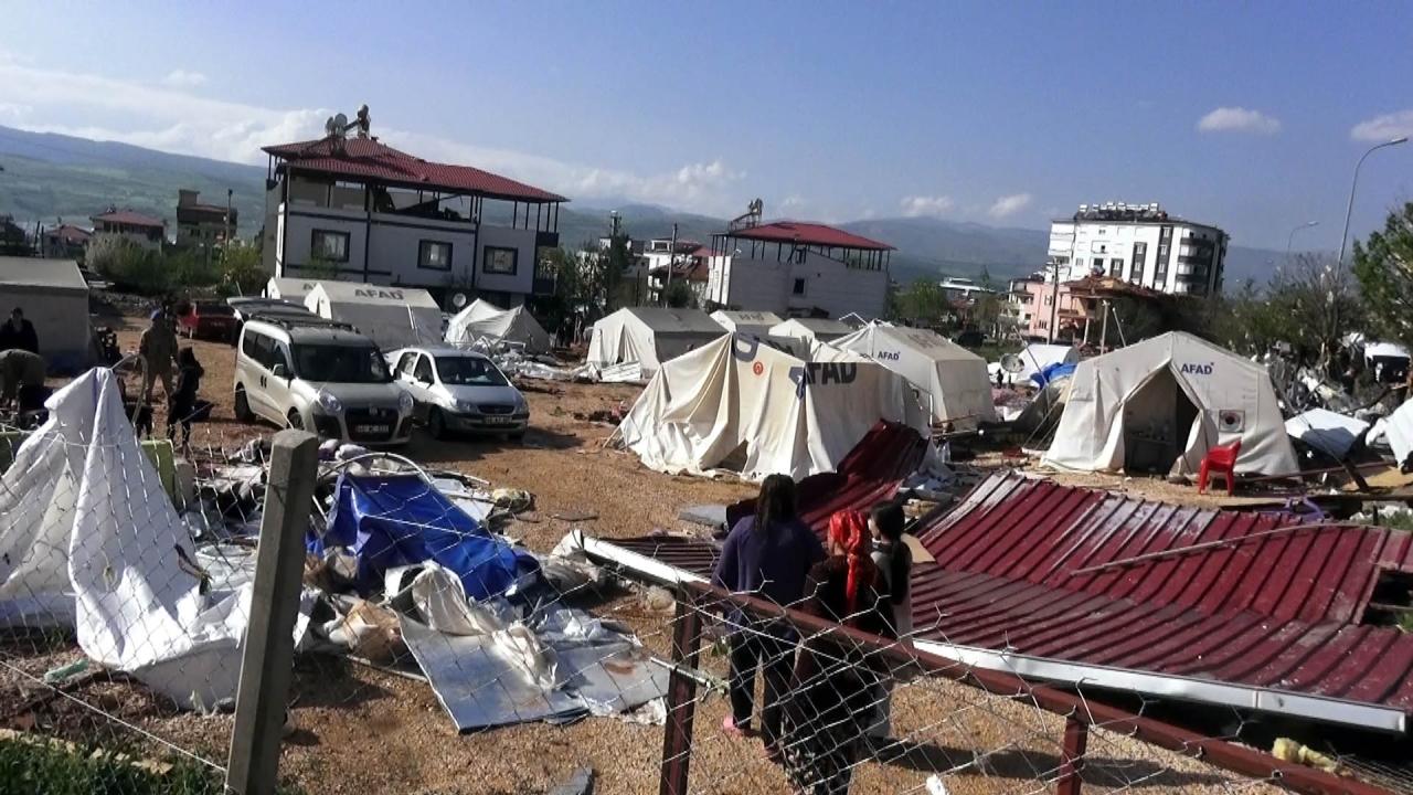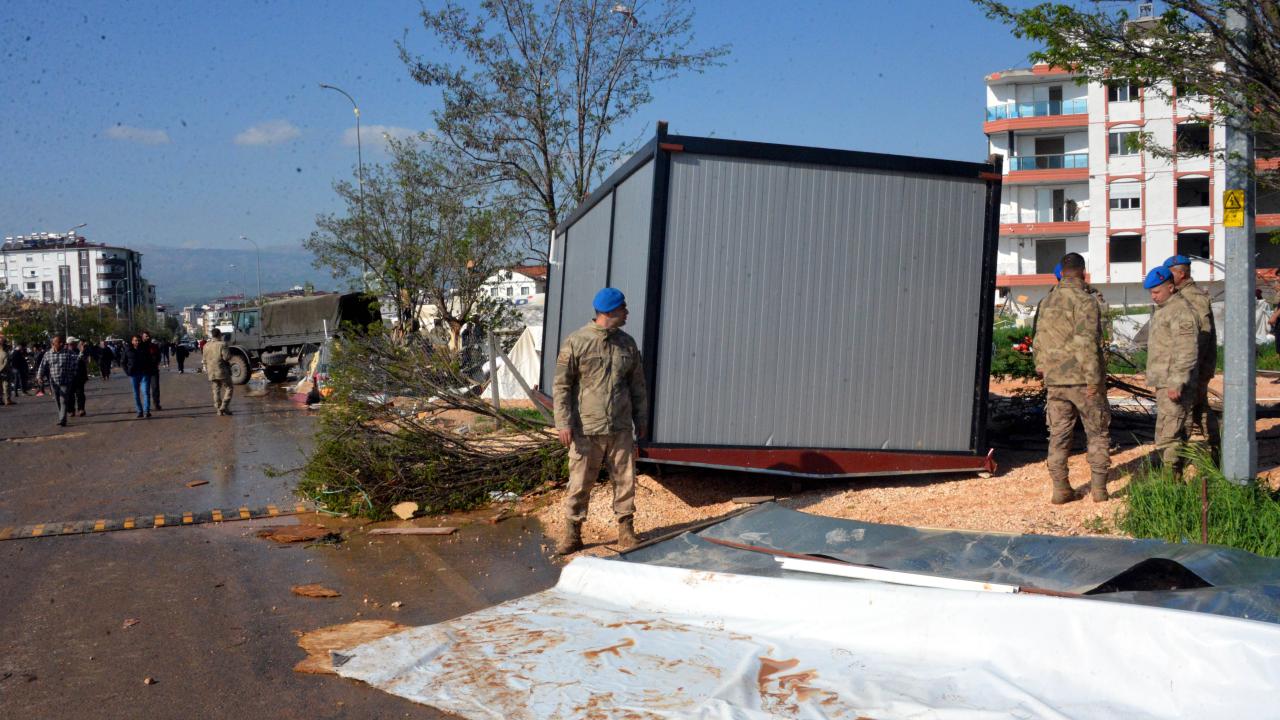 Kahramanmaraş'ın Pazarcık ilçesinde aniden çıkan hortum, hayatı felç etti. Hortum, özellikle çadırlarda ve konteynerlerde kalan depremzedeleri vurdu. Hortum, çadır ve konteynerleri yerinden uçurdu.