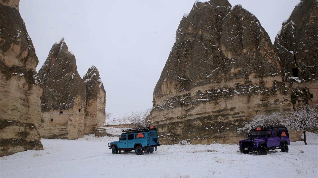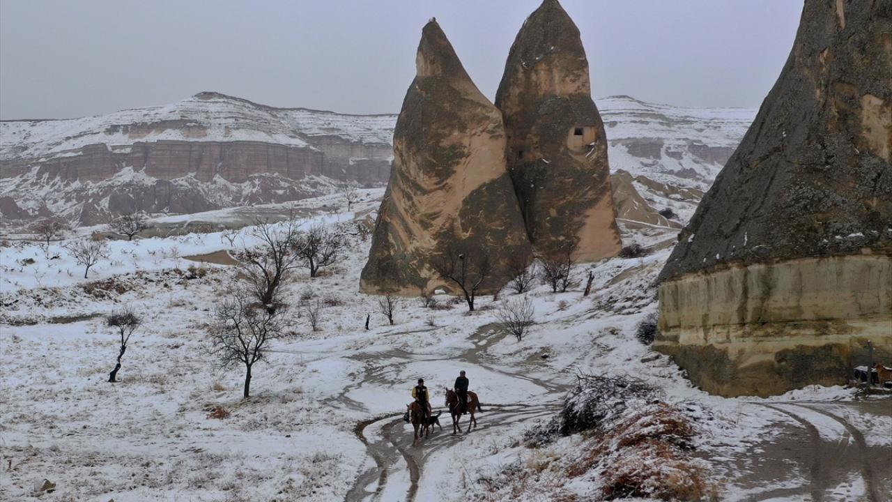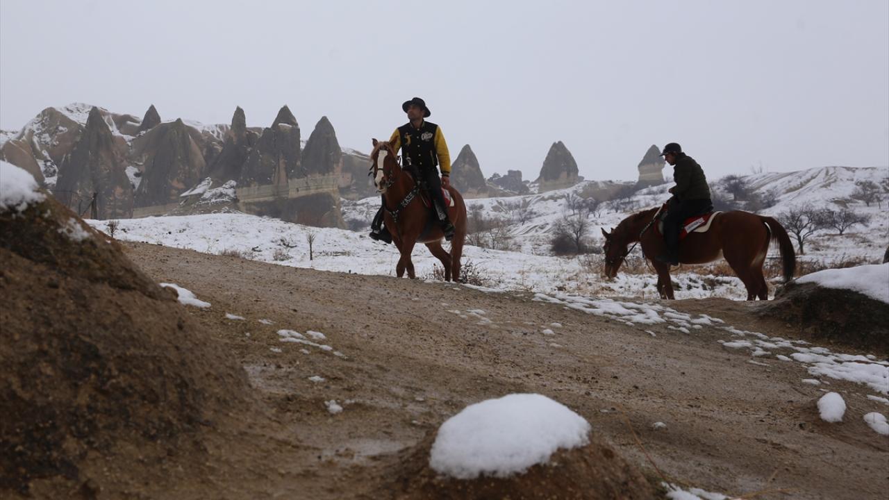 Kar yağışıyla beyaz gelinliklerini giyen peribacaları arasında her gün düzenlenen aktivitelere katılan yerli ve yabancı turistler, büyüleyici manzaranın keyfini çıkarıyor.