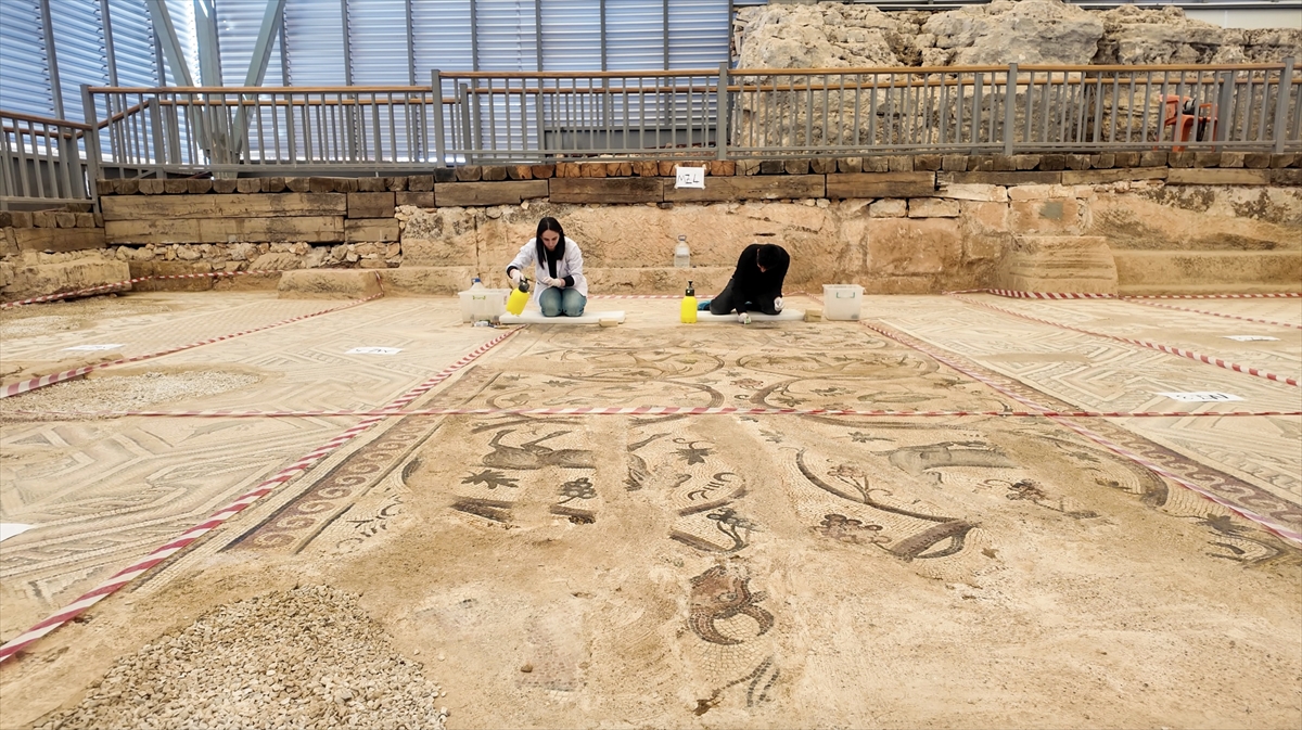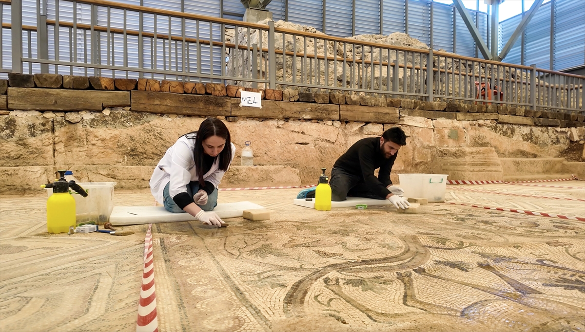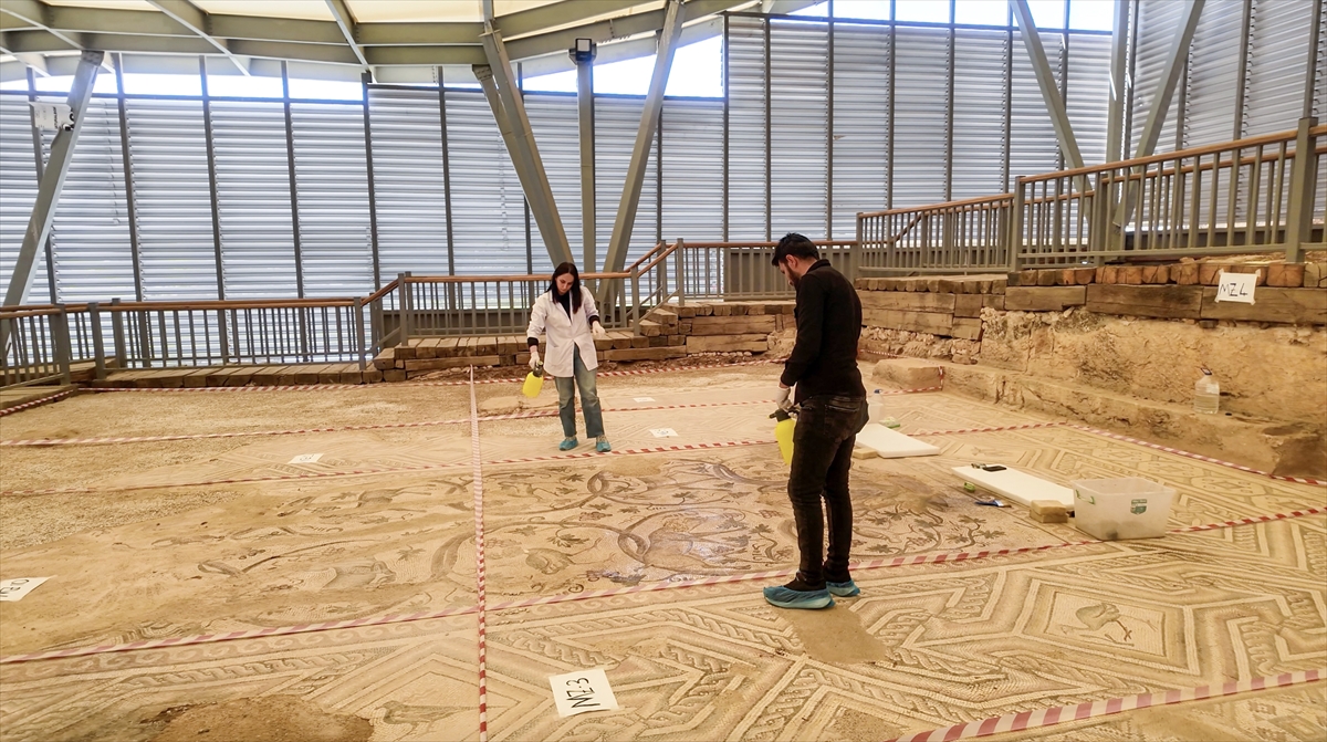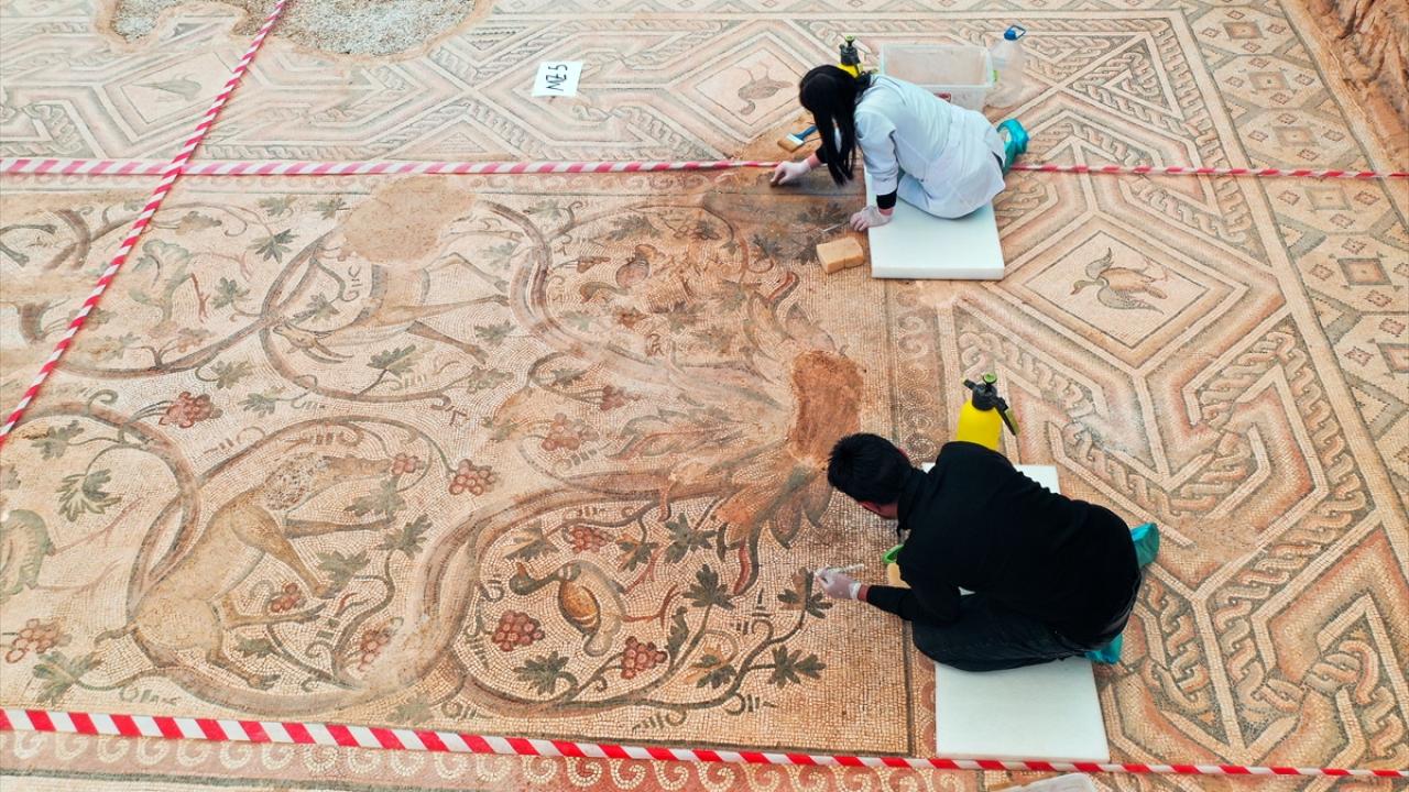 "Bulunduğumuz alan, milattan sonra 5. yüzyıla tarihlenen bir bazilikanın taban mozaiğine ait. Toplam 155 metrekarelik bir alanı kaplayan bu mozaik, şu anda 125 metrekarelik sağlam kısmıyla korunmuş durumda. 2021`de ilk restorasyonu yapılmıştı. Şimdi ise temizlik ve konservasyon işlemleri yürütüyoruz. Bu çalışmalar tamamlandığında mozaik yeniden ziyarete açılacak."