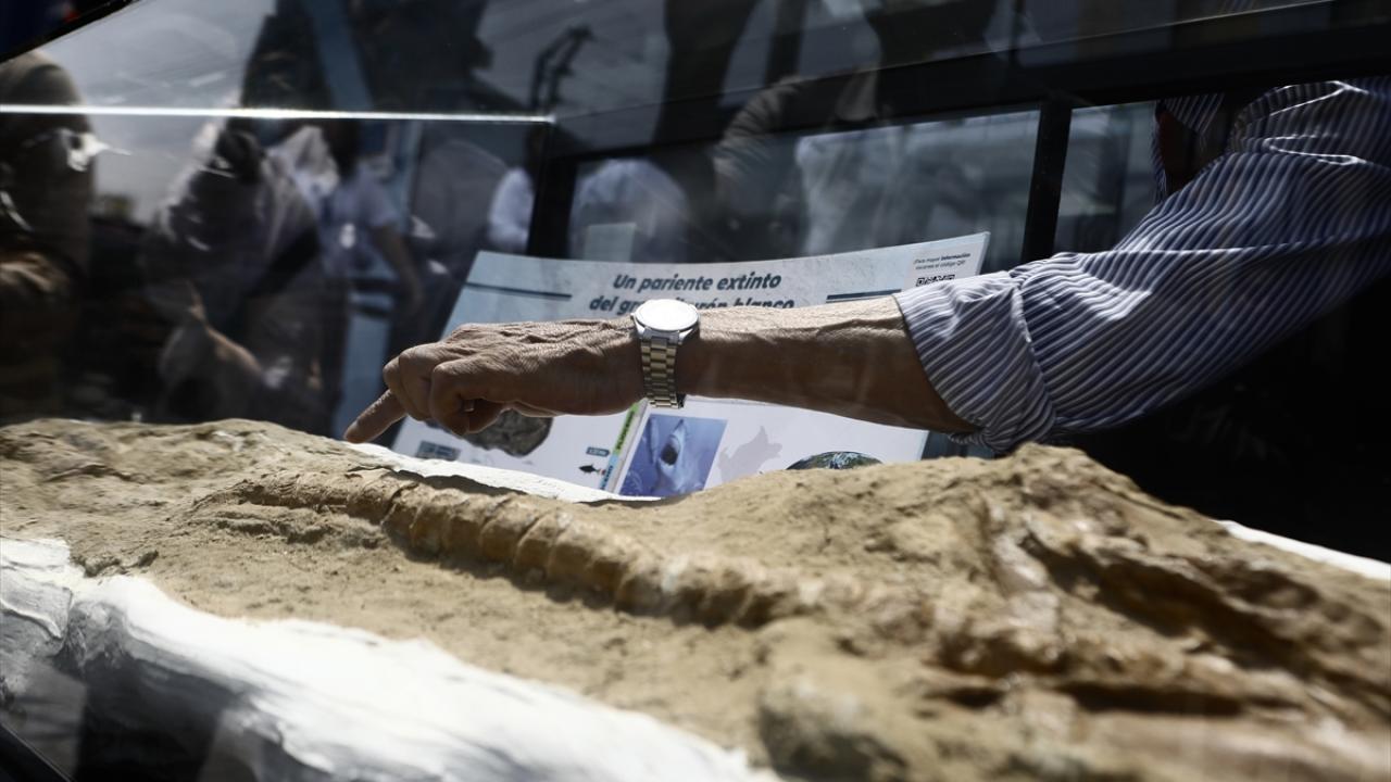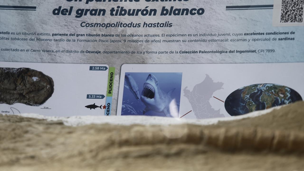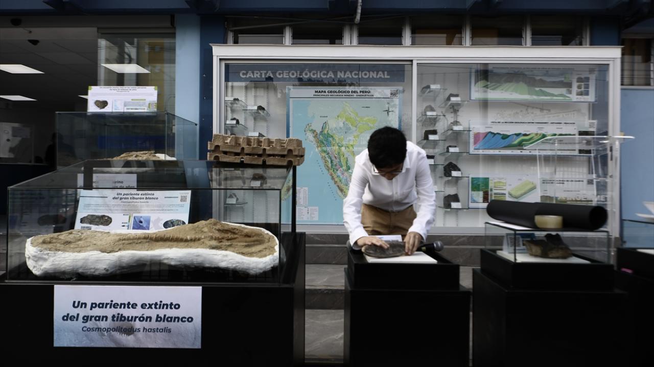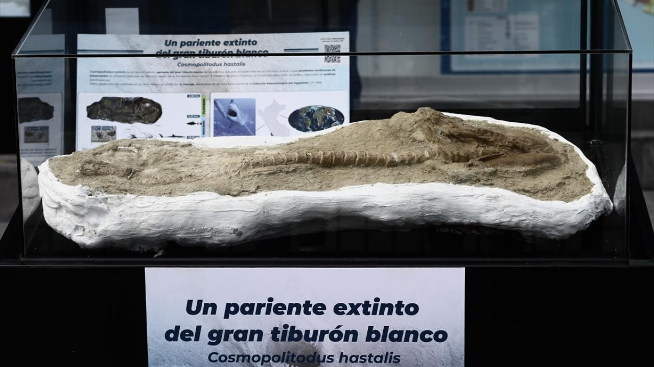 Peru'nun Lima kentinde bulunan 9 milyon yıllık olduğu belirtilen soyu tükenmiş geniş diş beyaz bir köpek balığı fosili Jeoloji, Madencilik ve Metalurji Enstitüsü'nde sergilendi.