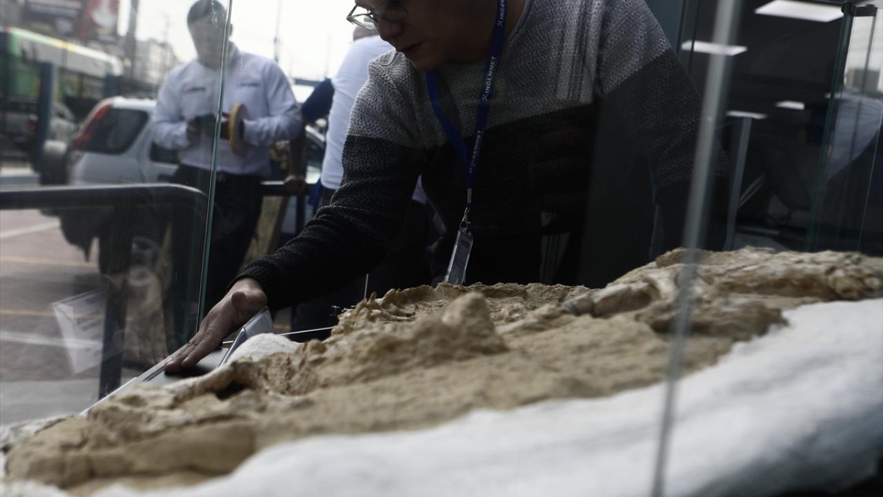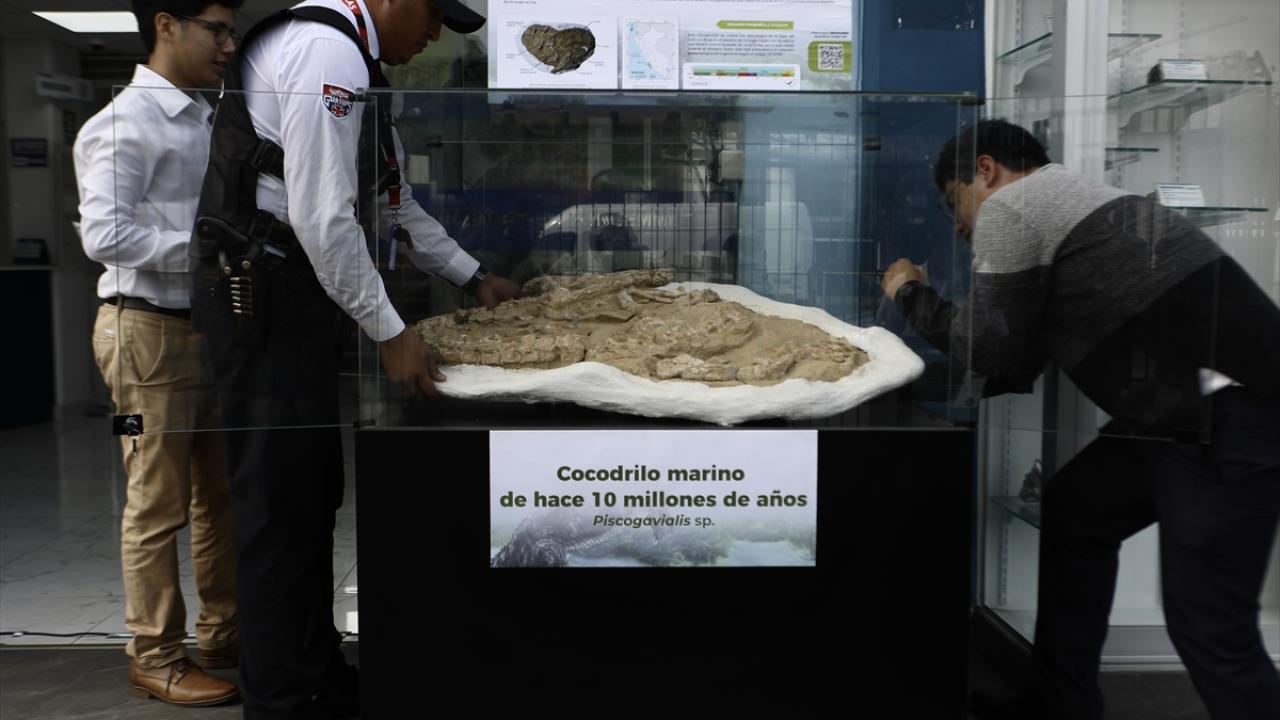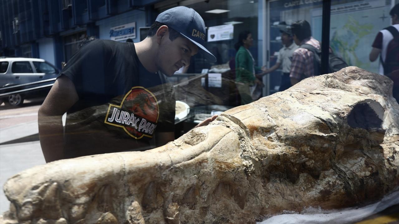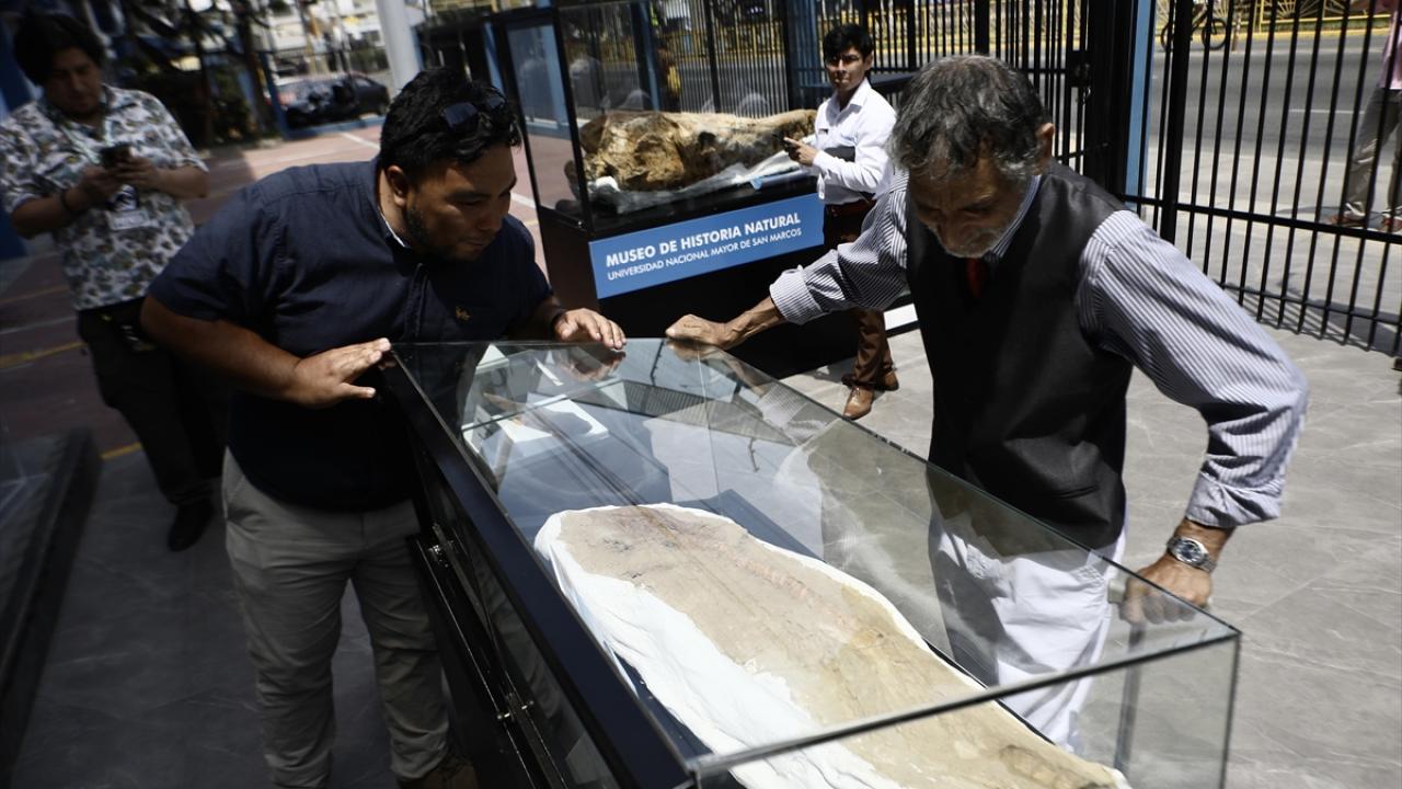 Peru'nun Lima kentinde bulunan 9 milyon yıllık olduğu belirtilen soyu tükenmiş geniş diş beyaz bir köpek balığı fosili Jeoloji, Madencilik ve Metalurji Enstitüsü'nde sergilendi.