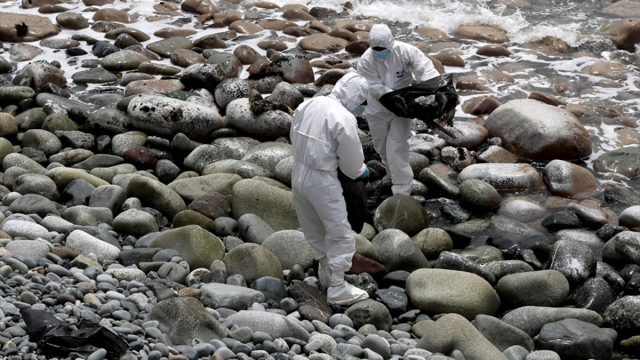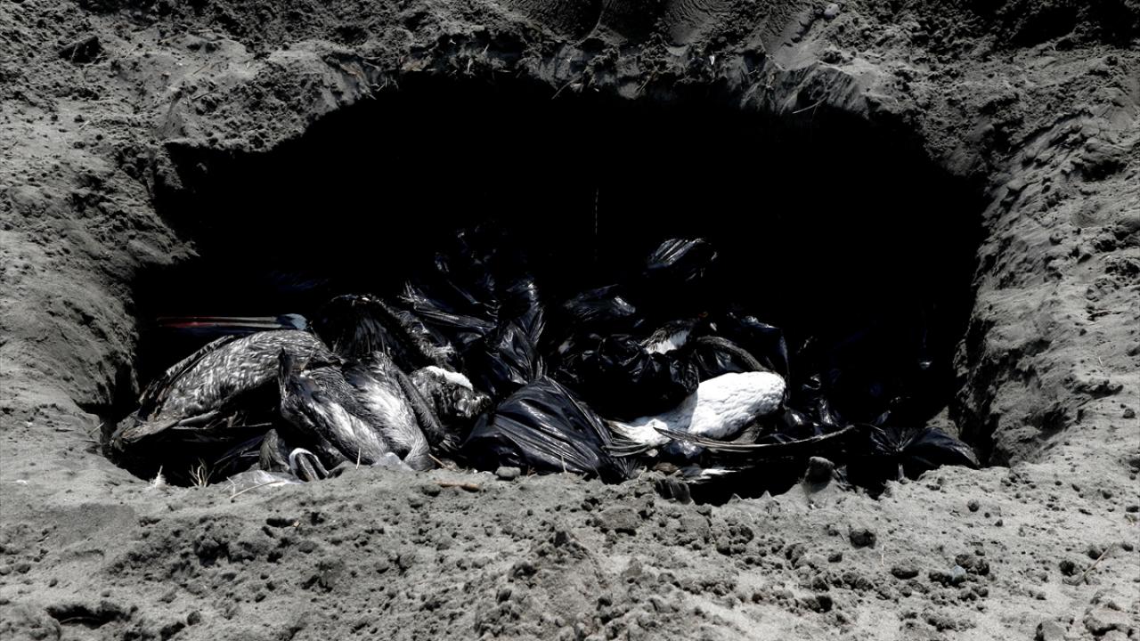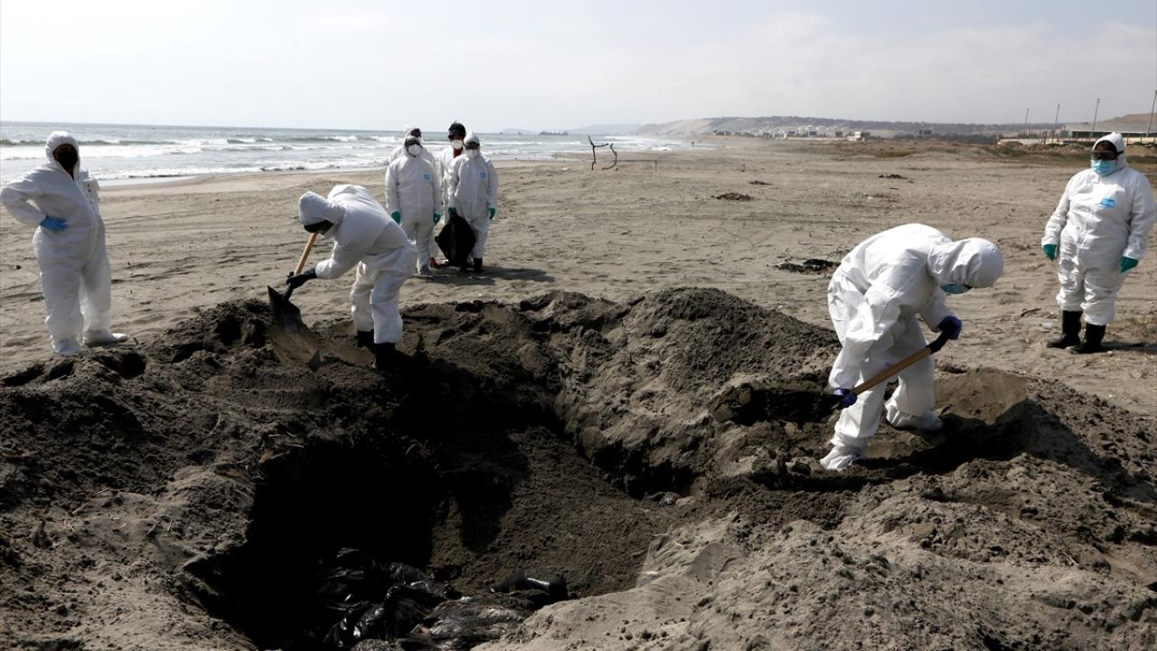 Lima`nın güney sahillerinde görülen toplu pelikan ölümlerinin ardından harekete geçen özel kıyafetli Ulusal Tarım Servisi (SENESA) ekibi, topladıkları pelikanları poşetlere doldurduktan sonra dev bir çukura gömerek H5N1 şüphesine karşı önlem aldı.