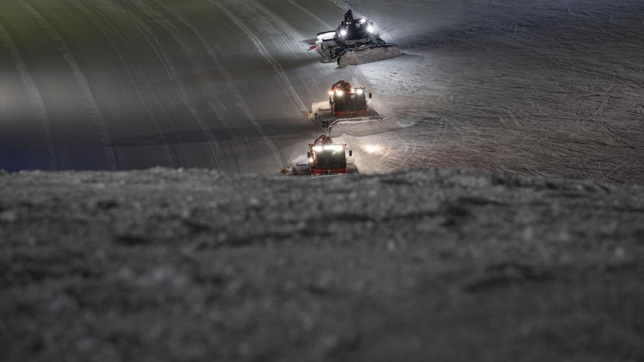 Snowtrack araçları zemindeki karı eşit şekilde yayıp sıkıştırırken, pistlerdeki ufak pürüzler ve tehlikeli bölgeler dikkatle kontrol ediliyor.
