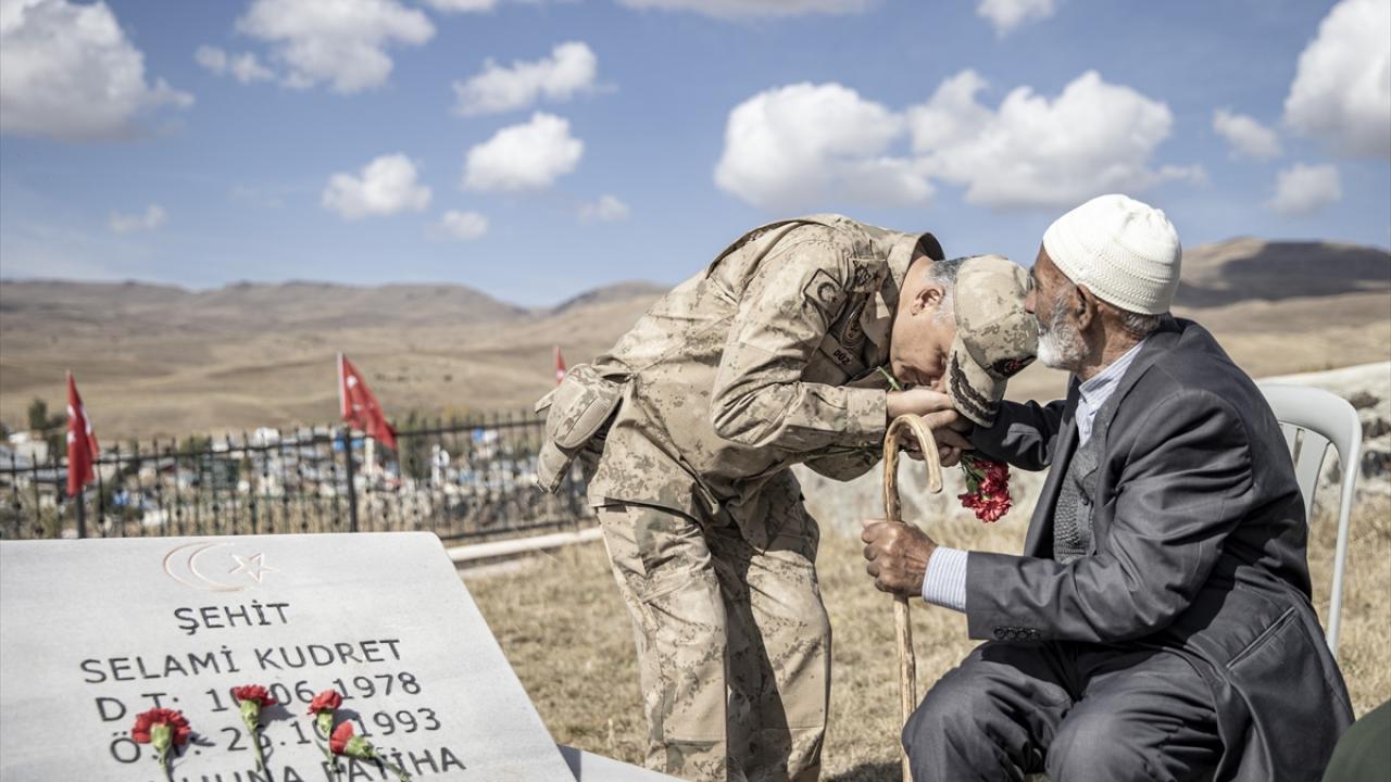 İl Jandarma Komutanı Tuğgeneral Metin Düz, mezar başında ağlayan 74 yaşındaki şehit yakını Zeki Gürcüoğlu`na sarılıp teselli etti.