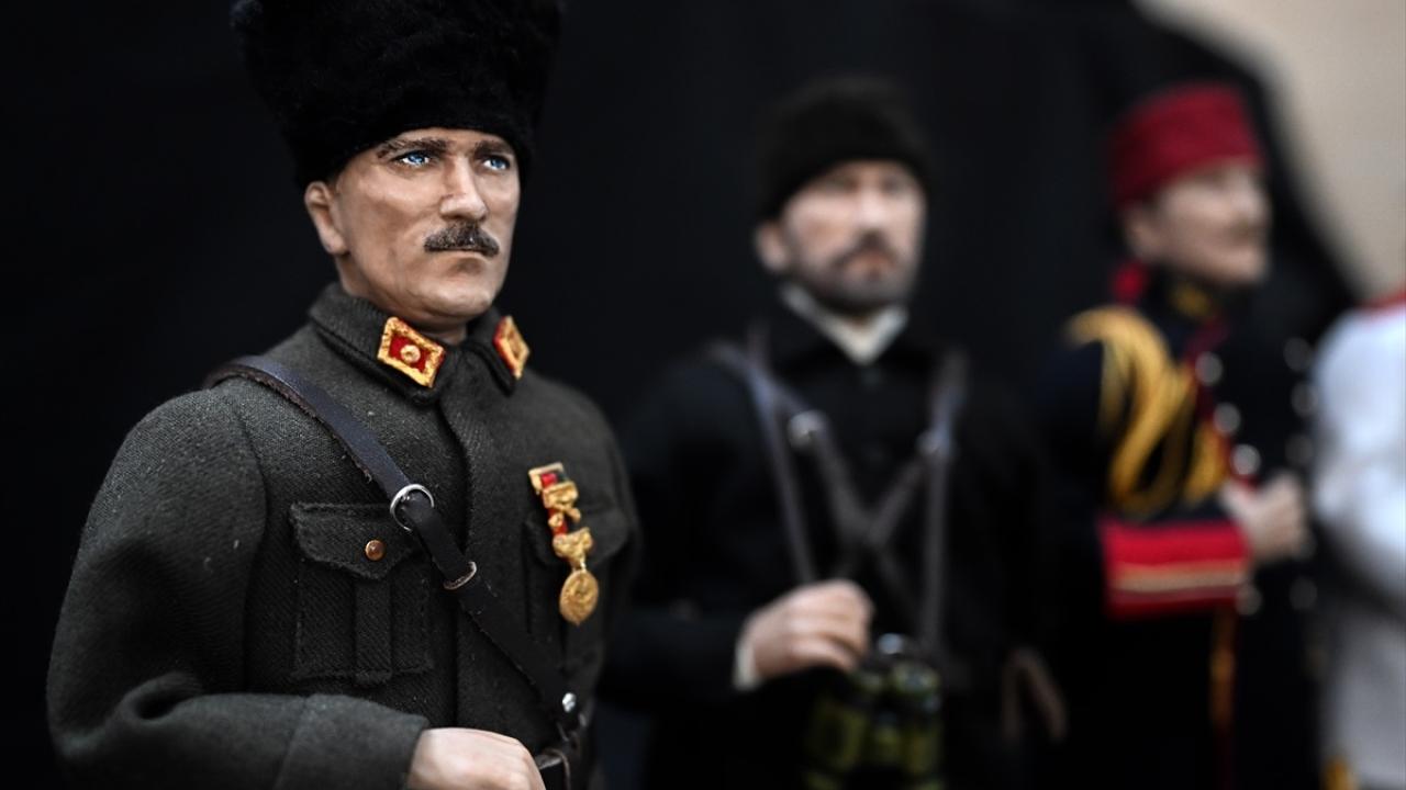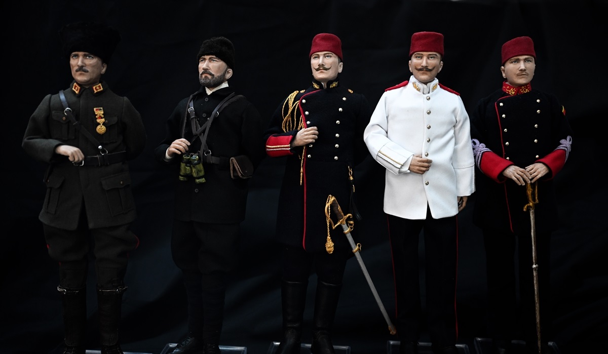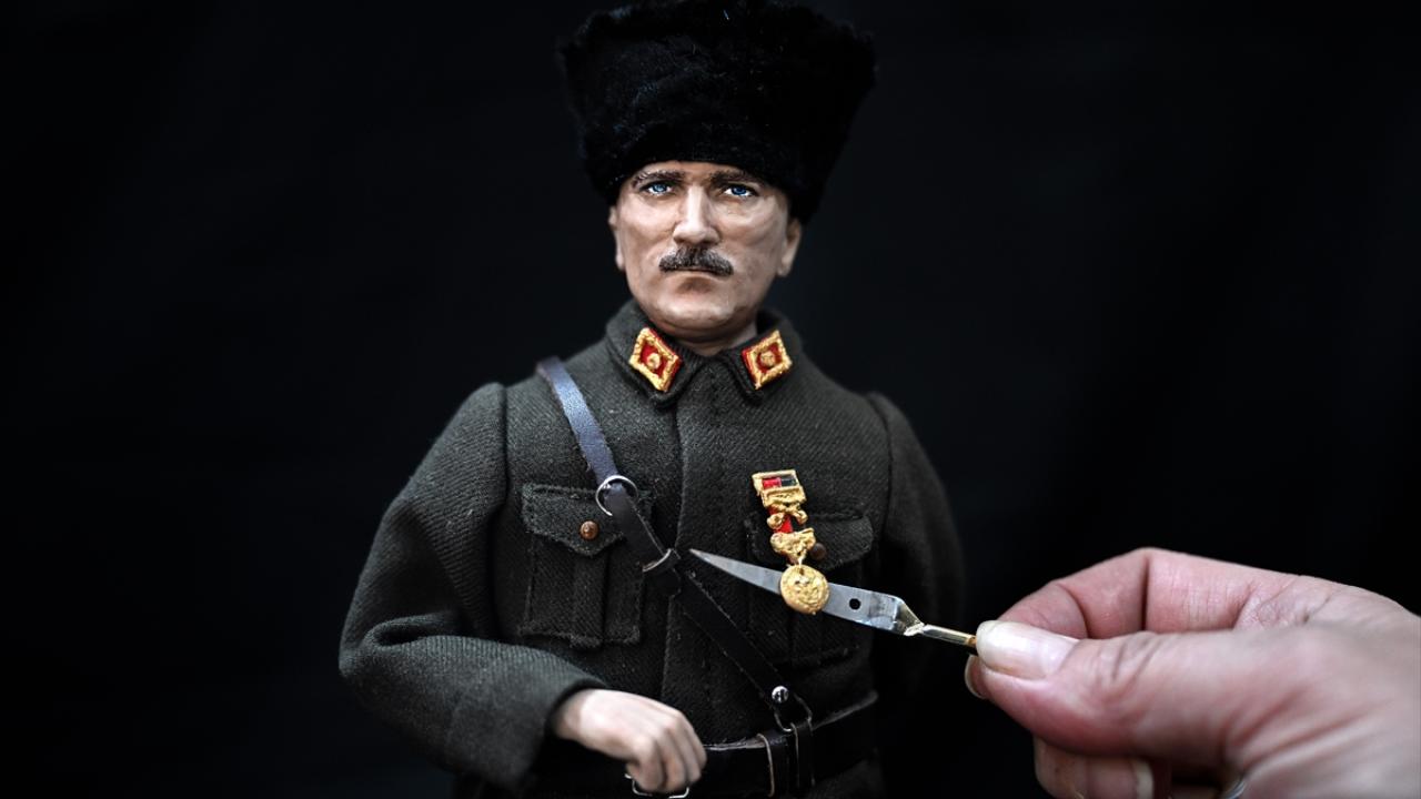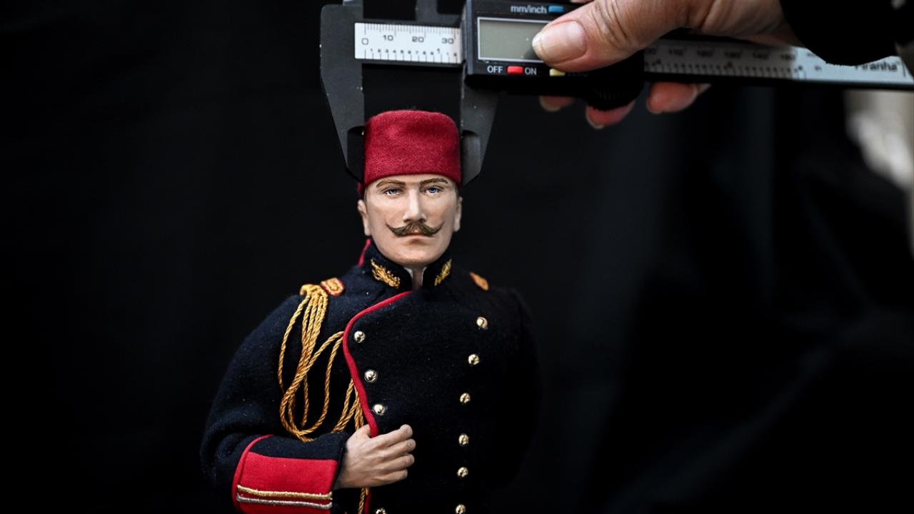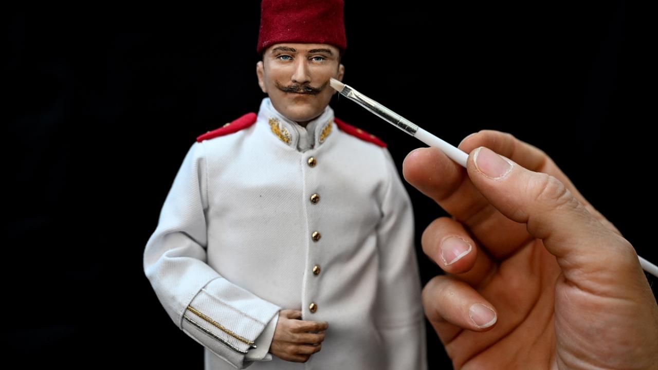 "Atatürk serisini yaş kronolojisine göre çalışıyorum. Harbiyeli Mustafa Kemal, Kurmay Yüzbaşı Mustafa Kemal, Trablusgarp Savaşı`ndaki Mustafa Kemal şeklinde çalıştım. Genç hallerinden çok fotoğrafa ulaşamadım ama yaş ilerledikçe fotoğraflarını bulmak daha da kolaylaşıyor. Atatürk serisi 12 eserden oluşacak. Kıyafetlerin birebir aynısı olmasına çalışıyorum. Artan malzemeleri kullanıyorum, geri dönüşümcüyümdür. Diğer ürettiğim minyatürlerde düğmeleri atık deterjan kutularından yapmıştım. Gören herkes `3D yazıcıdan mı çıkardın?` diyor. Biraz anatomi bilmek gerekiyor. Bir kalıbım yok, fotoğrafa bakarak çalışıyorum."