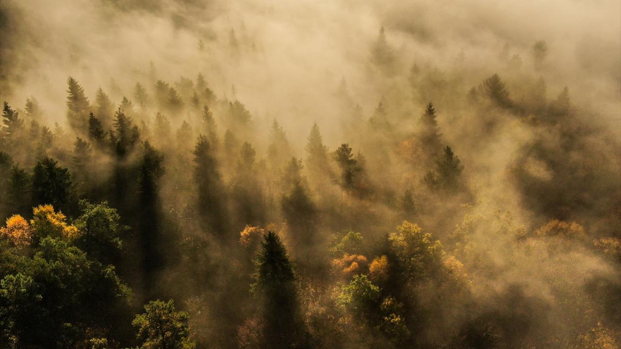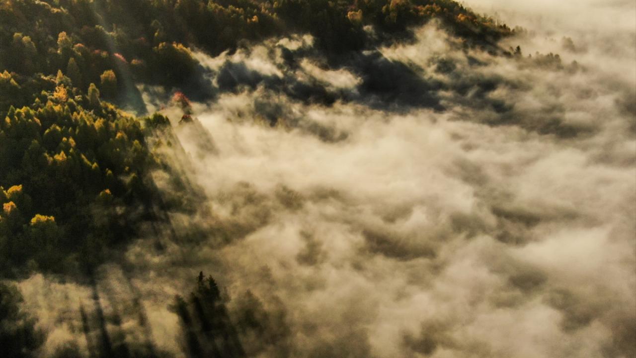 Kentte ormanlık alandaki ağaçlar sabah sisi ve gün doğumu ışığı altında havadan görüntülendi.