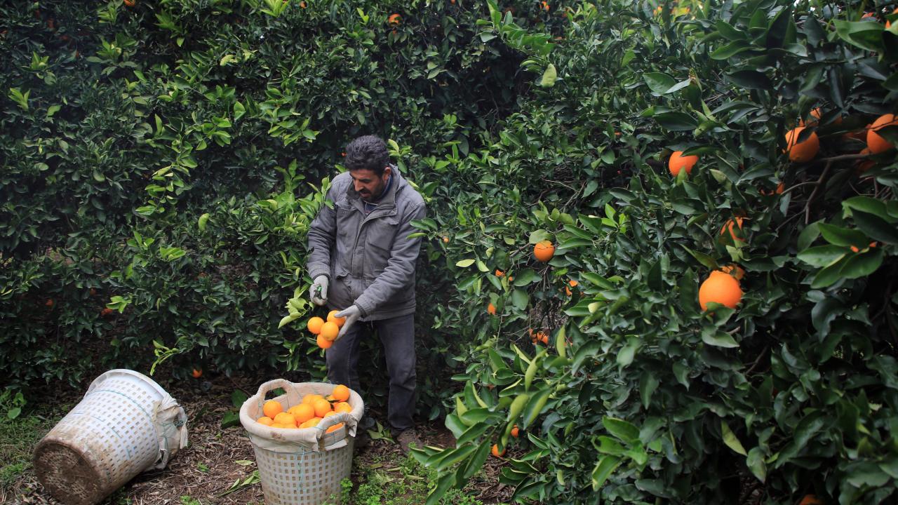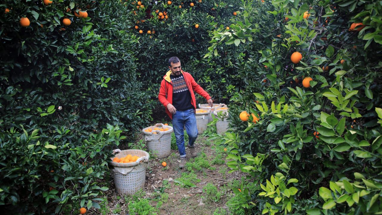 İşçiler tarafından toplanan portakallar, kasalara yerleştirilerek yurt içi ve dışına gönderilmek üzere kamyonlarla turunçgil tesislerine getiriliyor.