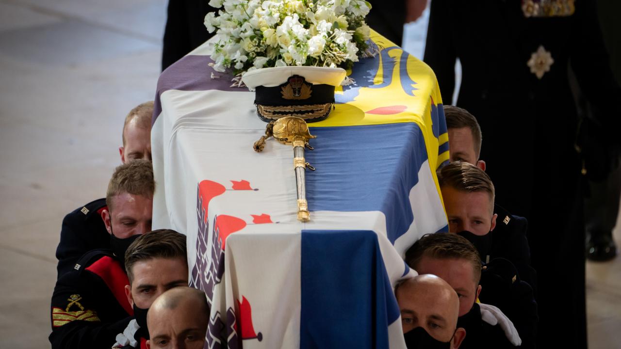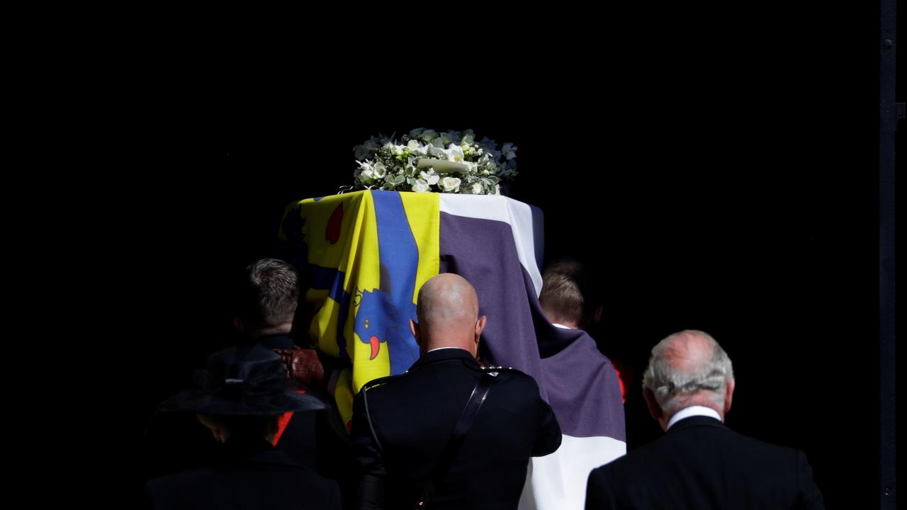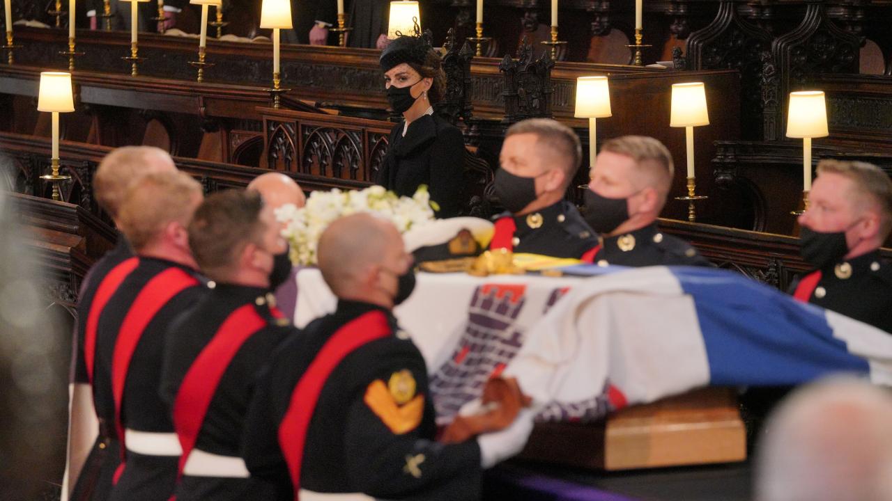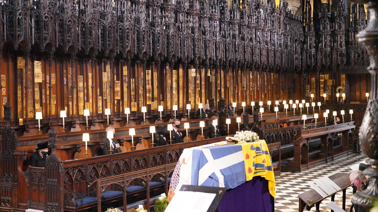 Cenaze aracı, saat 14.53`te Prens Philip`in defnedileceği Saint George Şapeli`ne vardı. Tabutun üzerine Prens Philip`in donanma şapkası ve törenlerde kullanılan donanma subayı kılıcı konuldu.