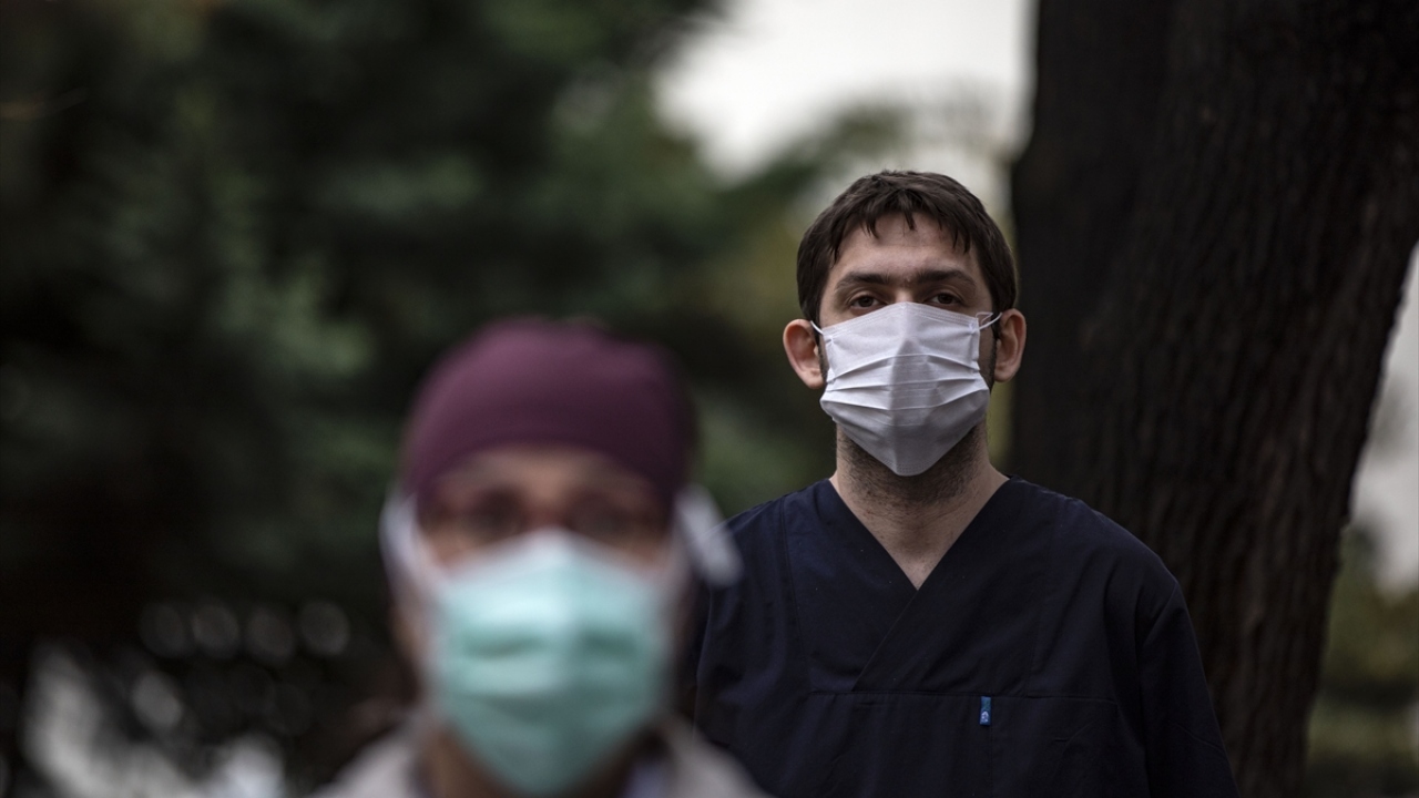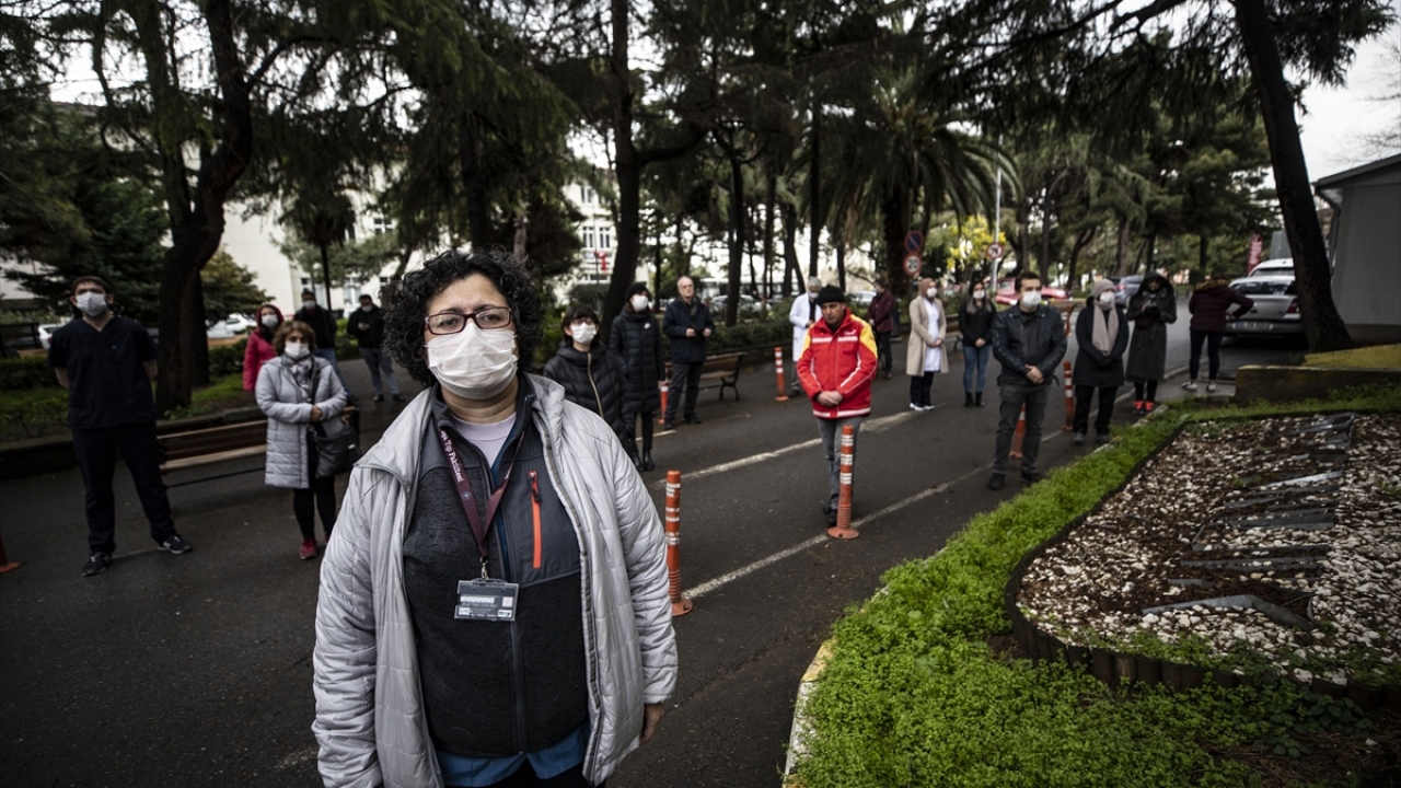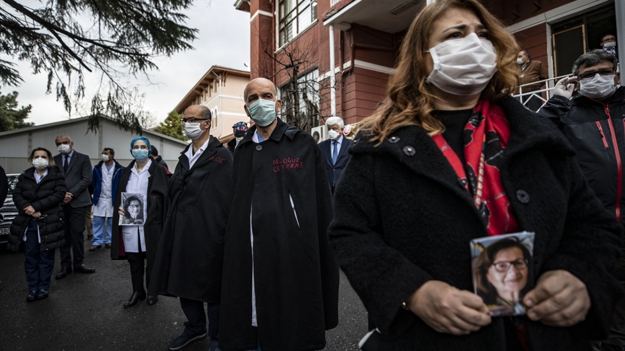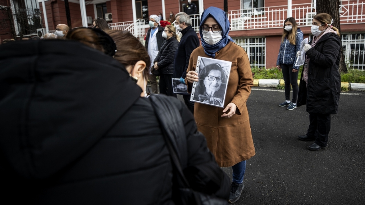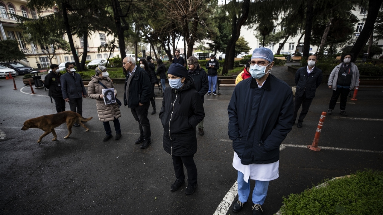 Öz’ün fotoğraflarını taşıyan doktorlar ve sağlık çalışanları, sosyal mesafeyi koruyarak saygı duruşunda bulundu.