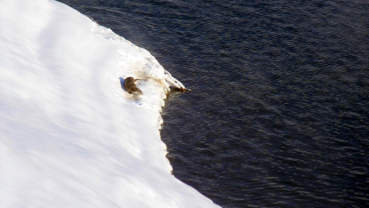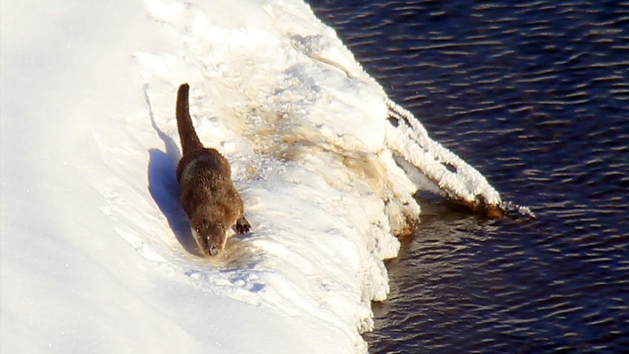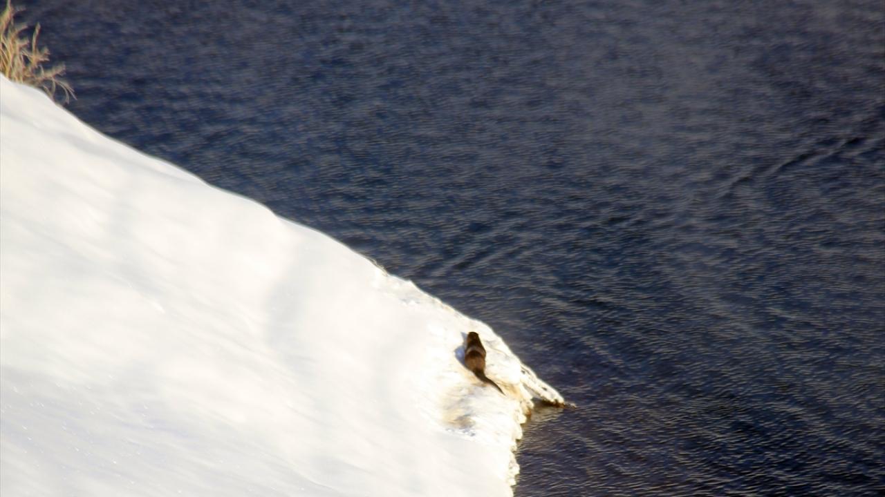 Soğuk havanın etkisiyle kısmen donan barajın kıyısında, kar üzerinde güneşlenen su samuru da görüntülendi.