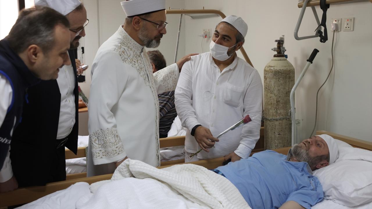 Erbaş, hasta hacı adaylarına geçmiş olsun dileğinde bulundu, gül verdi.