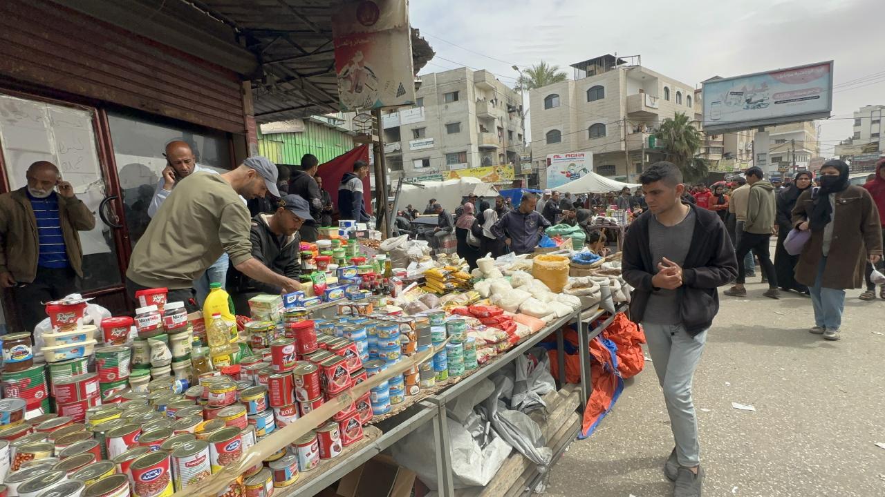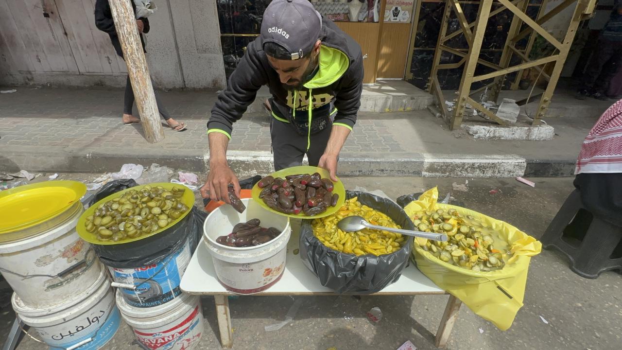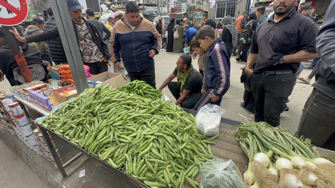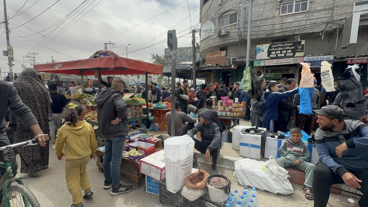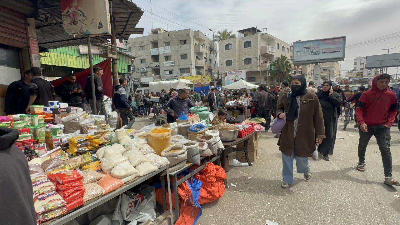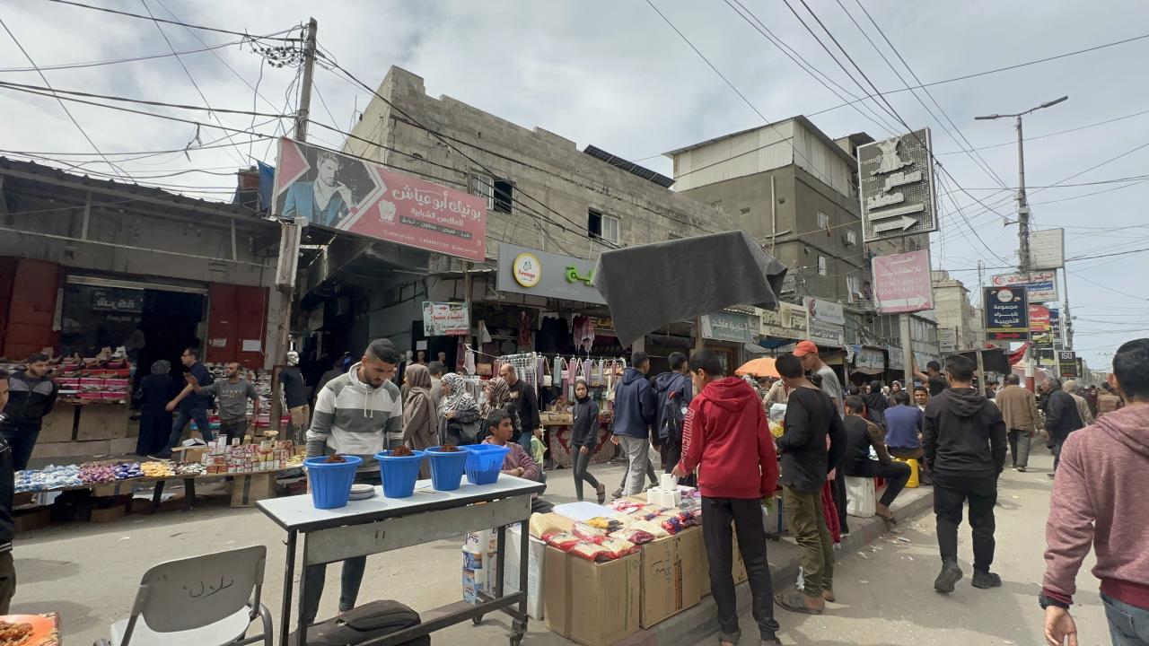Ramazan ayında Refah kenti sokaklarında kurulan bir pazarda, pazarcılar, ellerinde kalan az sayıdaki yiyecek ve temel yaşam ihtiyaç ürünlerini satışa çıkardı.