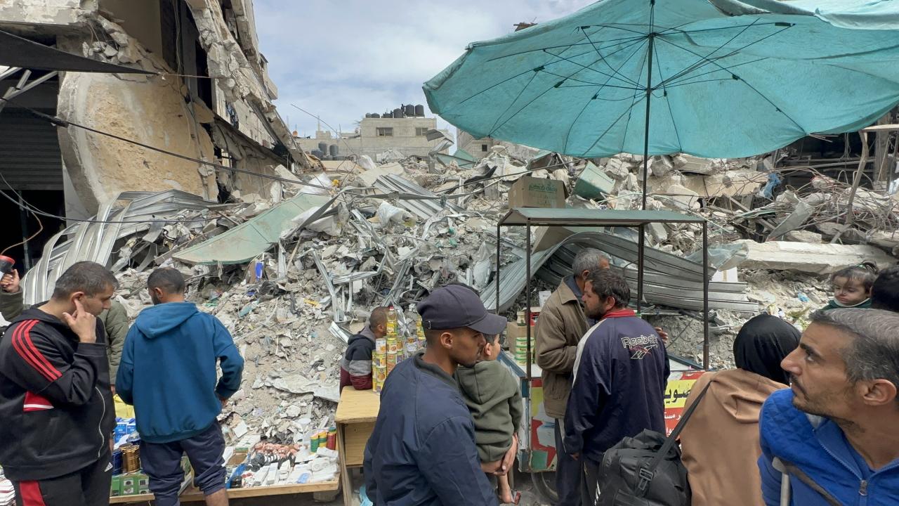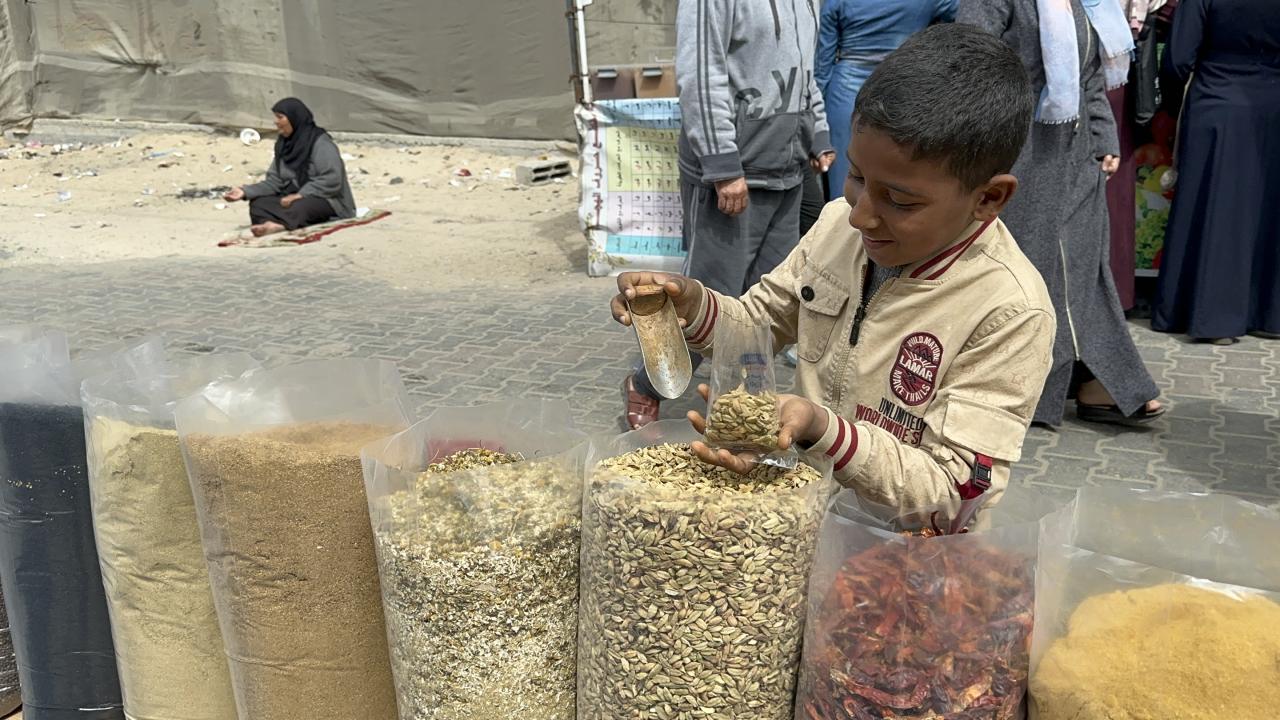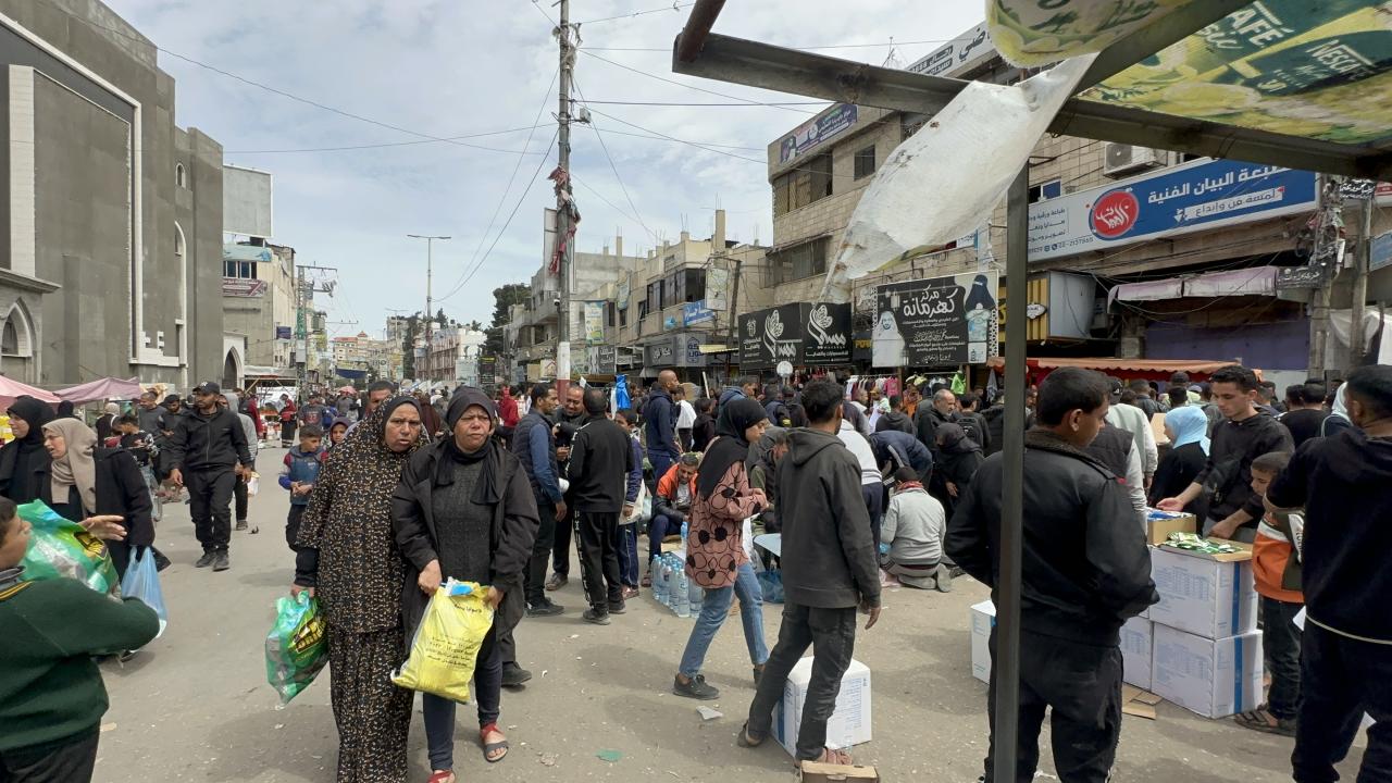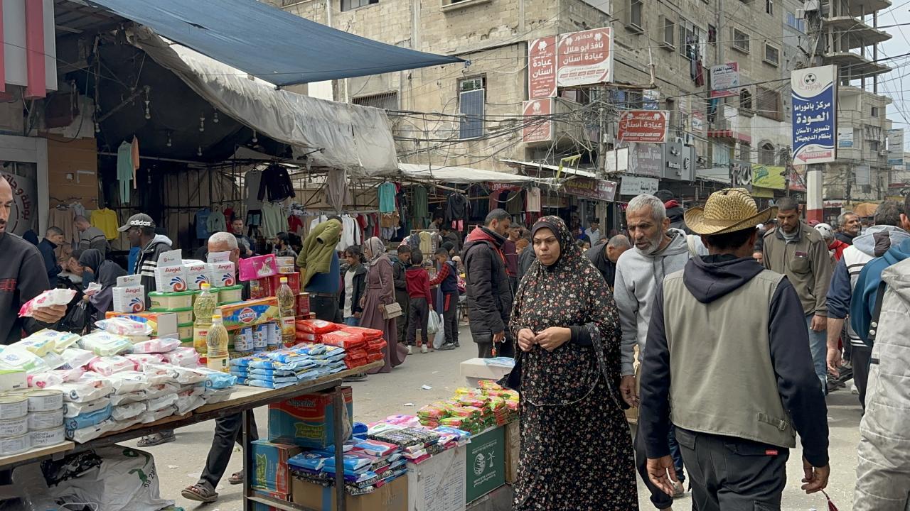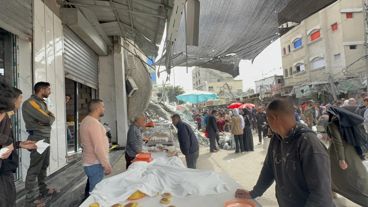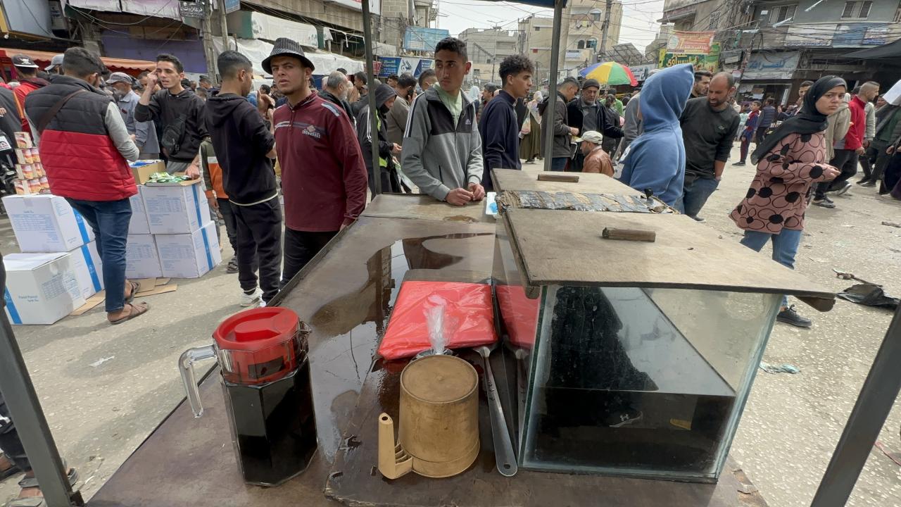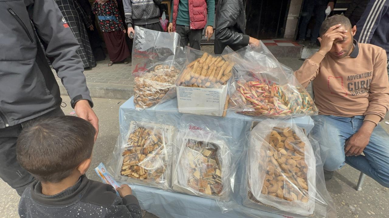 Ramazan ayında Refah kenti sokaklarında kurulan bir pazarda, pazarcılar, ellerinde kalan az sayıdaki yiyecek ve temel yaşam ihtiyaç ürünlerini satışa çıkardı.