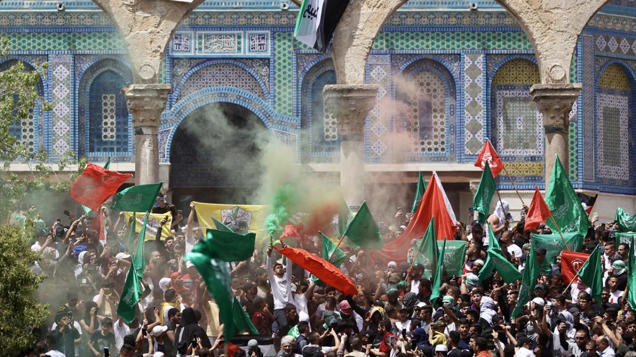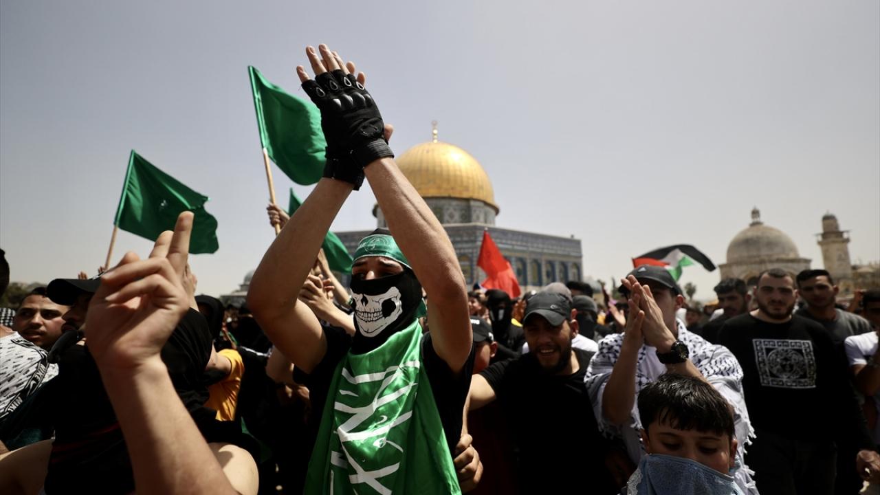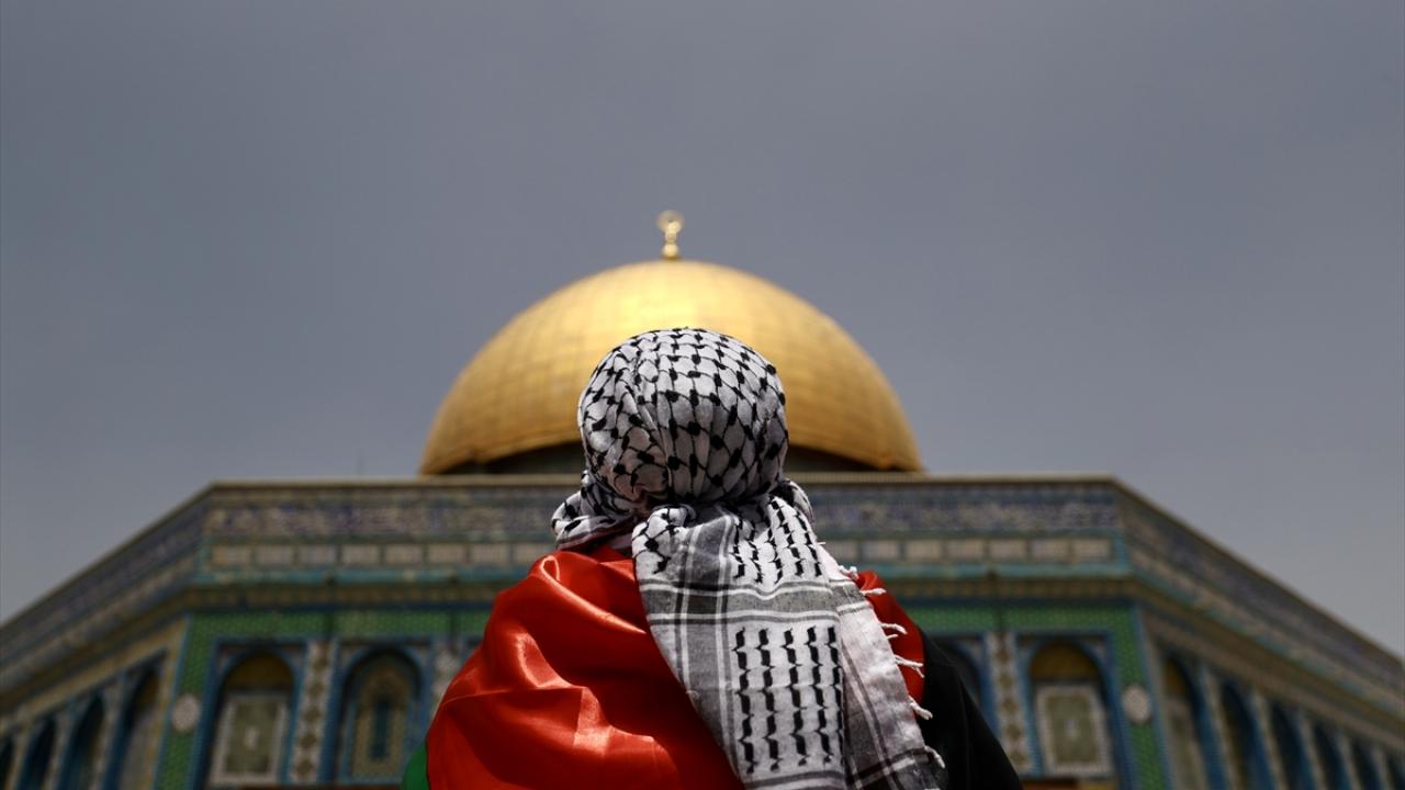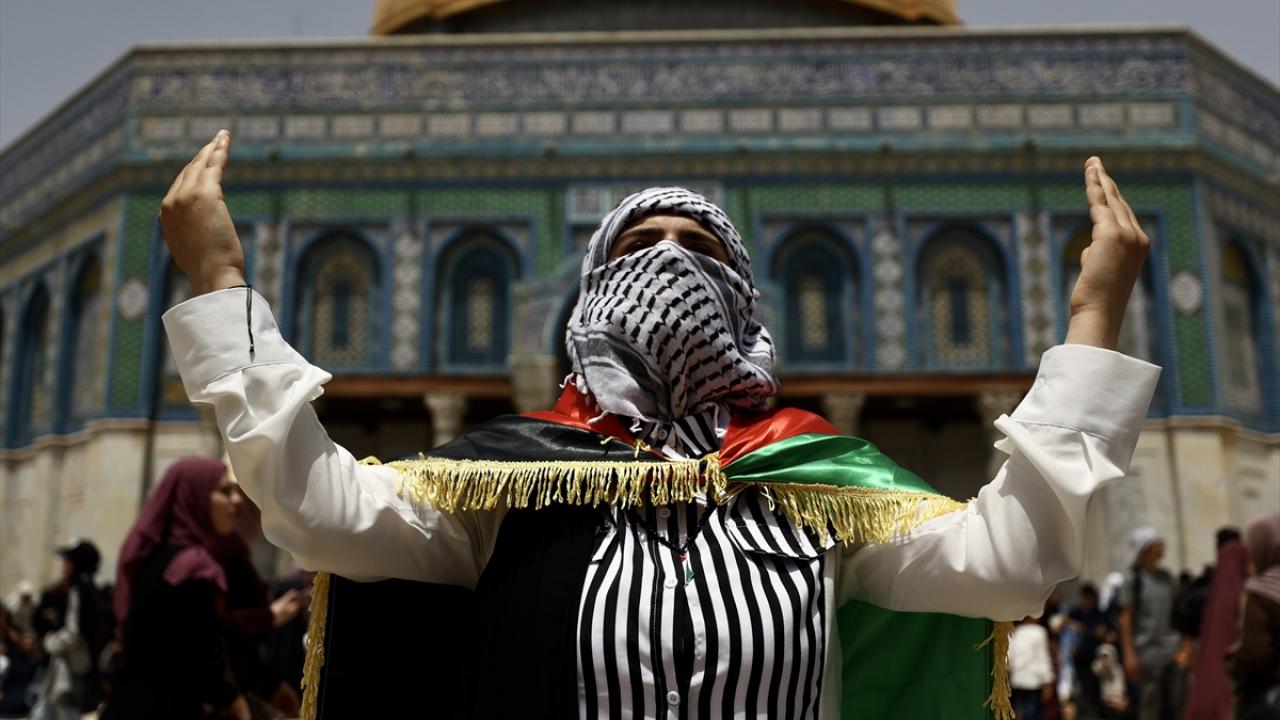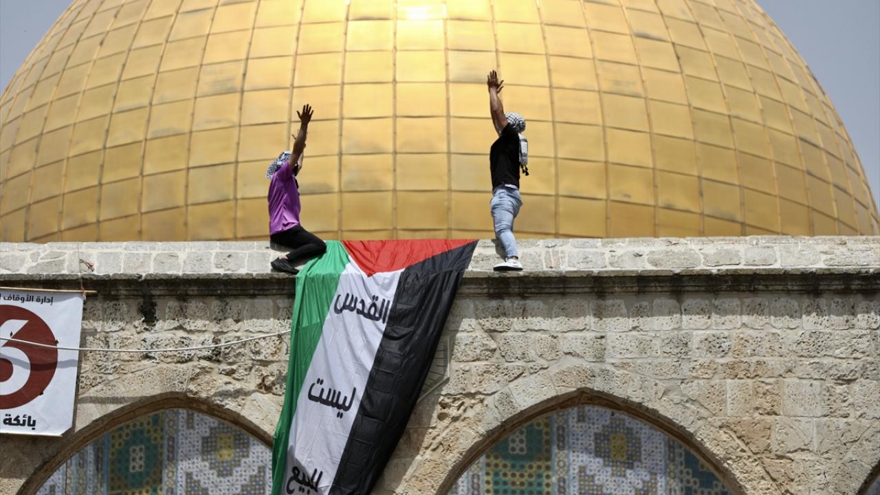 Namazdan sonra bazı Filistinli gruplar, Kubbetu`s Sahra Camii`nin merdivenlerinde Filistin bayrağı açarak slogan attı.