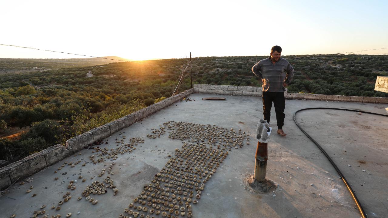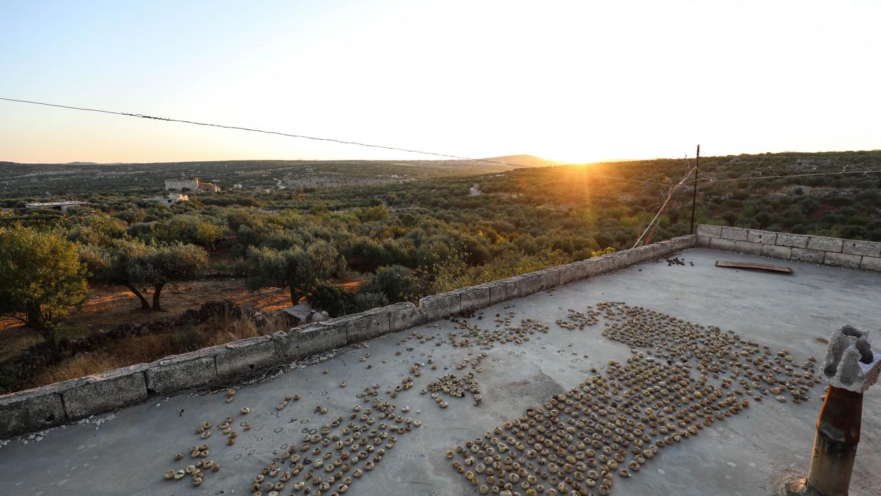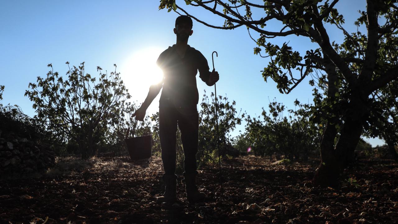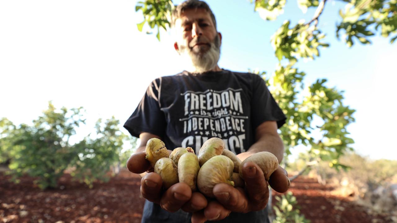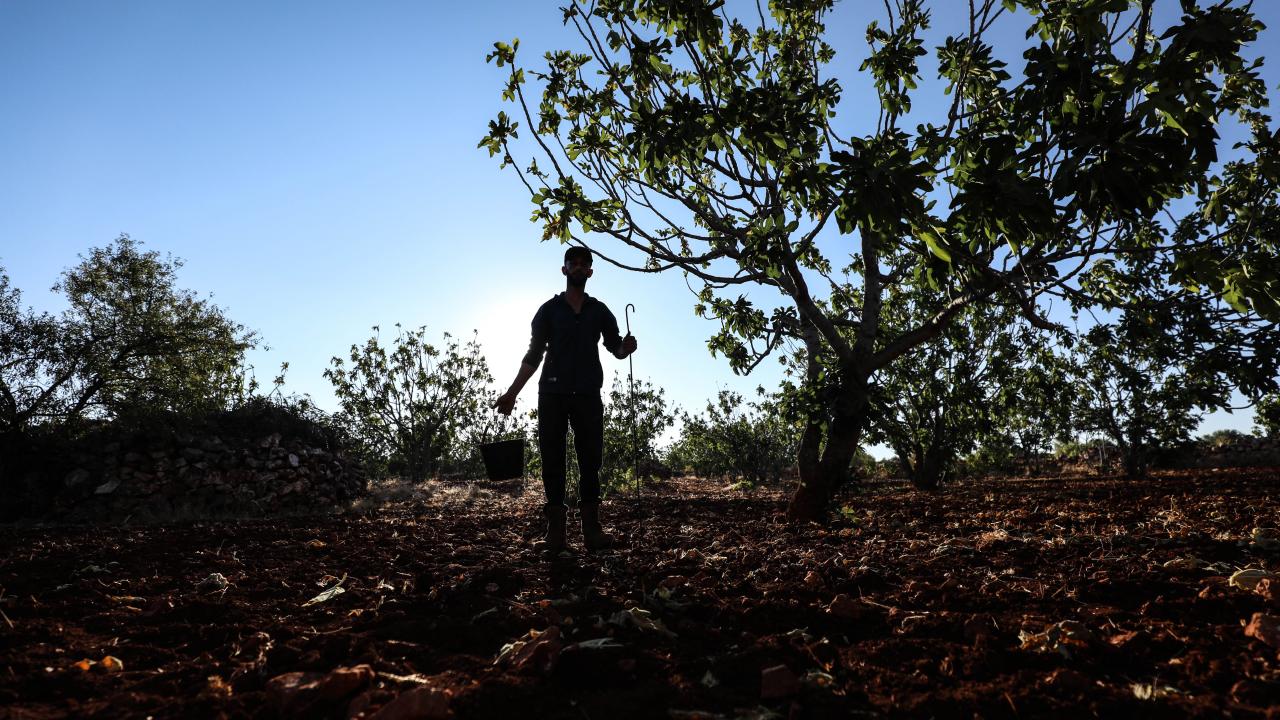 Suriye'de İdlib'in güney kırsalında zorla yerinden edilen çiftçiler, Beşşar Esed rejiminin ateşkesi ihlal ederek düzenlediği saldırılara rağmen incirlerini hasat ediyor.