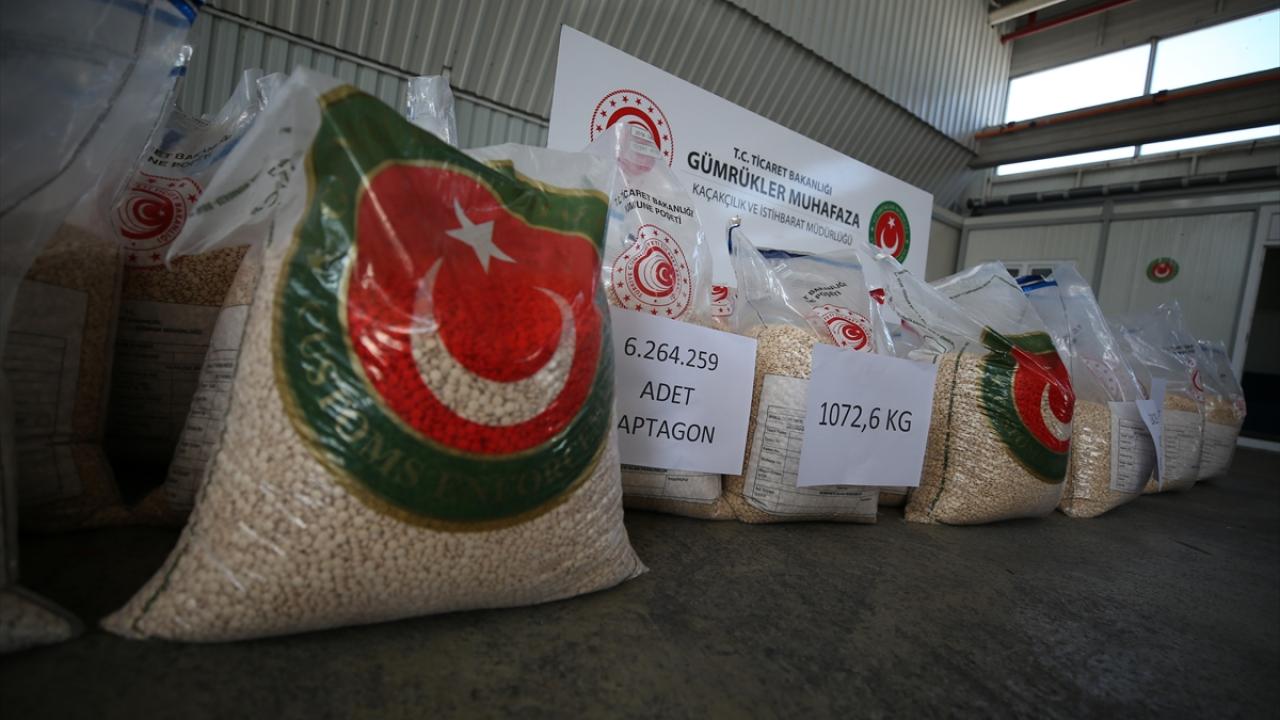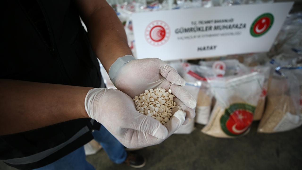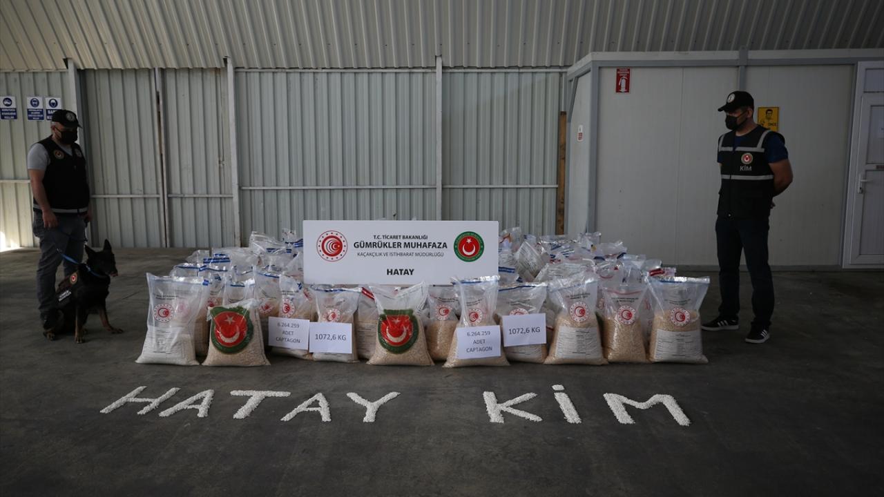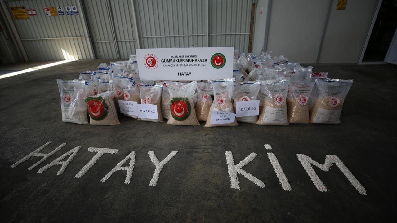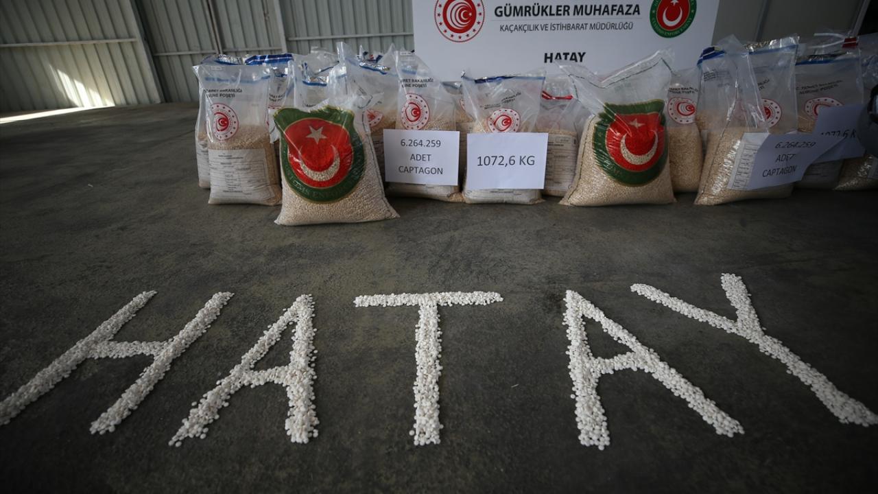 Hatay Gümrük Kapısı'nda dün, piyasa değeri 313 milyon lira olan ve bugüne kadarki en yüksek miktarlı "Captagon" cinsi uyuşturucu hap ele geçirildi. Uyuşturucu haplar, gümrüğe ait bir depoda basın mensuplarına gösterildi.
