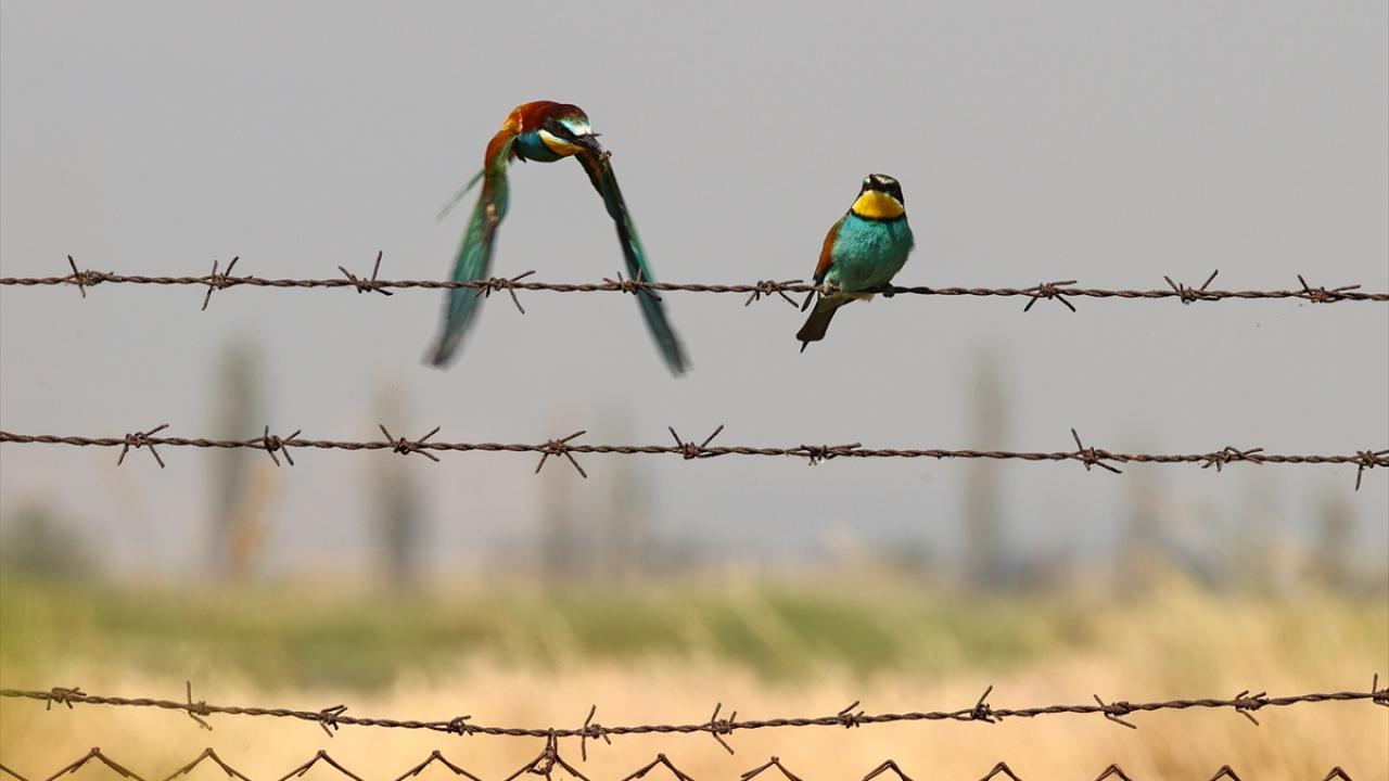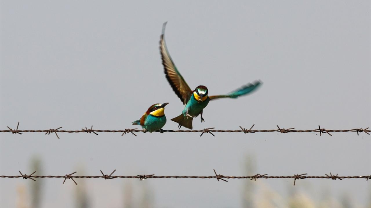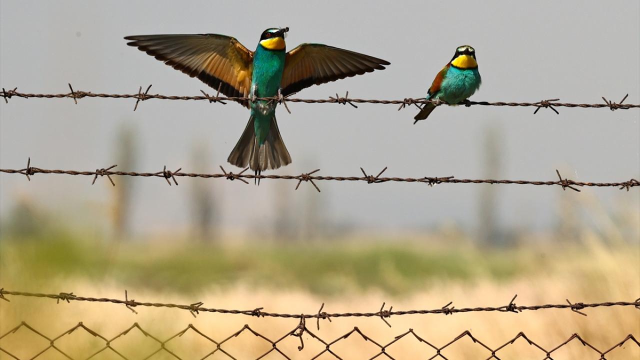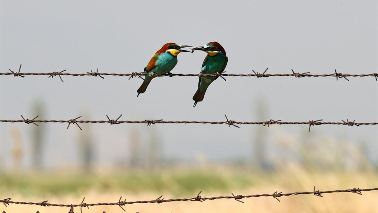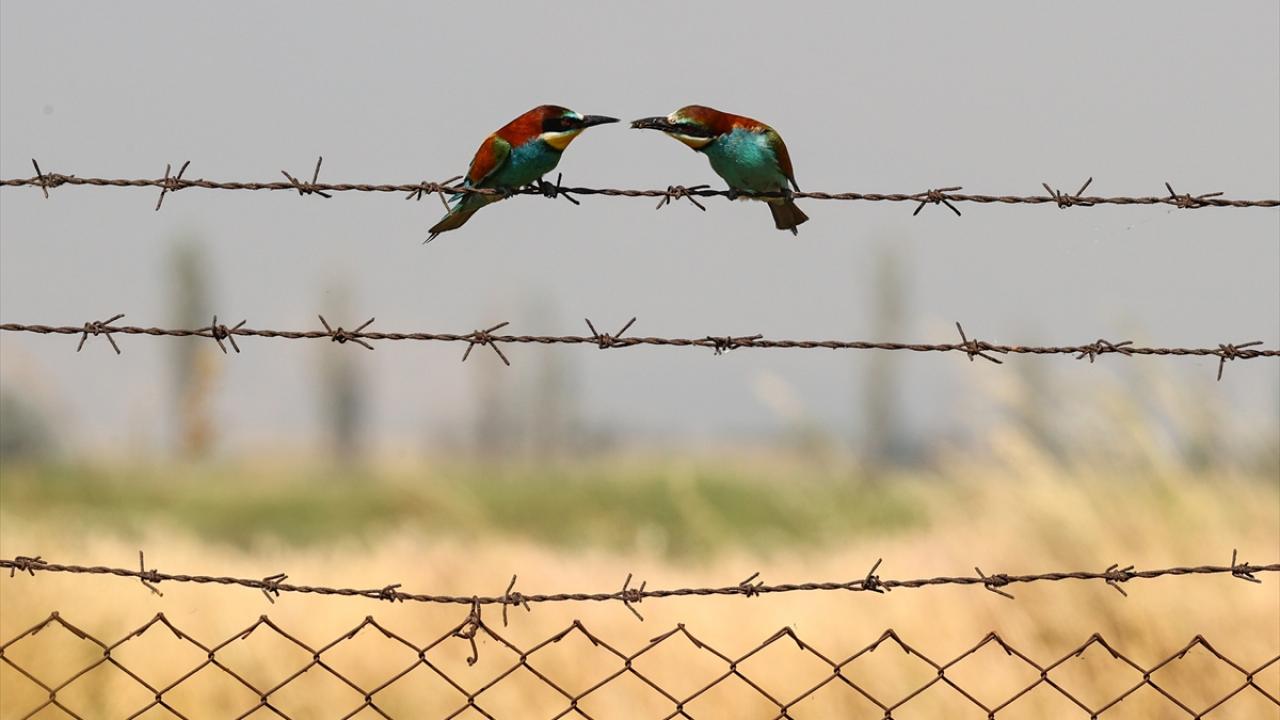 Temel besin kaynağı arılar olduğu için halk arasında 'Arı Kuşu' olarak adlandırılan Merops apiaster cinsi kuşların İzmir'in Çiğli ilçesinde Kuş Cenneti yakınındaki bir güvenlik telinin üstünde beslenme anları görüntülendi.