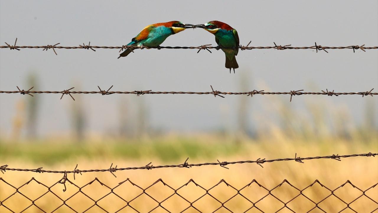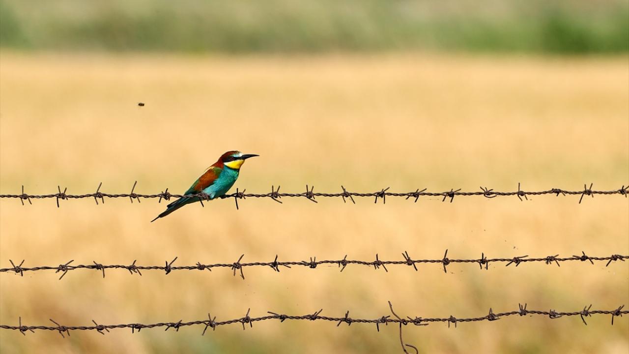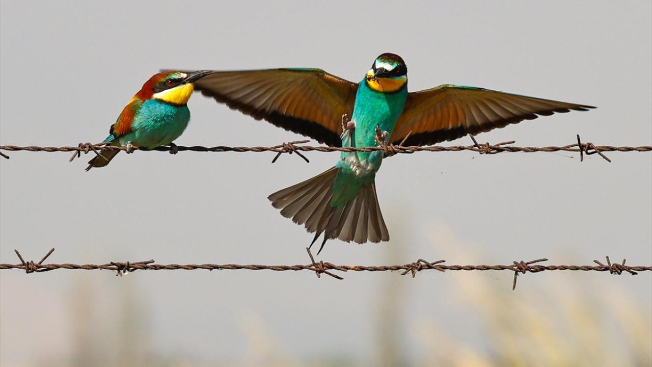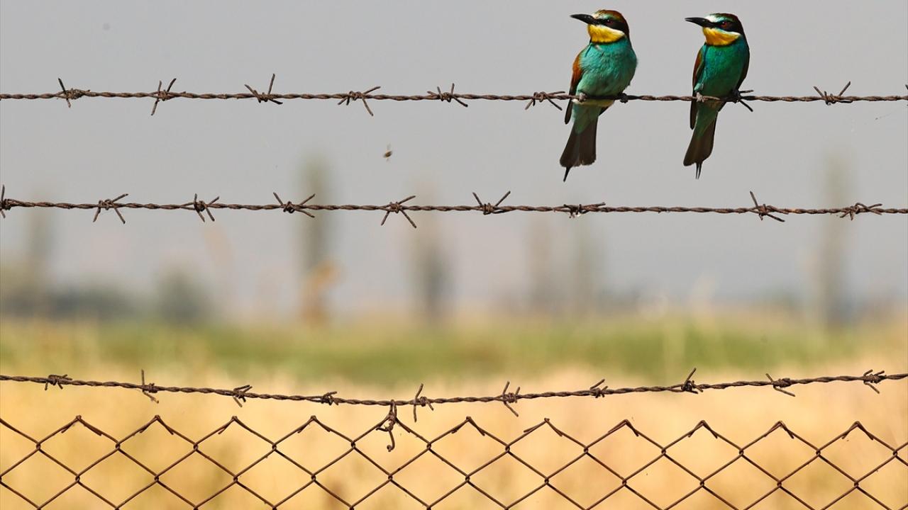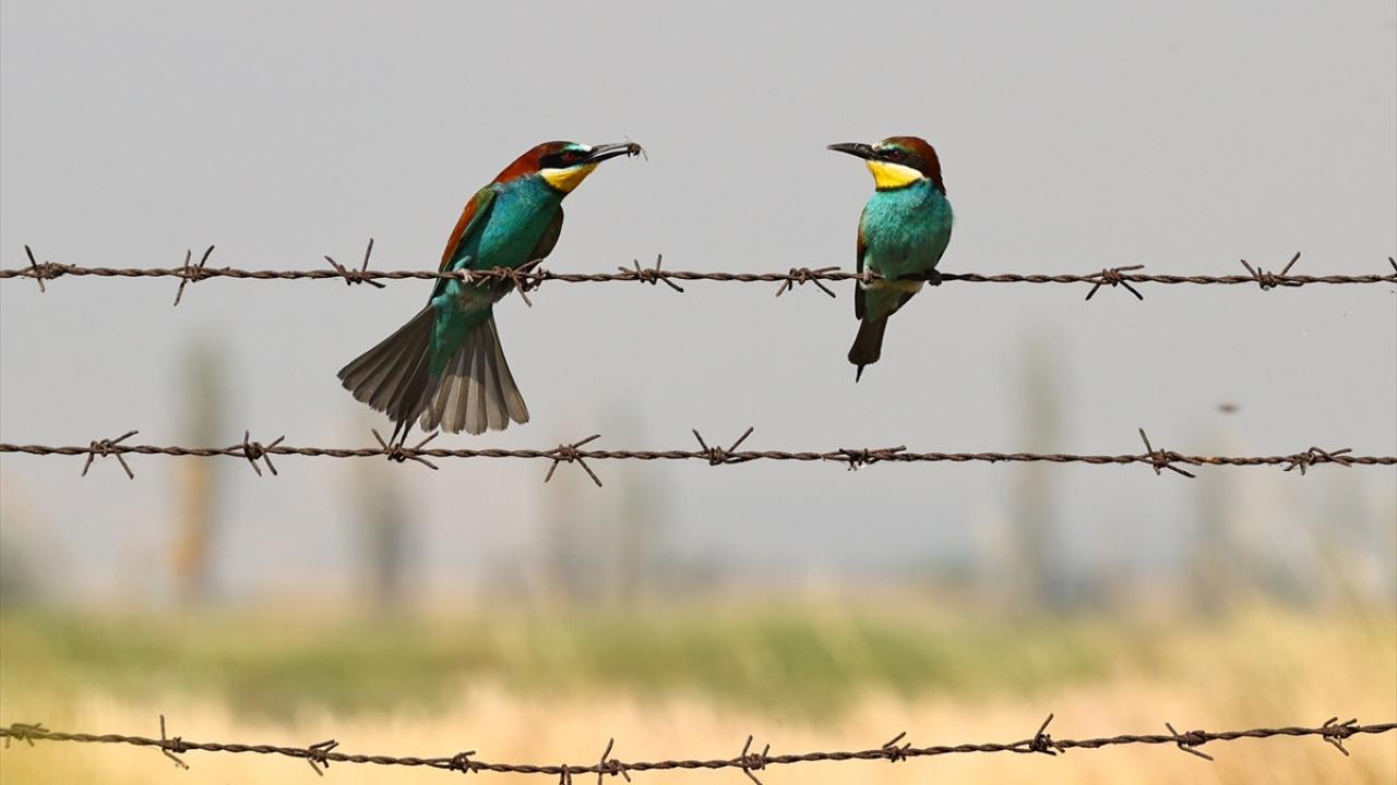 Temel besin kaynağı arılar olduğu için halk arasında 'Arı Kuşu' olarak adlandırılan Merops apiaster cinsi kuşların İzmir'in Çiğli ilçesinde Kuş Cenneti yakınındaki bir güvenlik telinin üstünde beslenme anları görüntülendi.