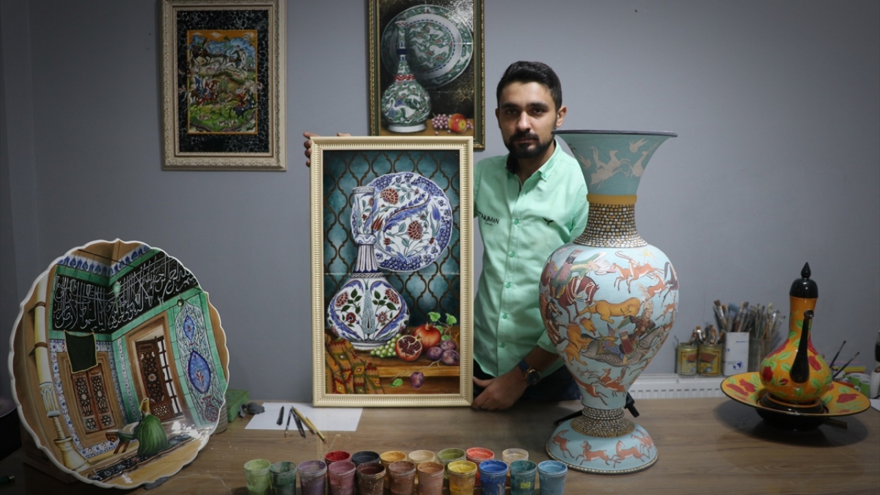 Kütahya'da el sanatları ustası ve ressam Ömer Numan Özyağman, tuval yerine çini ve seramiklere resim yapıyor.