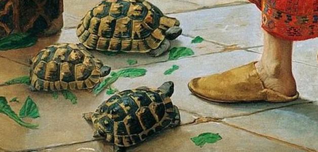 Osman Hamdi Bey, bu tabloda kendini terbiyeci, onun çalışma arzusuna ayak uyduramayan astlarını ise yemeğe ulaşmaya çalışan kaplumbağalar olarak betimledi.