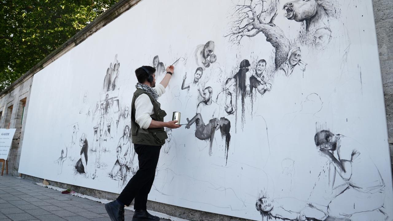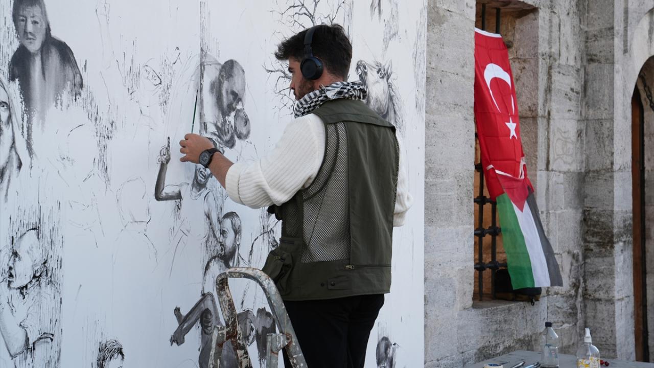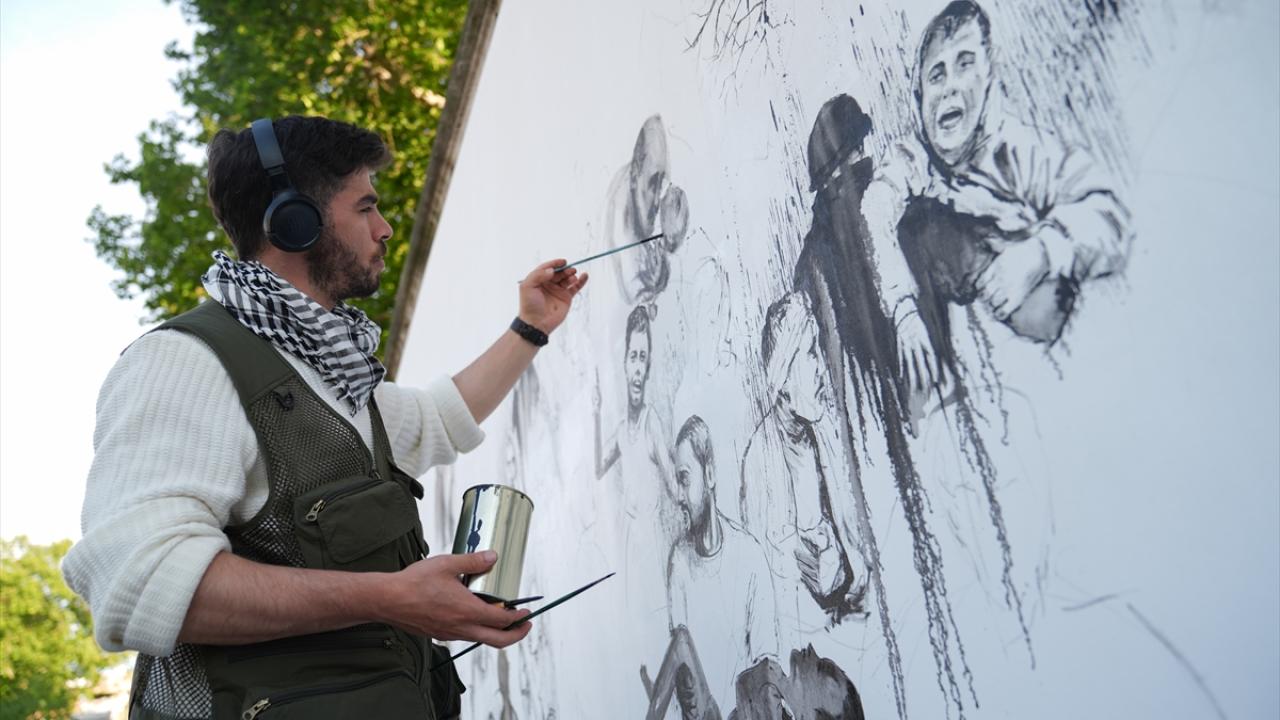 Üsküdar Valide-i Cedid Cami önünde, 9 metreye 3 metre boyutundaki "Gazze" adlı tablosunu yapan Tan, çalışmasıyla Filistinlilere destek olmayı amaçlıyor.