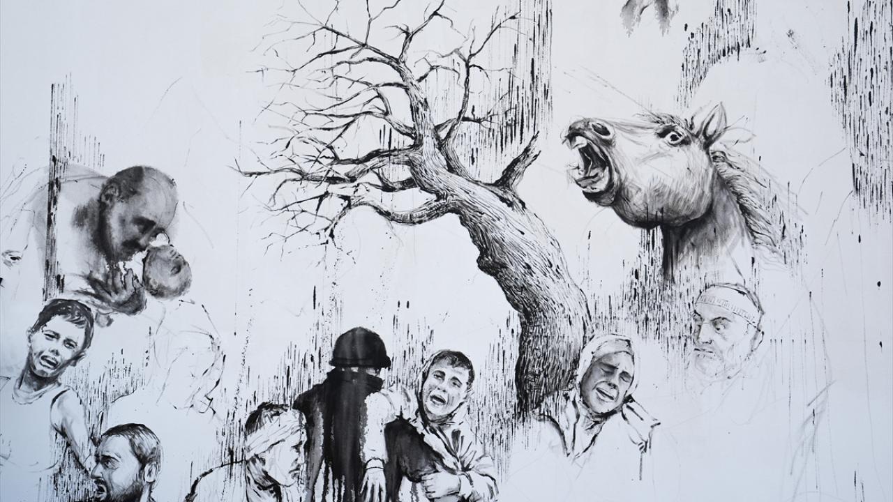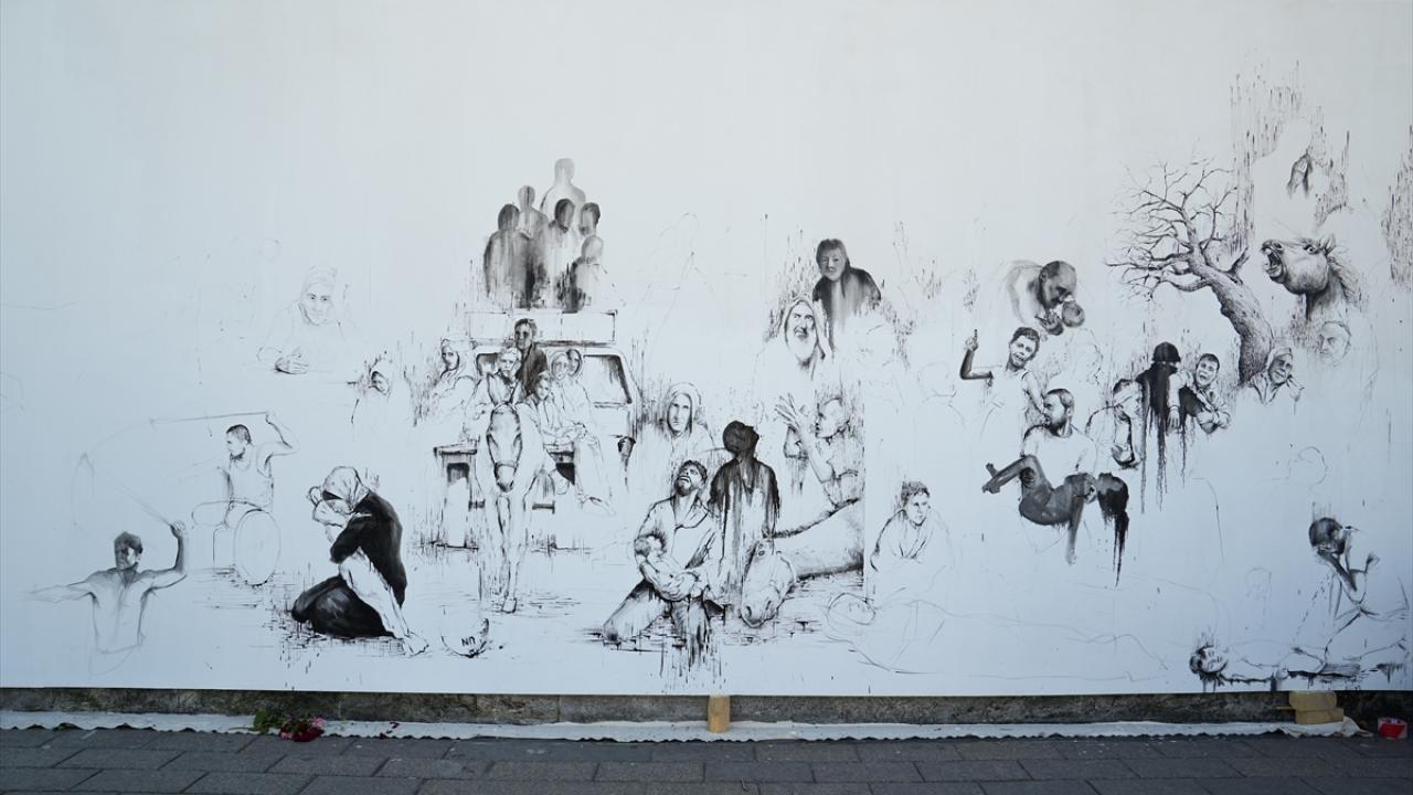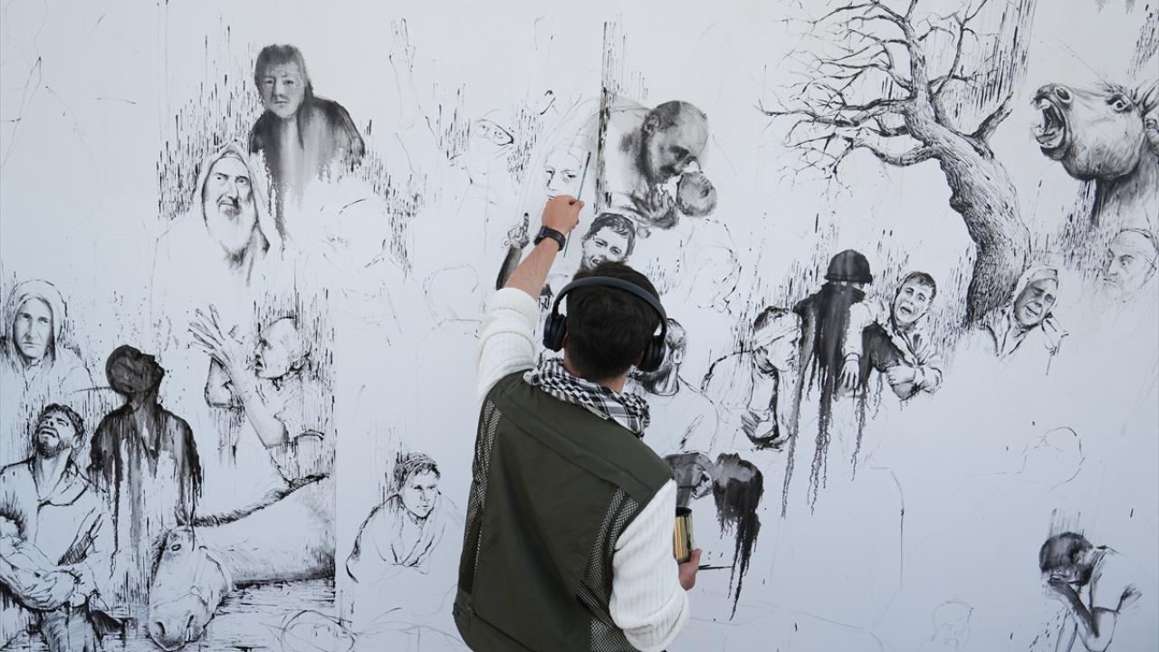 Eserinde, Pablo Picasso`nun "Guernico" tablosundan ilham alan Tan, yaptığı açıklamada, "Genç bir sanatçı olarak yaşanan dehşeti ifade etmek gibi bir kaygım vardı. Müftülük ile Vakıflar Genel Müdürlüğünden izin aldıktan sonra tuvalimizi hazırladık. Ardından buraya koyduk ve çizime başladım." dedi.