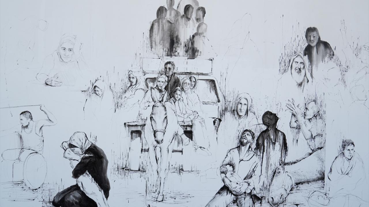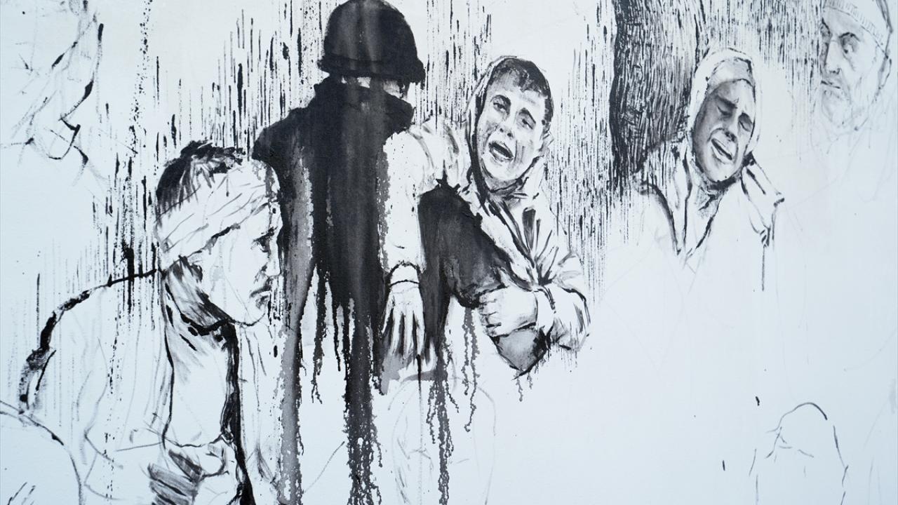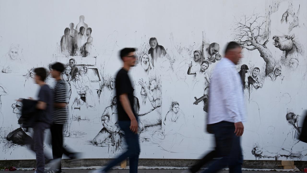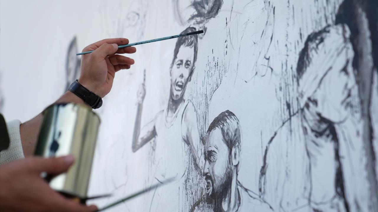 Eserinde, Pablo Picasso`nun "Guernico" tablosundan ilham alan Tan, yaptığı açıklamada, "Genç bir sanatçı olarak yaşanan dehşeti ifade etmek gibi bir kaygım vardı. Müftülük ile Vakıflar Genel Müdürlüğünden izin aldıktan sonra tuvalimizi hazırladık. Ardından buraya koyduk ve çizime başladım." dedi.