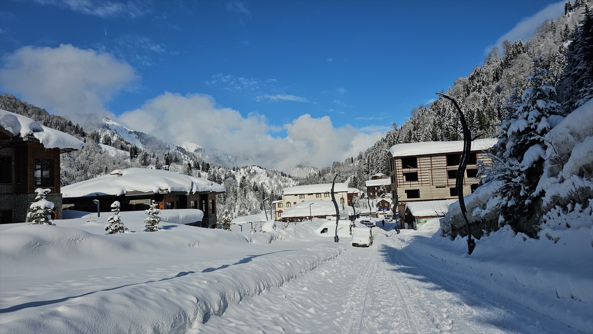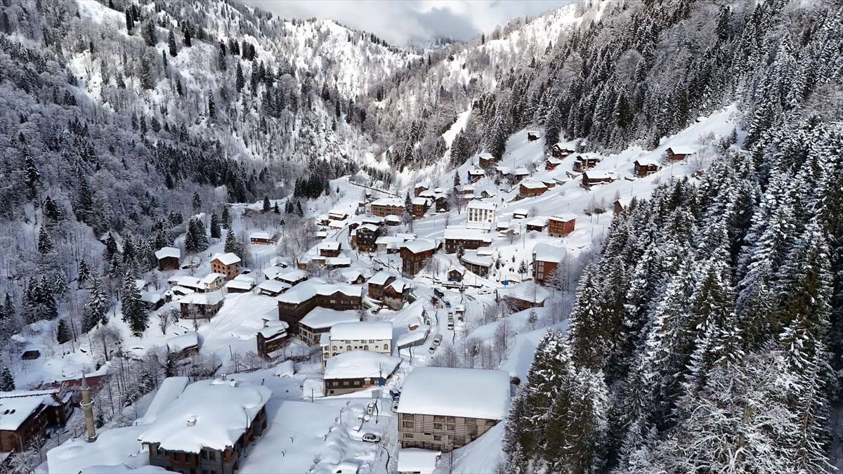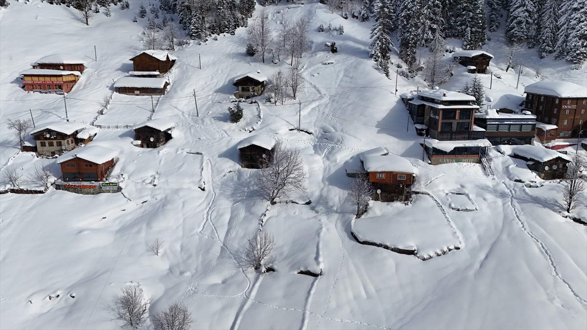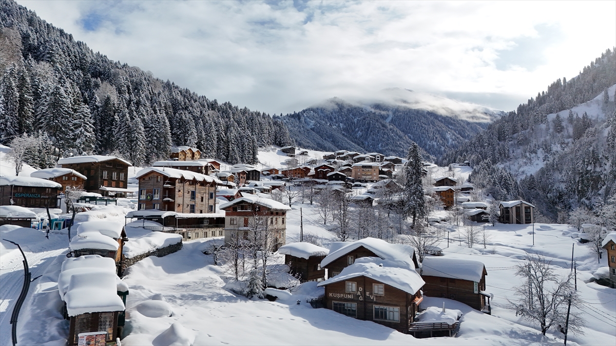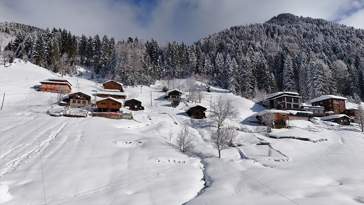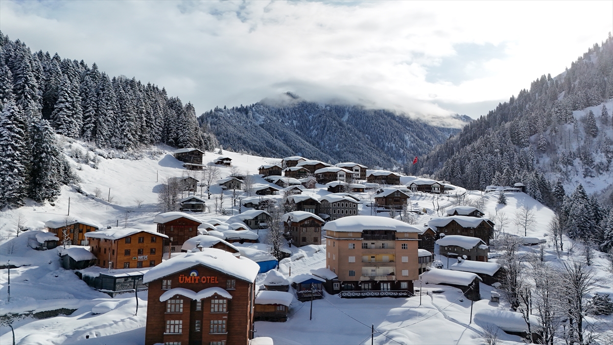 Rize'nin Çamlıhemşin ilçesindeki Ayder Yaylası'nın beyaz örtüyle kaplı hali dronla görüntülendi.
