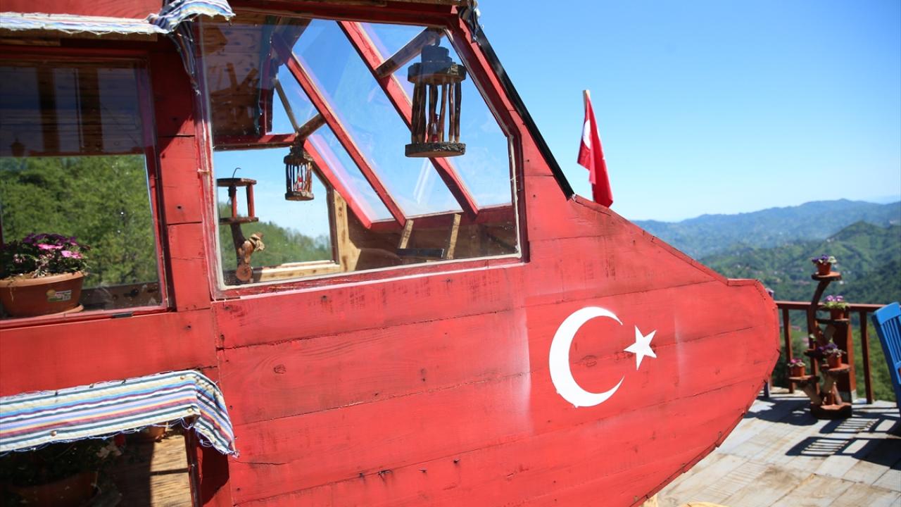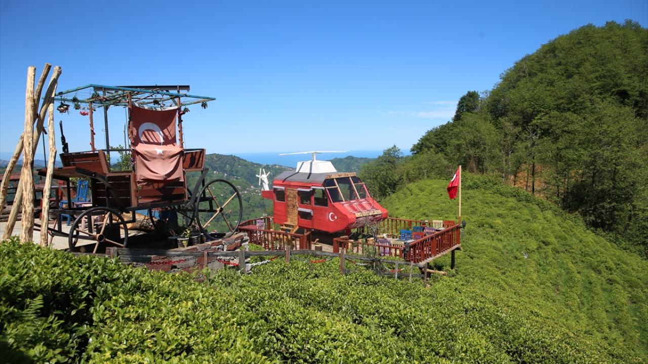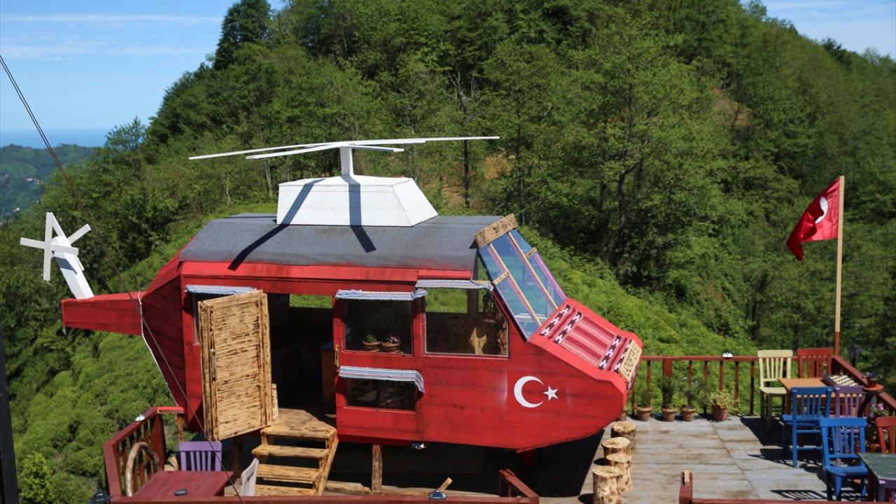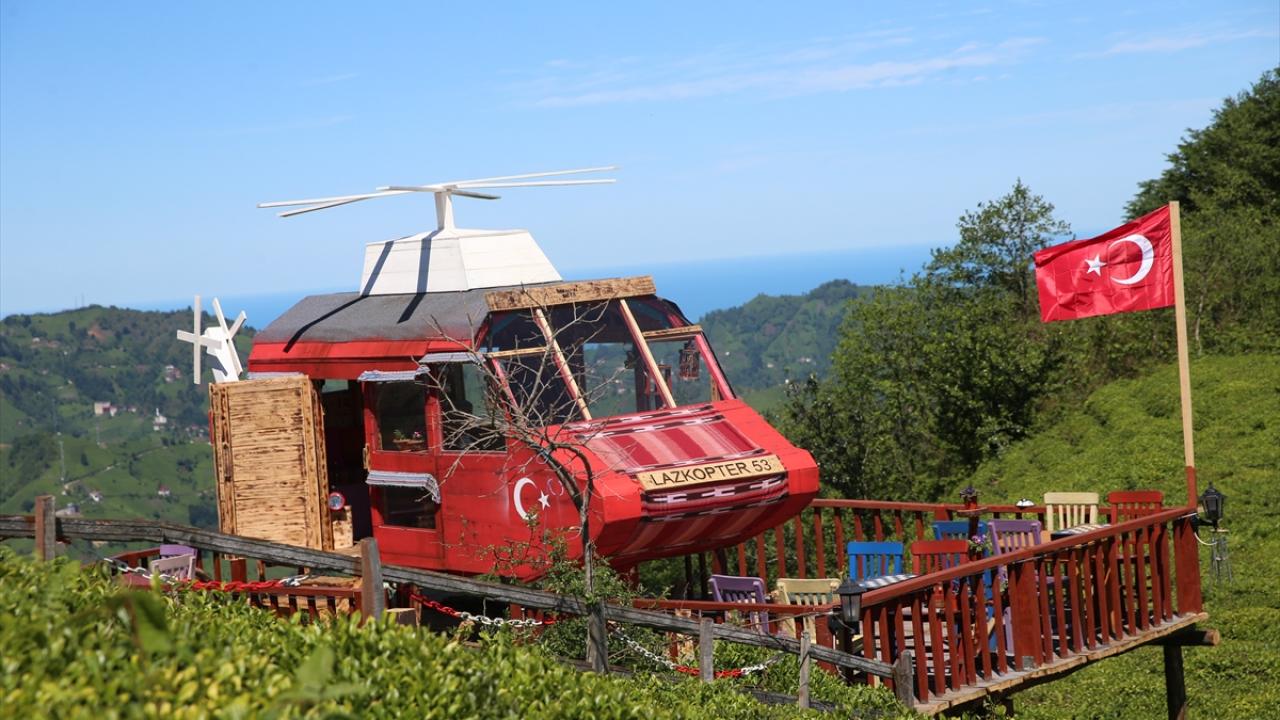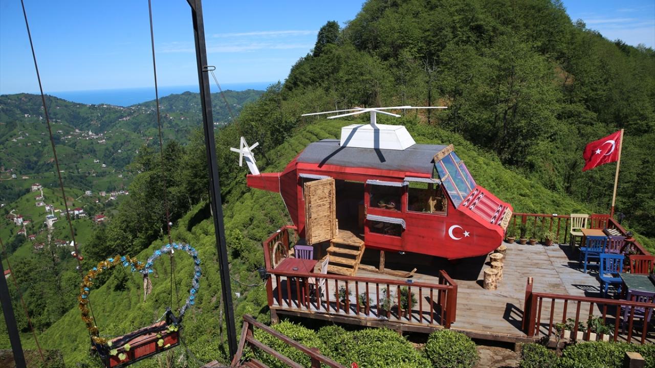 Çayeli ilçesine bağlı Derecik köyünde işletmeci Sedat Şimşek, çay bahçesinde helikopter şeklindeki ahşap yapıyı dört arkadaşıyla birlikte yaklaşık 3 ayda inşa etti.