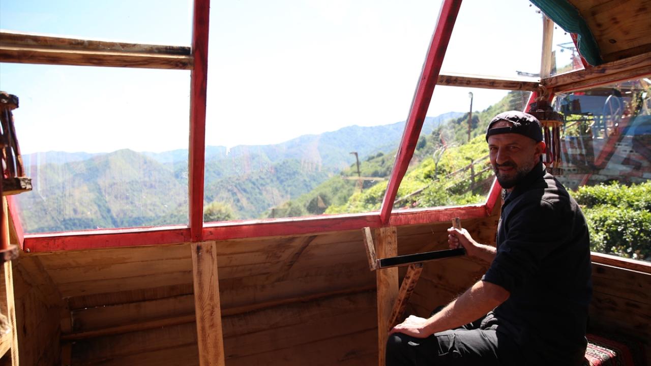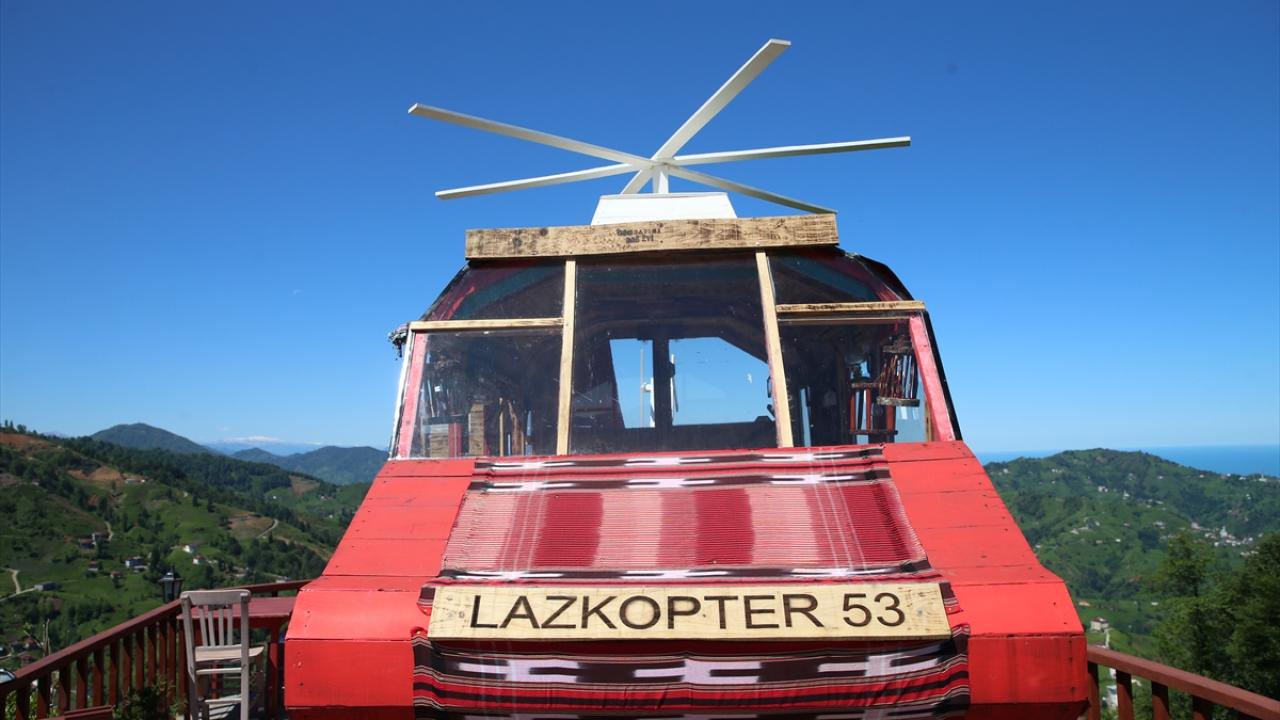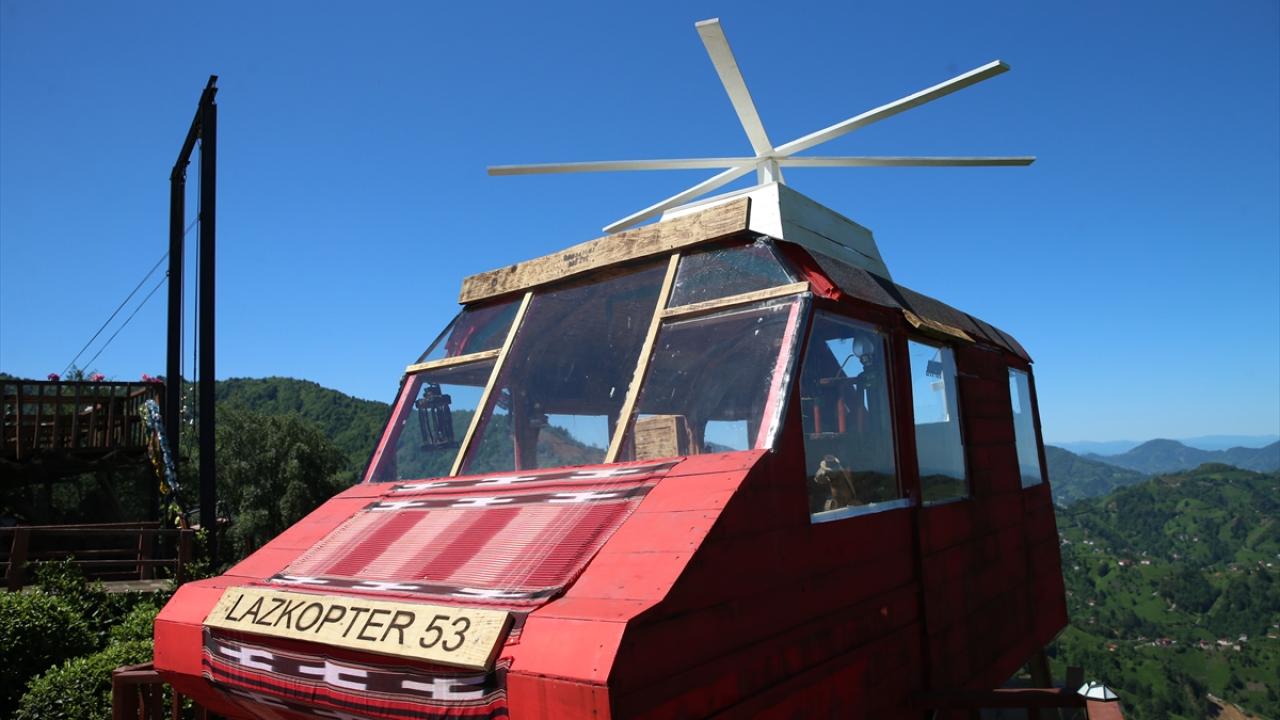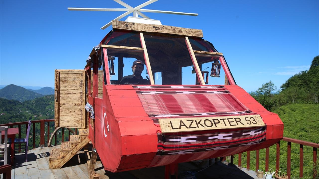 "Kar kış demeden üç ay boyunca çok sıkı bir çalışmayla arkadaşlarımızla beraber `Lazkopter53` adını verdiğim helikopteri dağ evimin bahçesine indirdik. Tamamen kestane ağacı ile yaptım. Yöremiz yağmurlu ve rutubetli bir bölge olduğu için en dayanıklı kestane ağacı ile yaptım. 4 metre yüksekliğinde, uzunluğu ise 6 metre. İçinde 15 kişi rahatlıkla oturabilir. Çayınızı ve kahvenizi içebiliyorsunuz. Evlilik ve doğum günleri için kutlama yapmak isteyenler de oluyor."