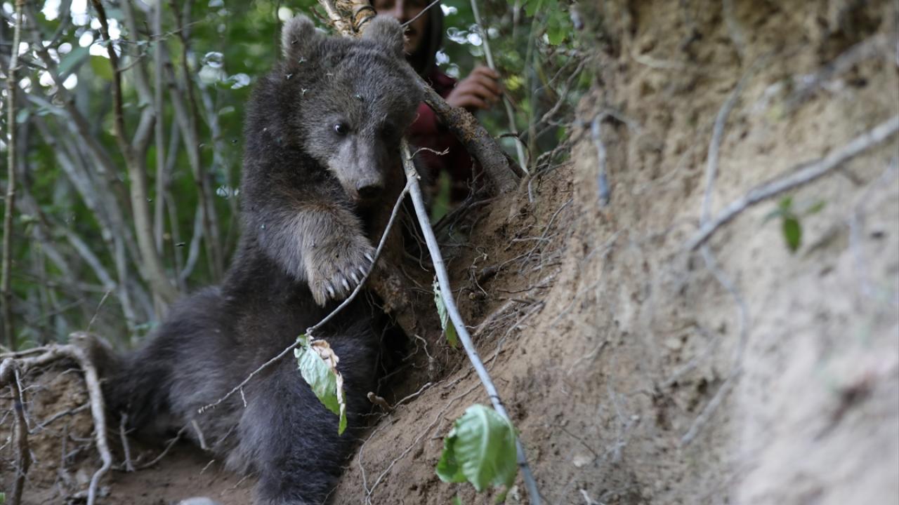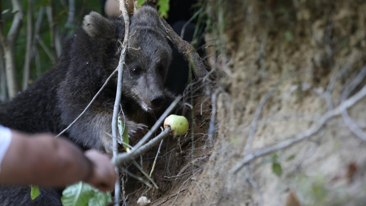 Uyuşturucu iğne yardımıyla bayıltılan yavru ayı, ekiplerin yaklaşık bir saatlik çalışması sonucu bulunduğu yerden kurtarıldı.