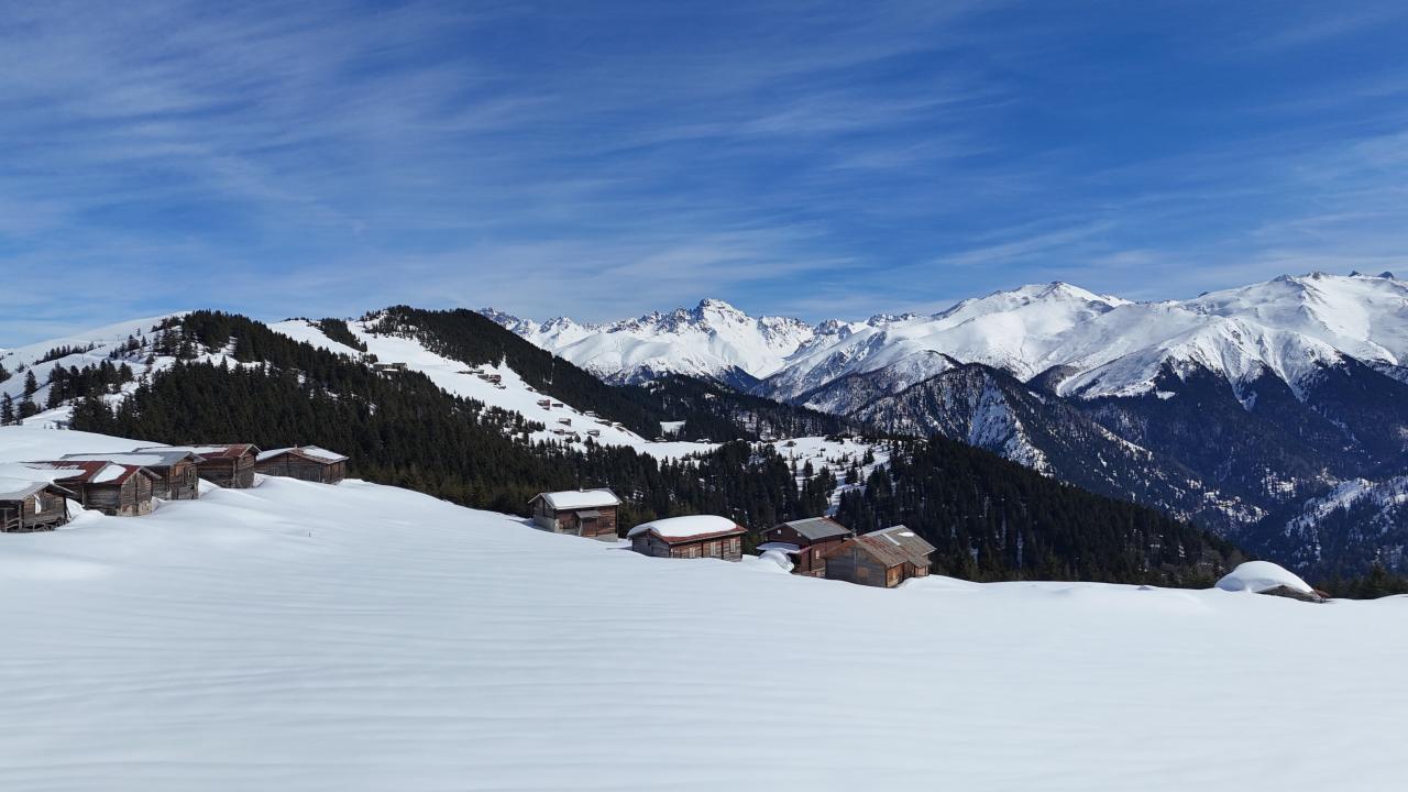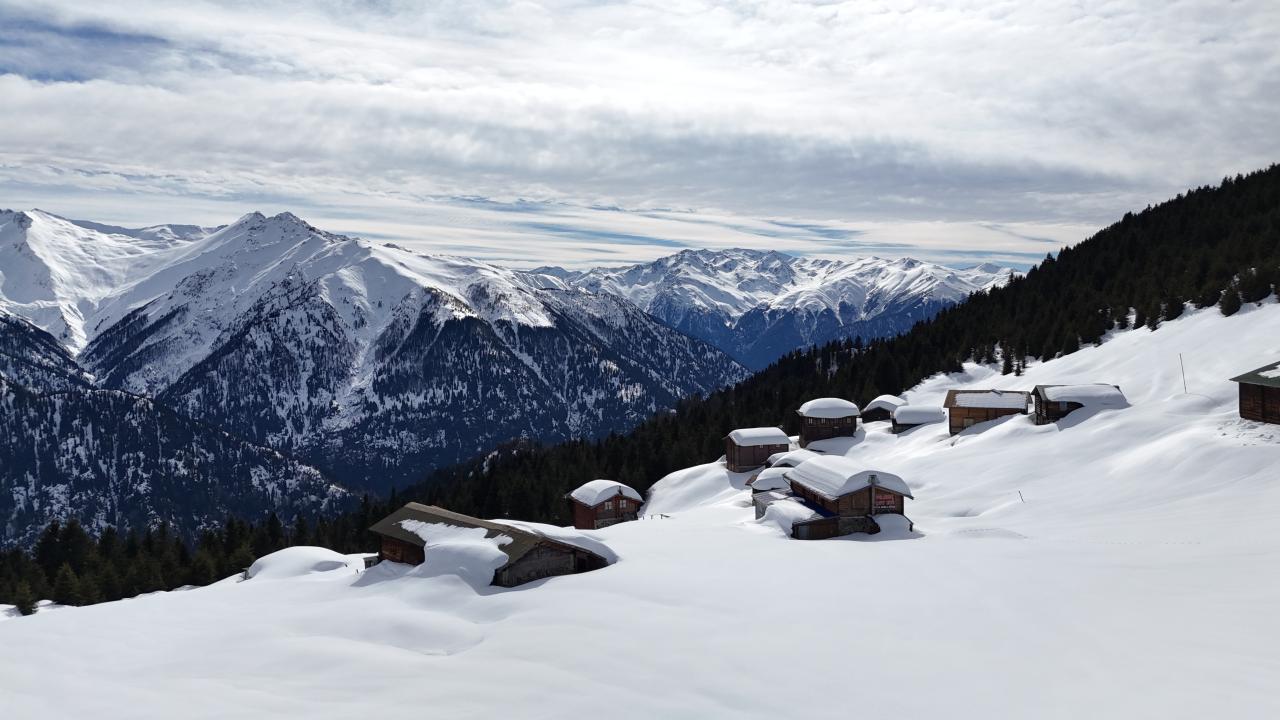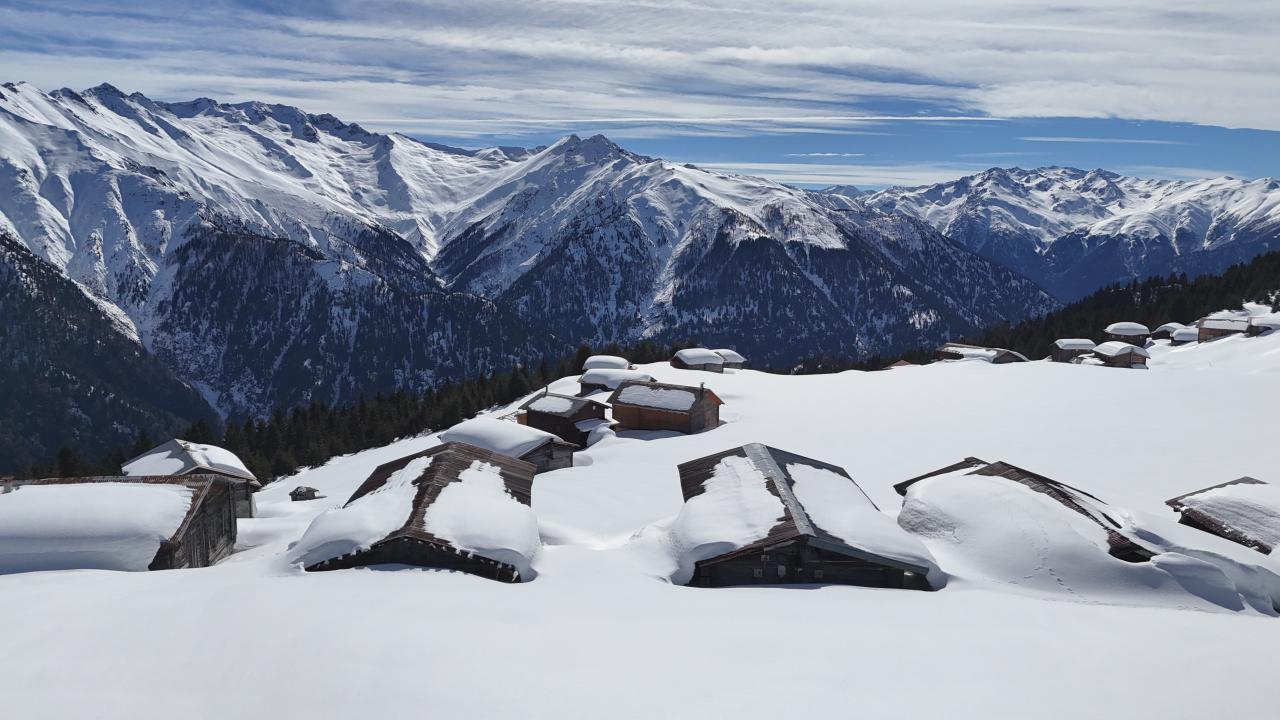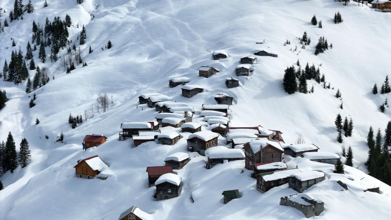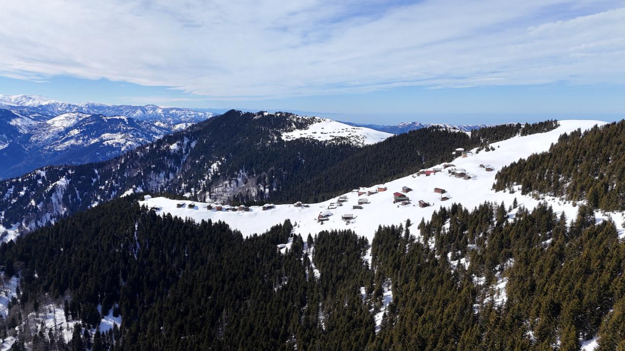 Karla kaplı yayla evleri ve Kaçkar Dağları`nın zirveleri dronla kaydedildi.
