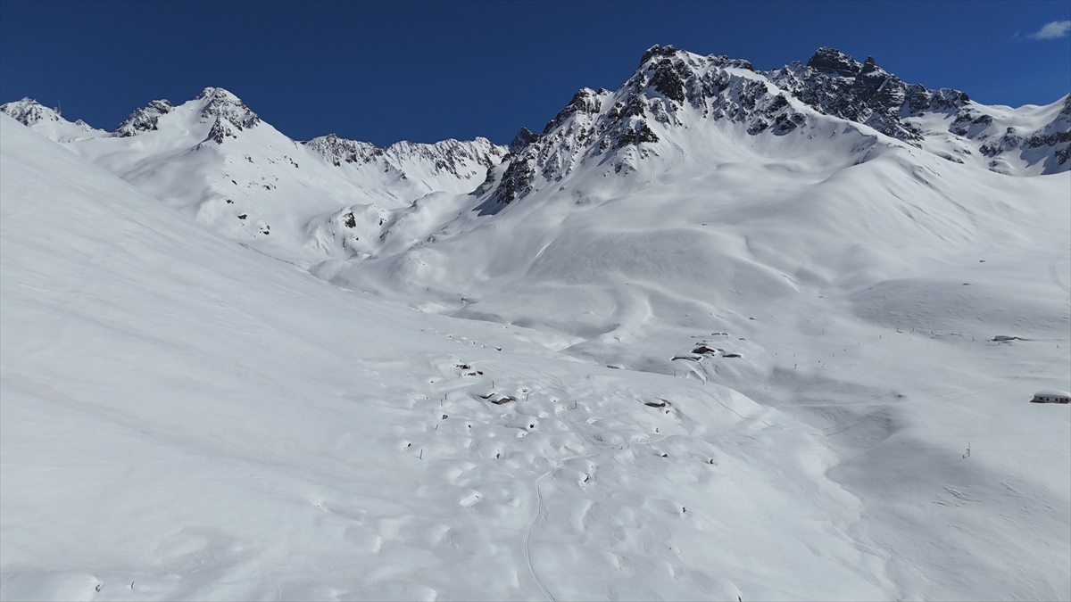 Karla kaplı yayla evleri ve yaylanın zirveleri dronla kaydedildi.