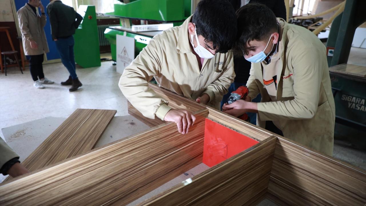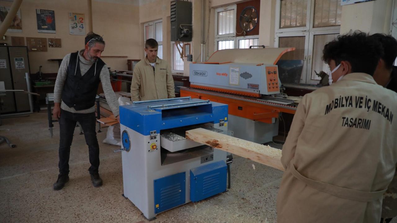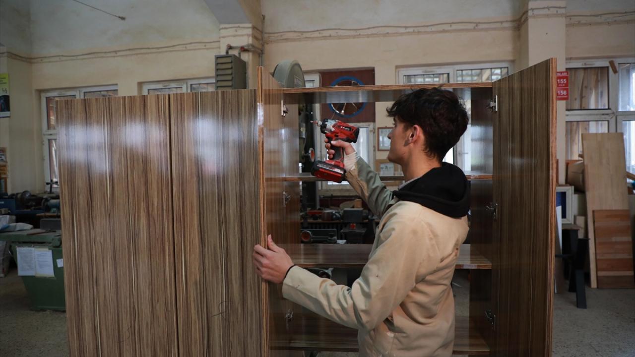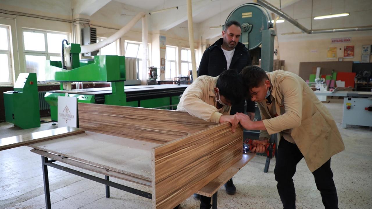 Bu doğrultuda Bakanlık ve iş insanlarınca mobilya bölümündeki ekipmanların yenilendiği okulda öğrenciler, masa, dolap gibi eşya üretimine başladı.