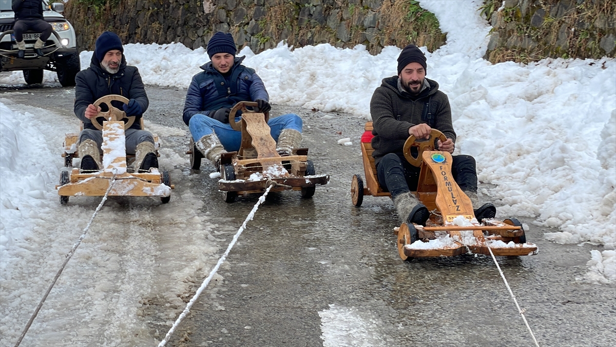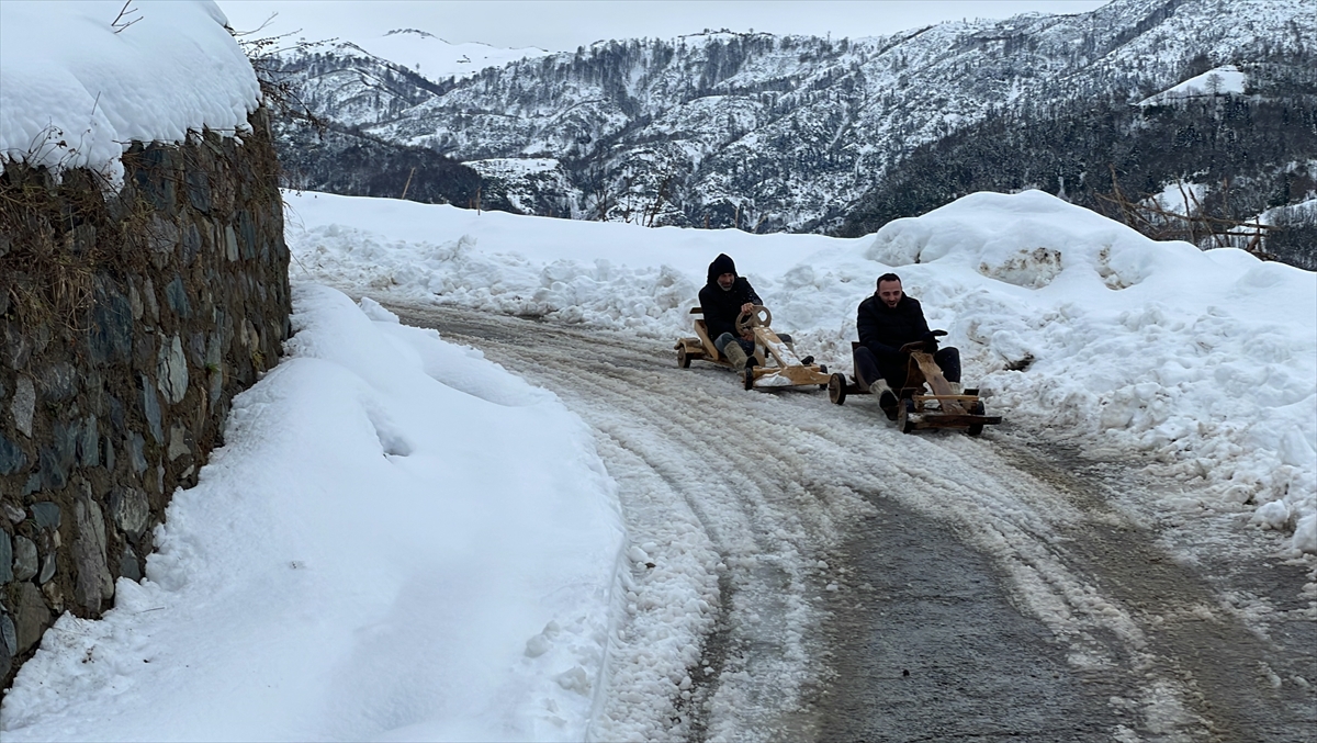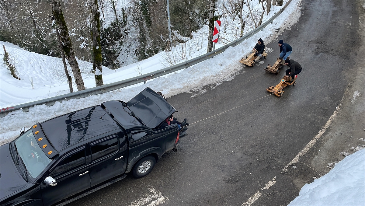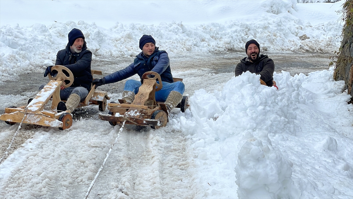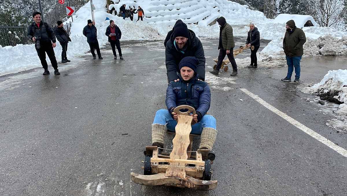 Ardeşen-Tunca arasında ulaşımın sağlandığı yola tahta arabalarıyla gelen bazı belde sakinleri, yer yer kar bulunan 2 kilometrelik güzergahta eğlenceli anlar yaşadı.