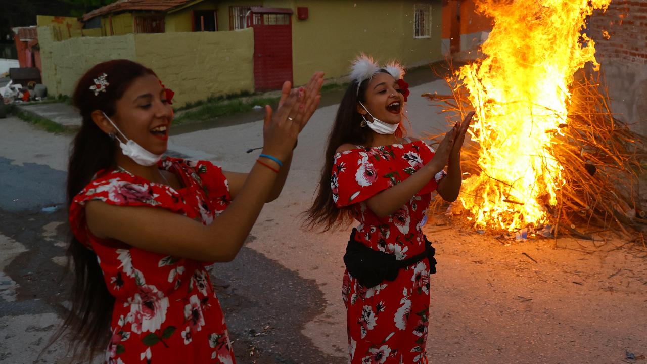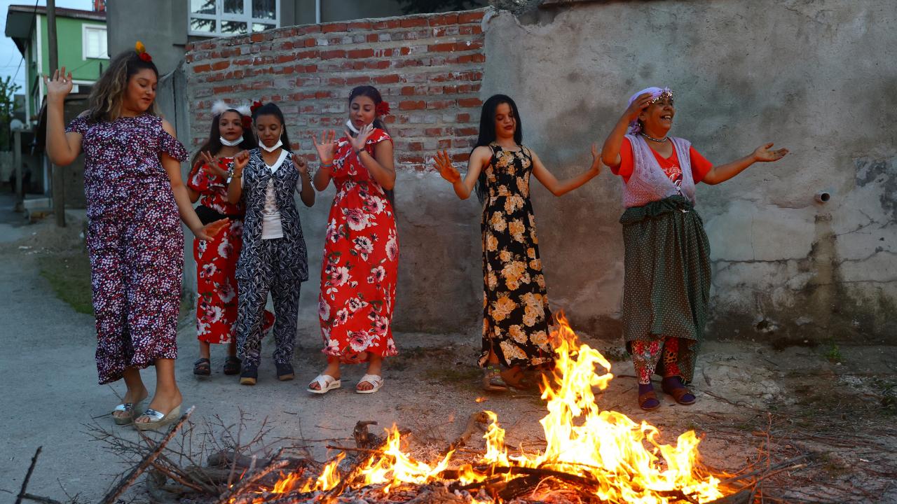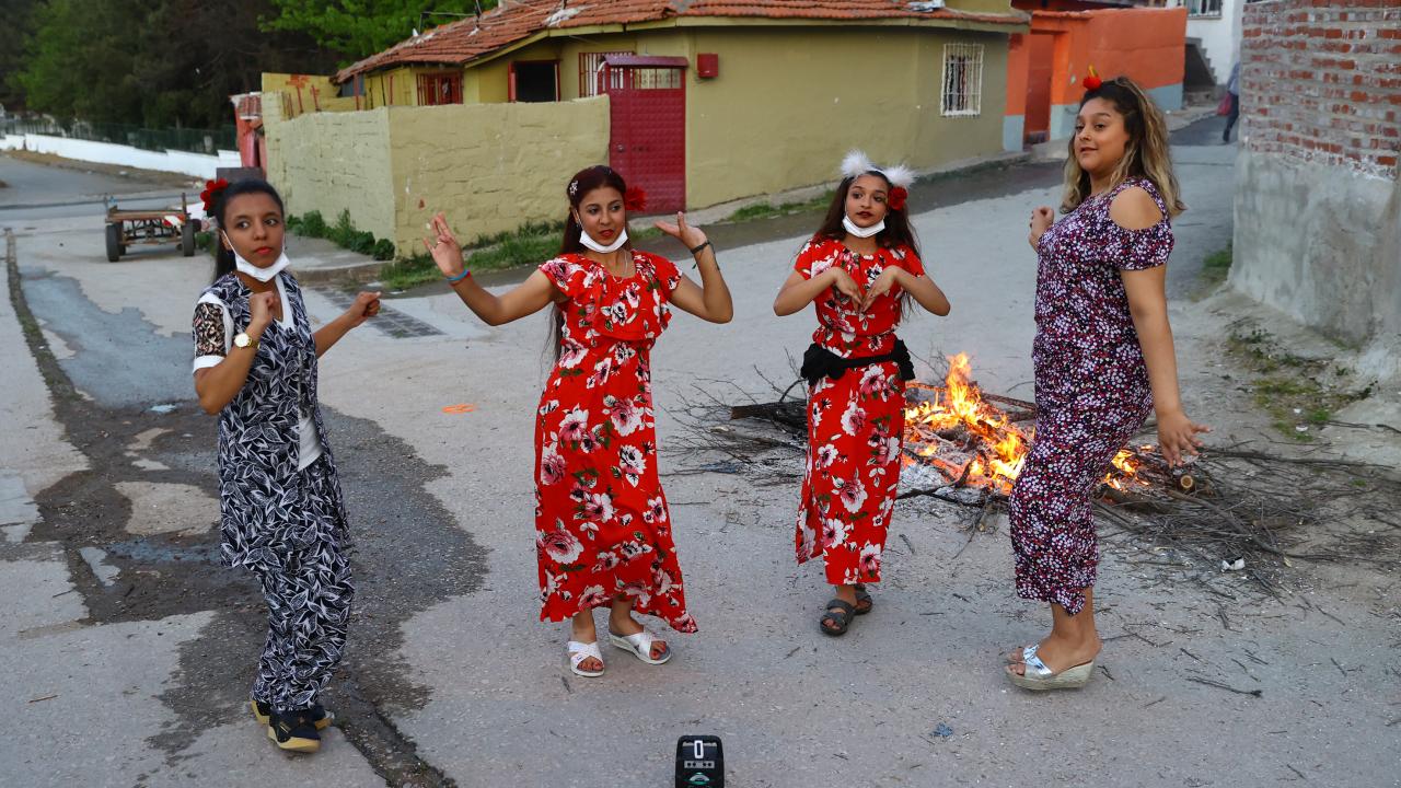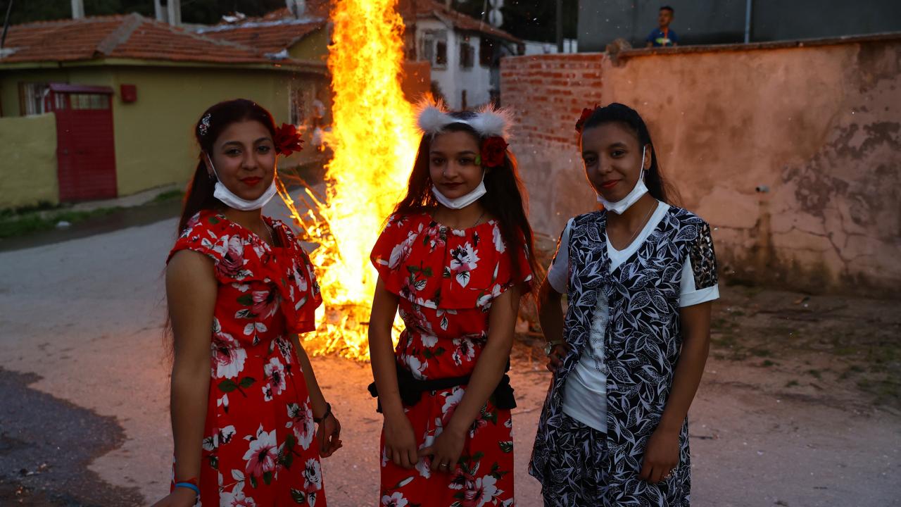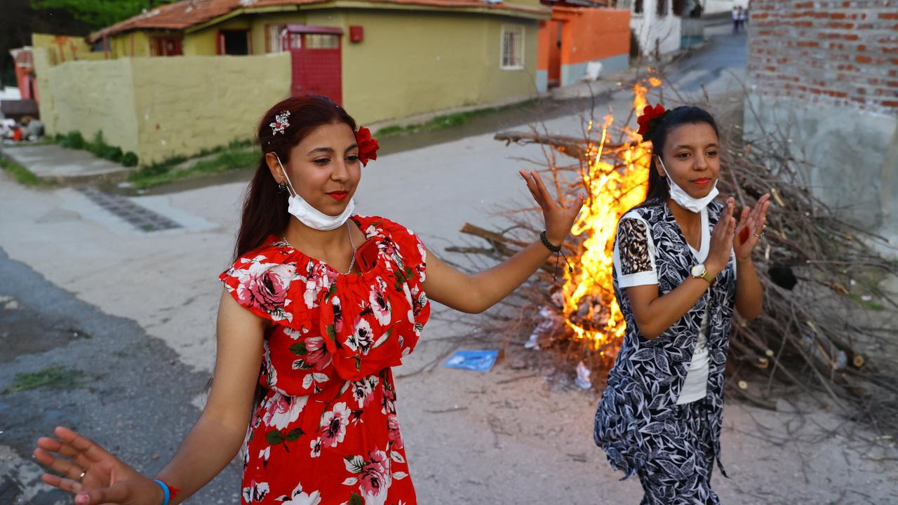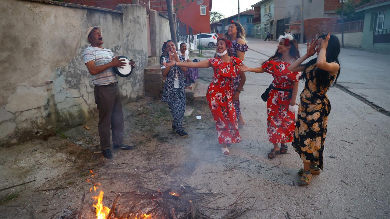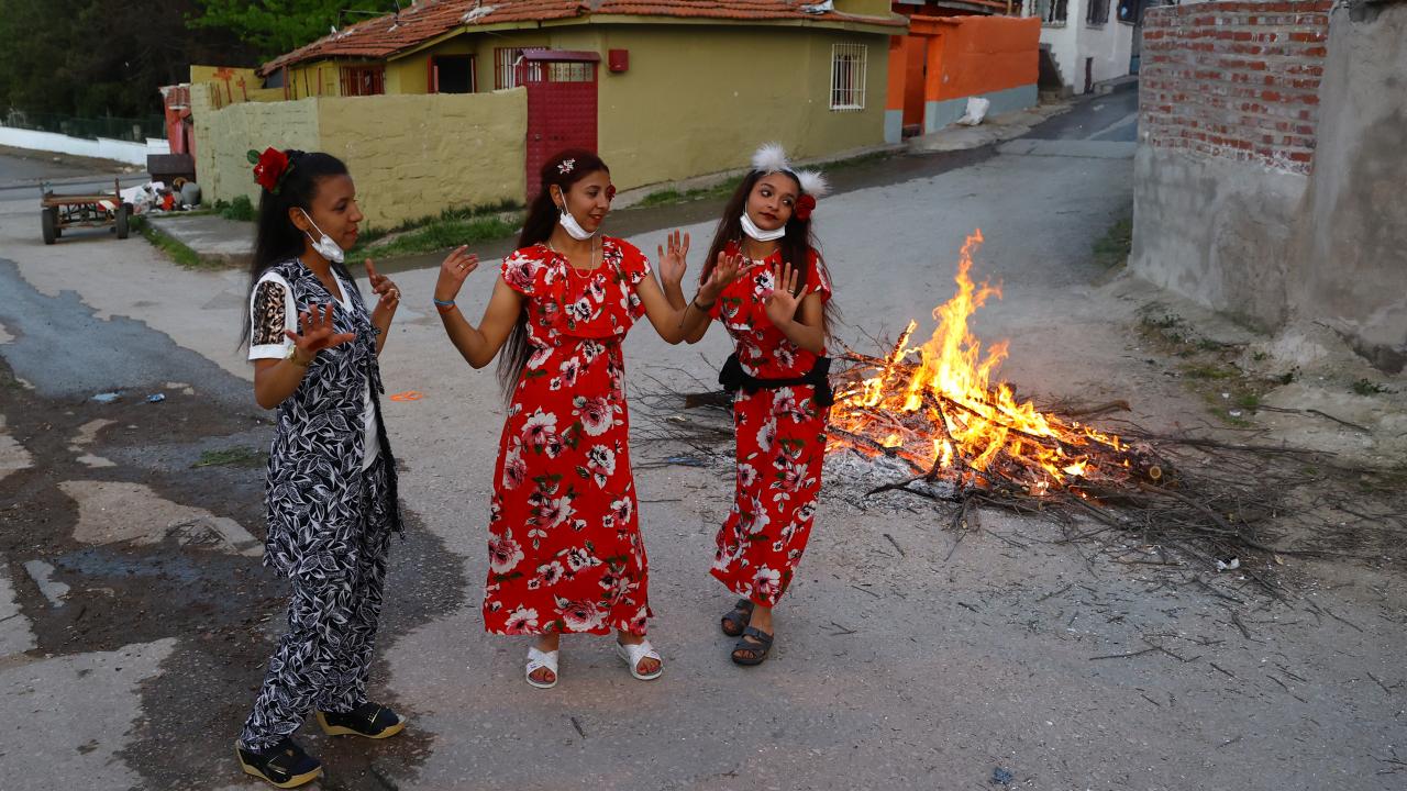 Evlerinin önünde ateş yakan romanlar, şarkılar eşliğinde dans etti, ateşin üzerinden atladı.