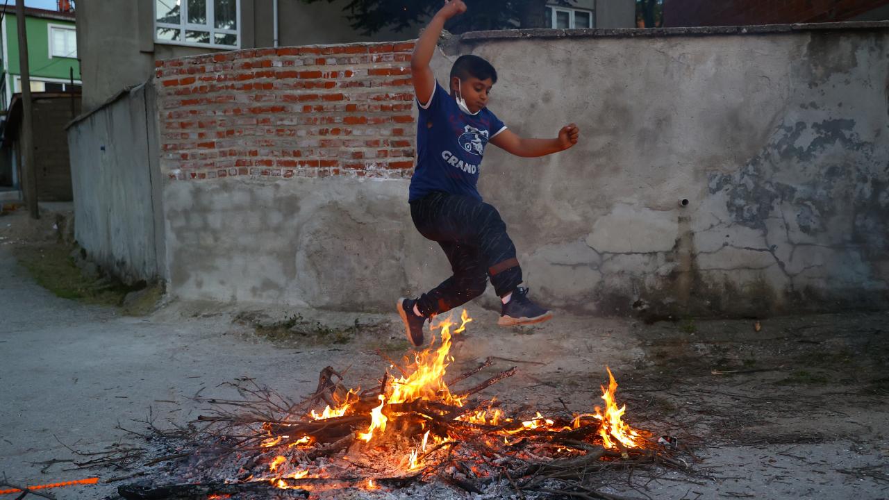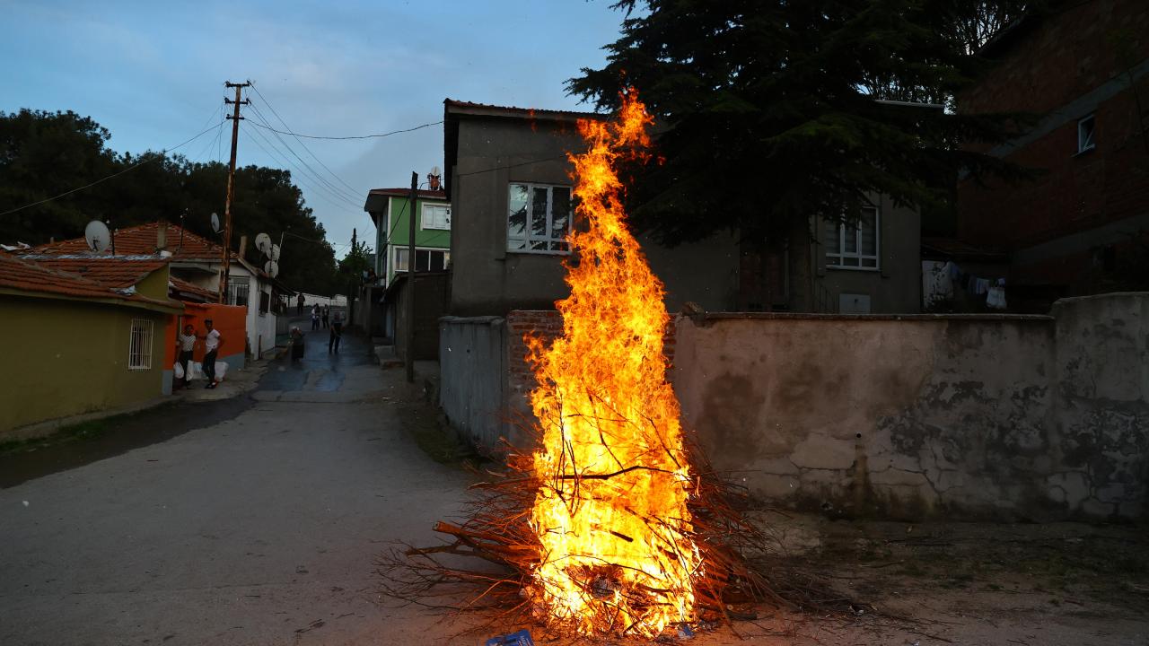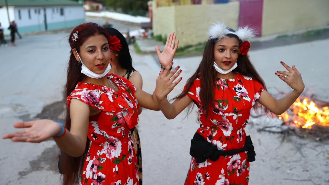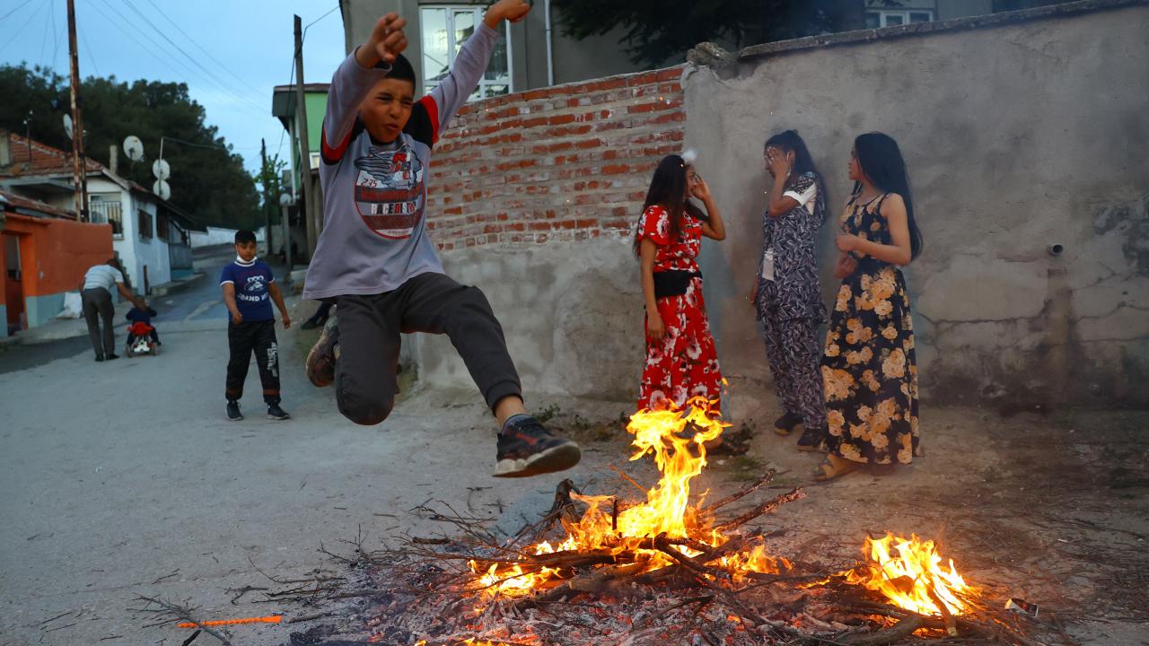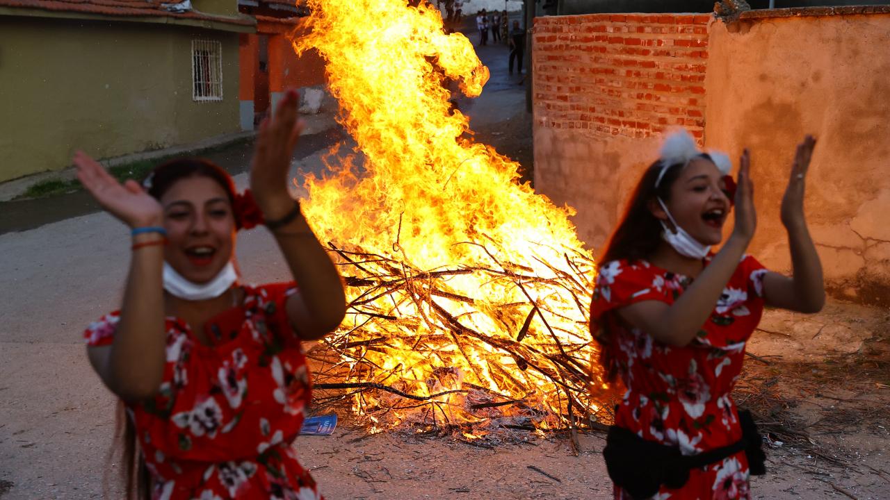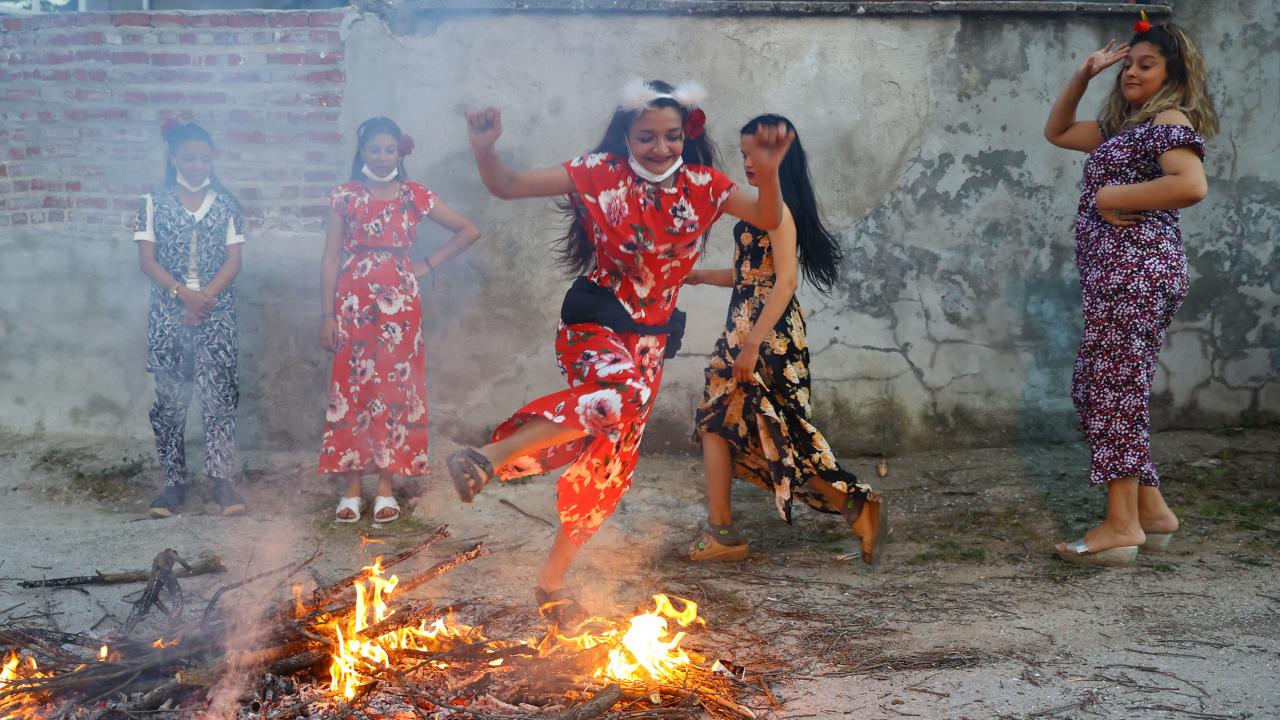 Evlerinin önünde ateş yakan romanlar, şarkılar eşliğinde dans etti, ateşin üzerinden atladı.