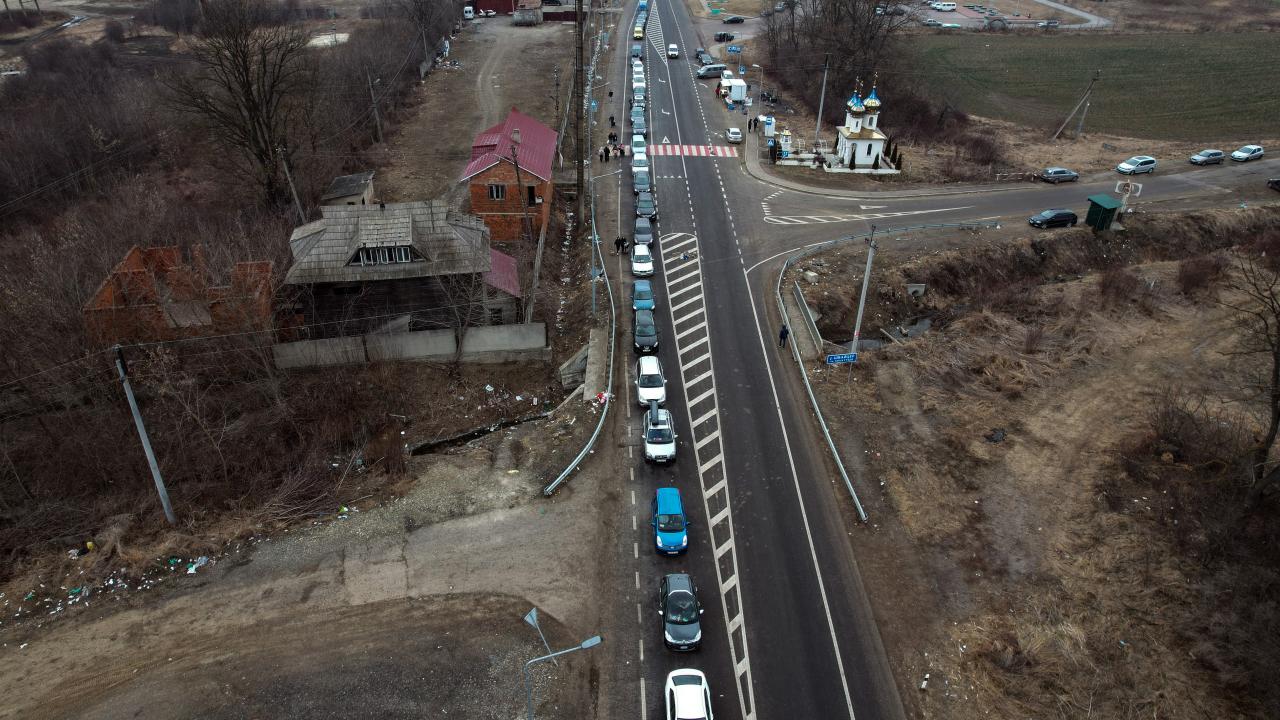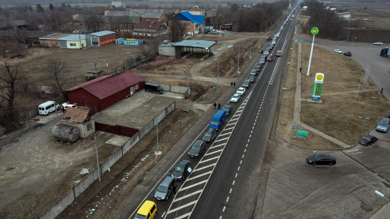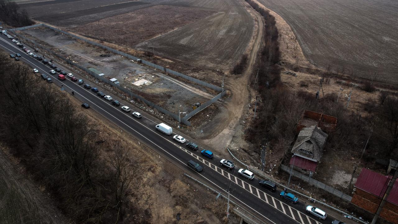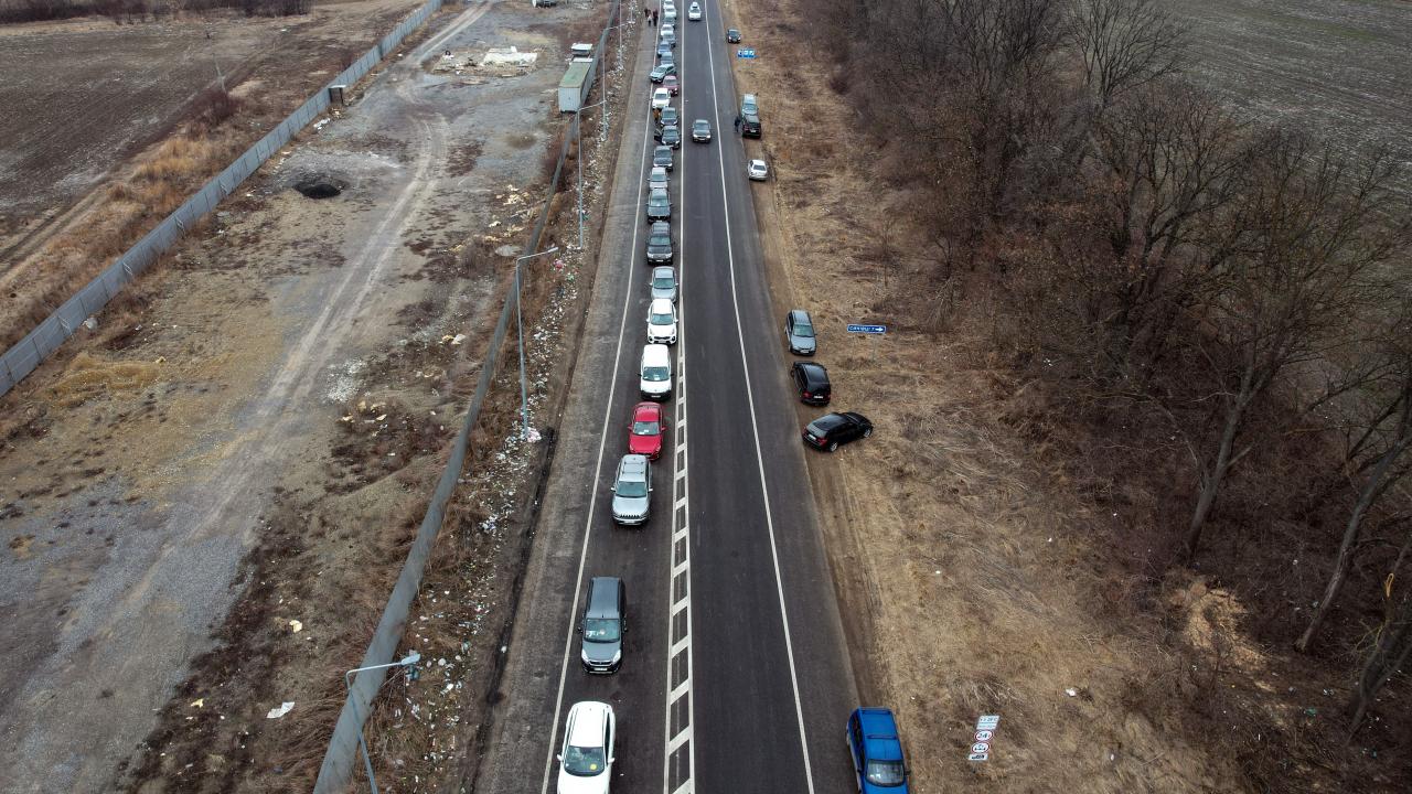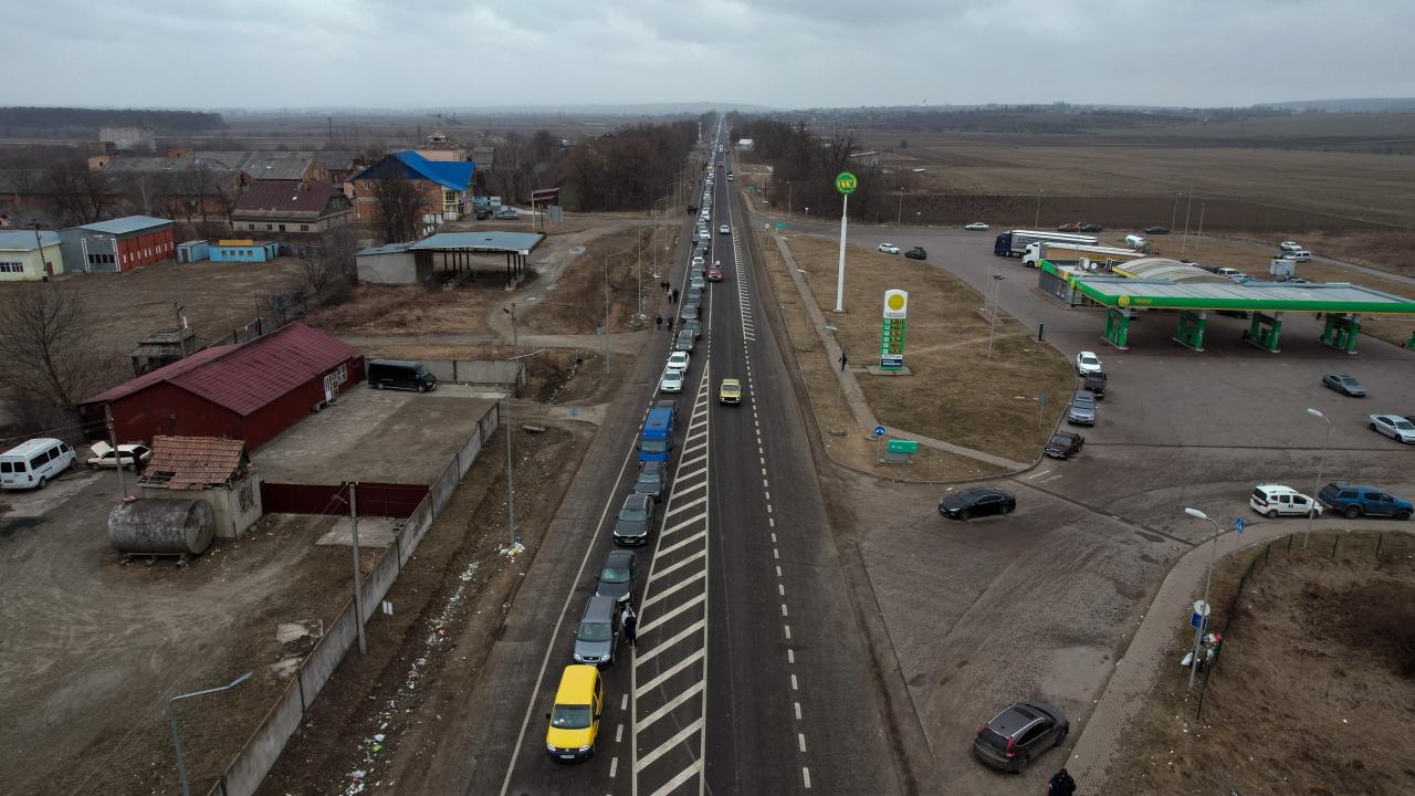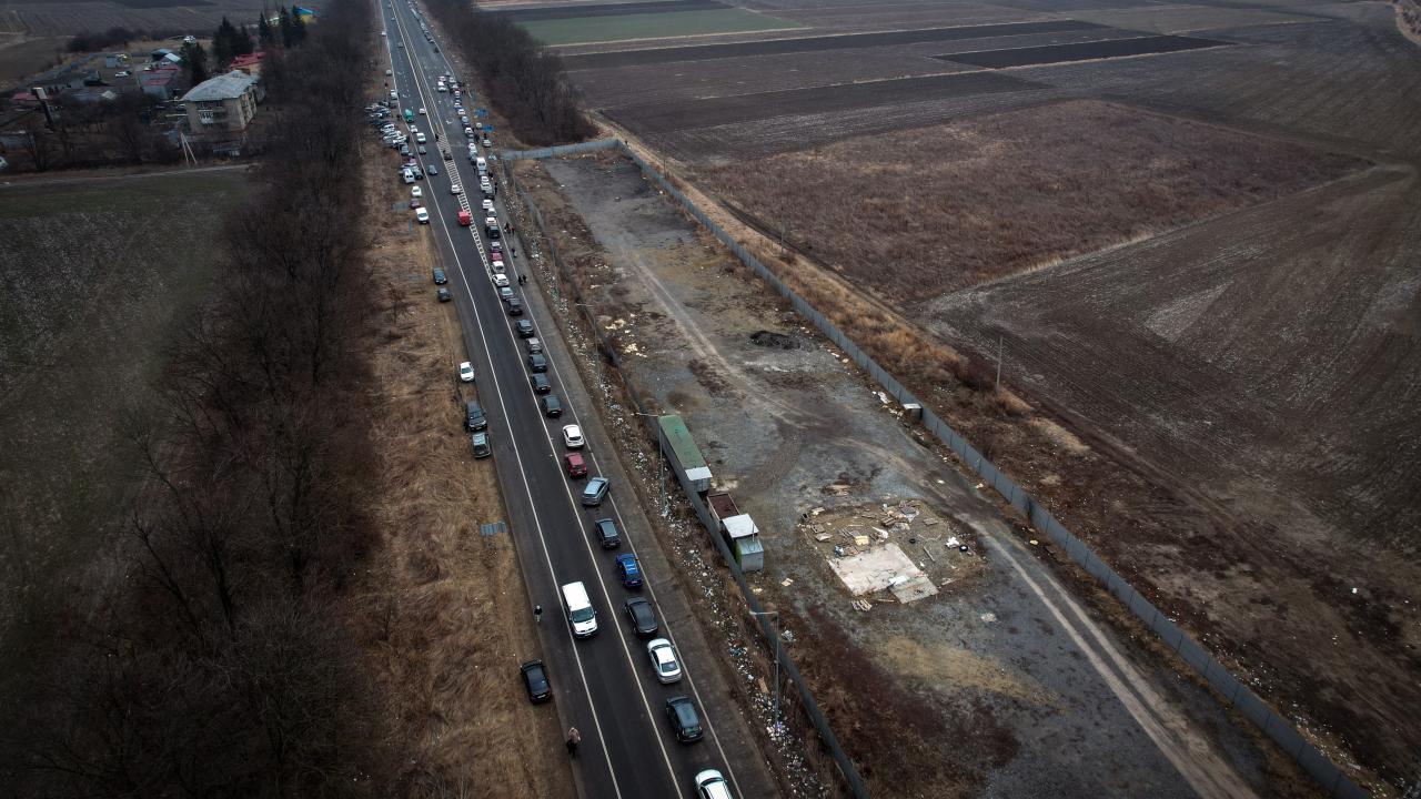 Rusya’nın Ukrayna saldırıları devam ederken ülkeden ayrılan Ukraynalılar, Romanya sınırında kilometrelerce uzun araç kuyrukları oluşturdu.