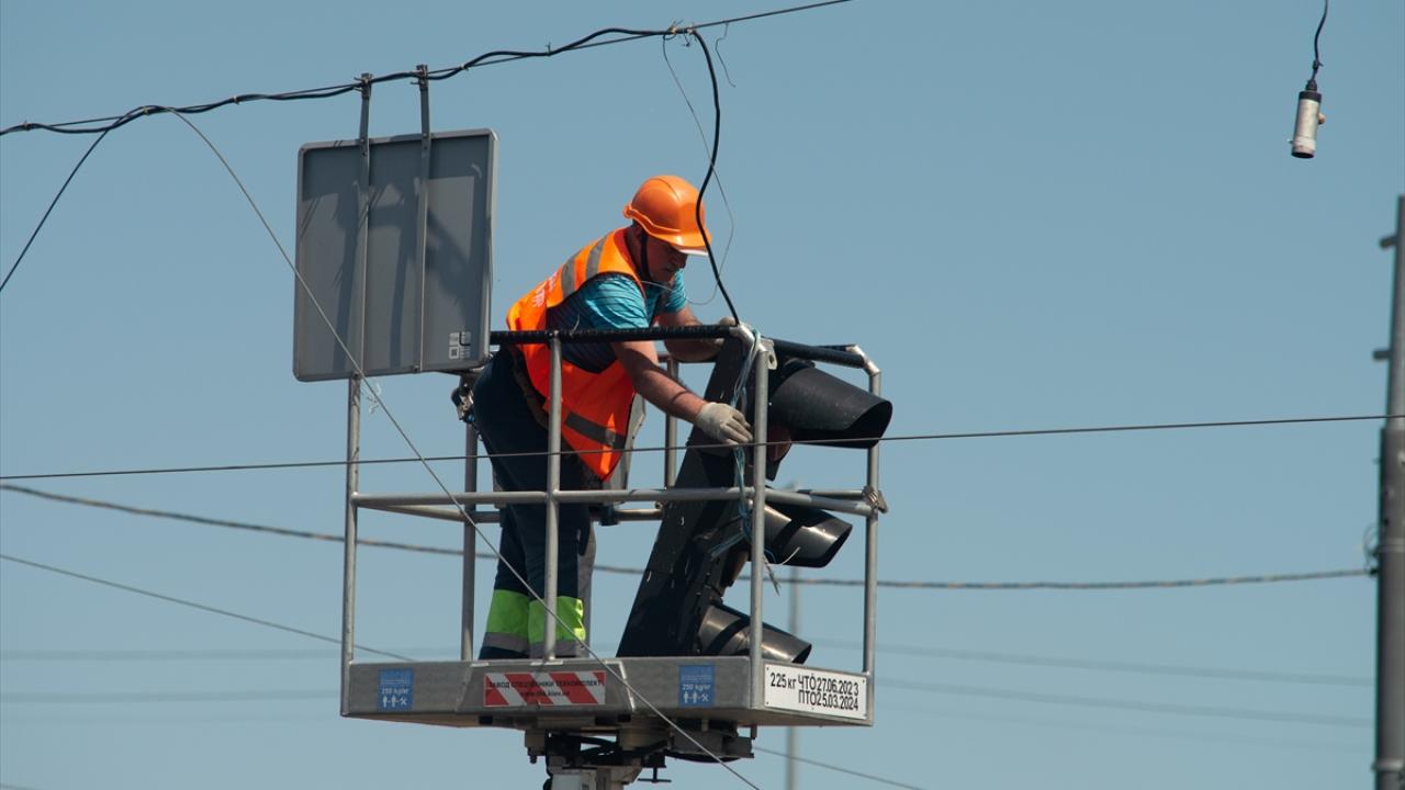Belediye işçileri olayın ardından zarar gören trafik lambasını onardı.