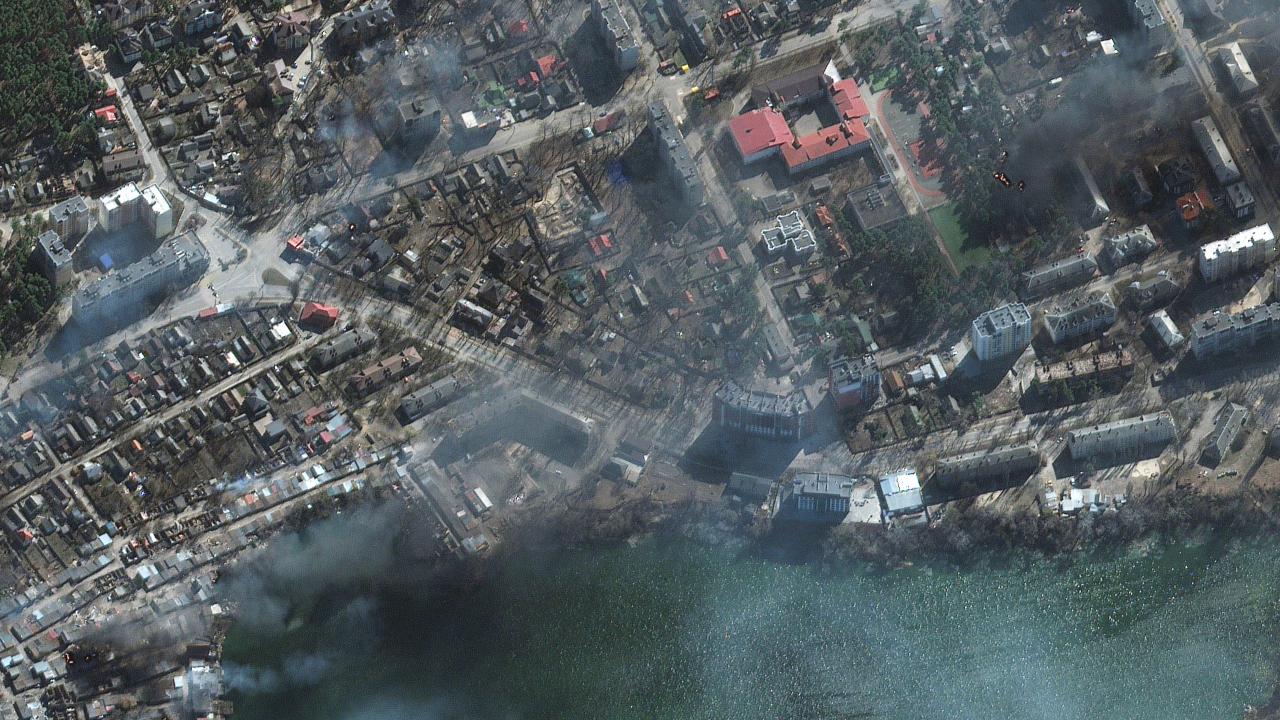 Bu görüntü, Kiev`in merkezine sadece 15 kilometre uzaklıktaki Irpin`den. Rus saldırılarının ardından yanan bir bölge ve hasar almış binalar.