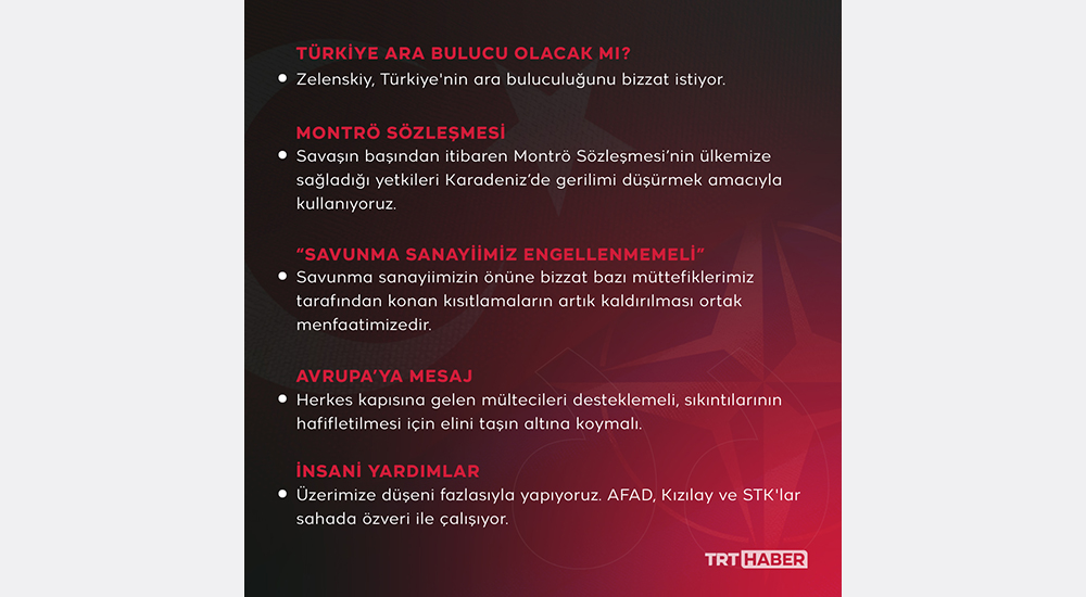 Cumhurbaşkanı Erdoğan, Rusya-Ukrayna krizinin başladığı günden beri, başta iki ülkenin devlet başkanları olmak üzere dünya lideriyle görüştü, barış çağrısını yüksek sesle dile getirdi. Ateş hattında çözüm için müzakere masası Türkiye`de kuruldu.