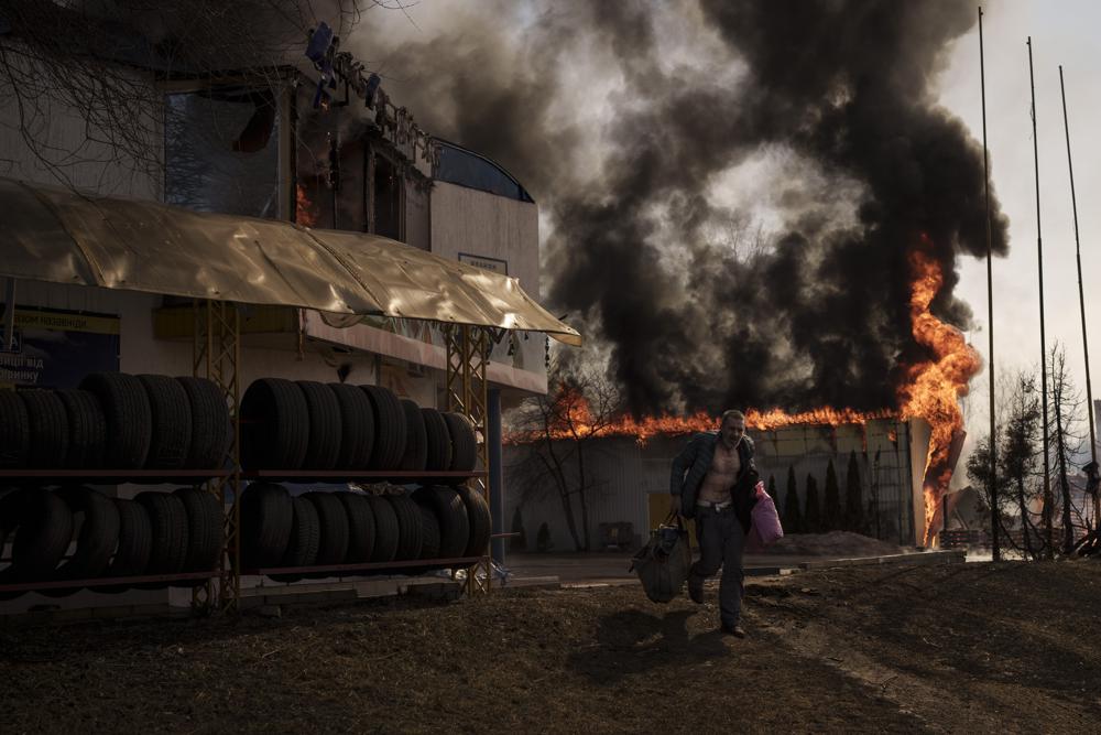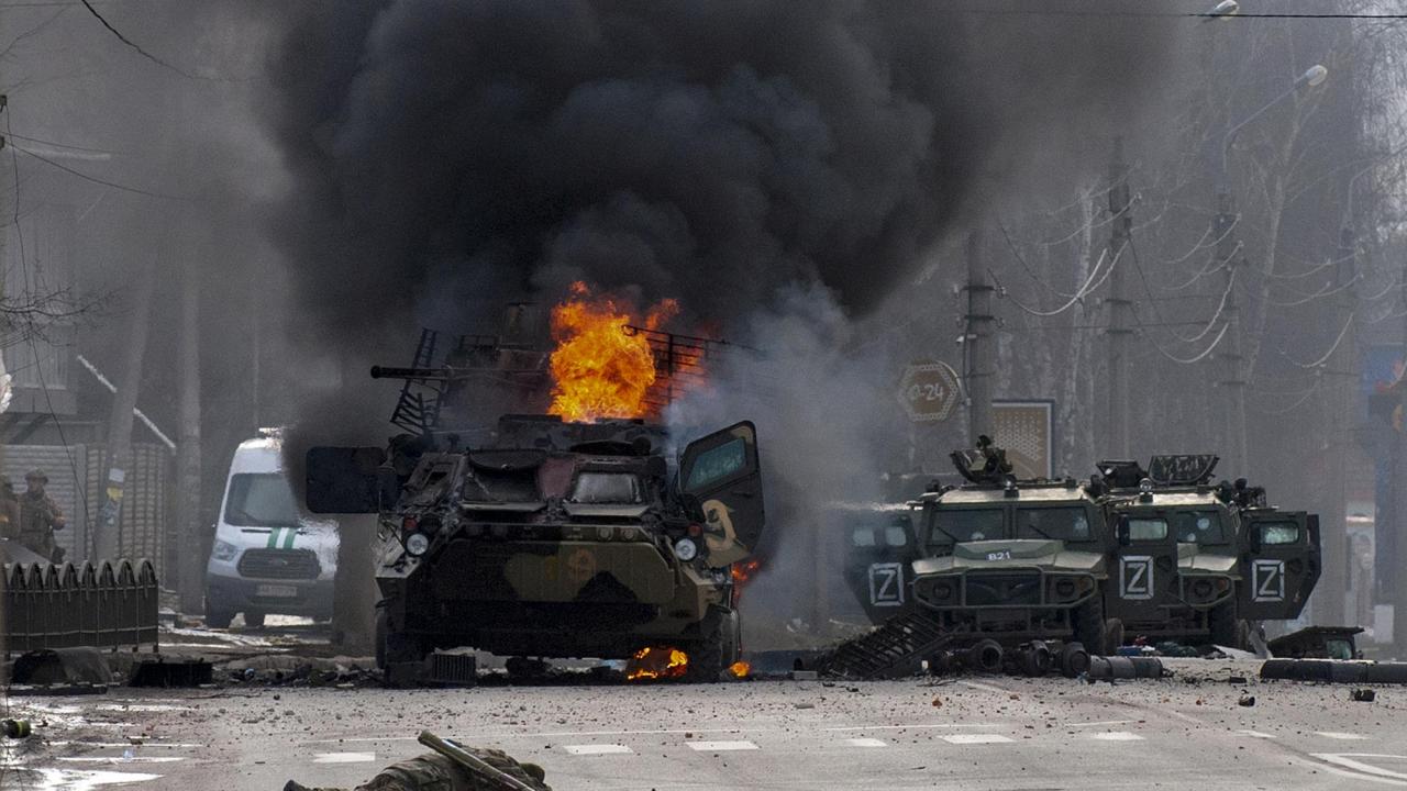 27 Şubat 2022, Ukrayna`da bir Rus zırhlı personel gemisi, hasar görmüş ve terk edilmiş hafif ticari araçların ortasında yanıyor.