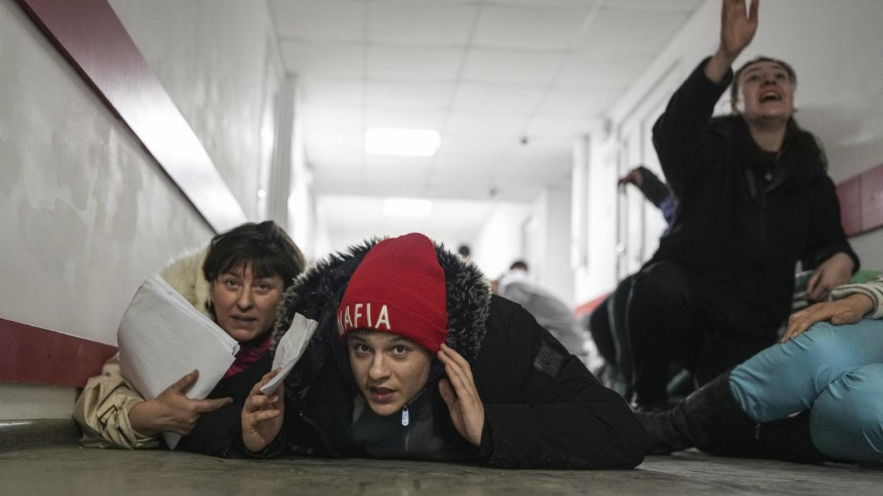 4 Mart 2022 Cuma, Mariupol, Ukrayna`da Rus güçlerinin bombardımanı sırasında insanlar bir hastanenin zemininde siper alıyorlar.
