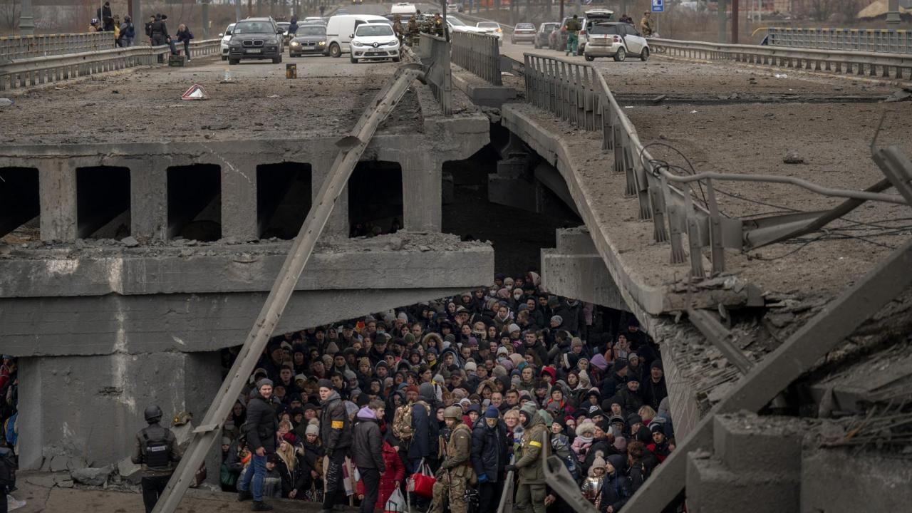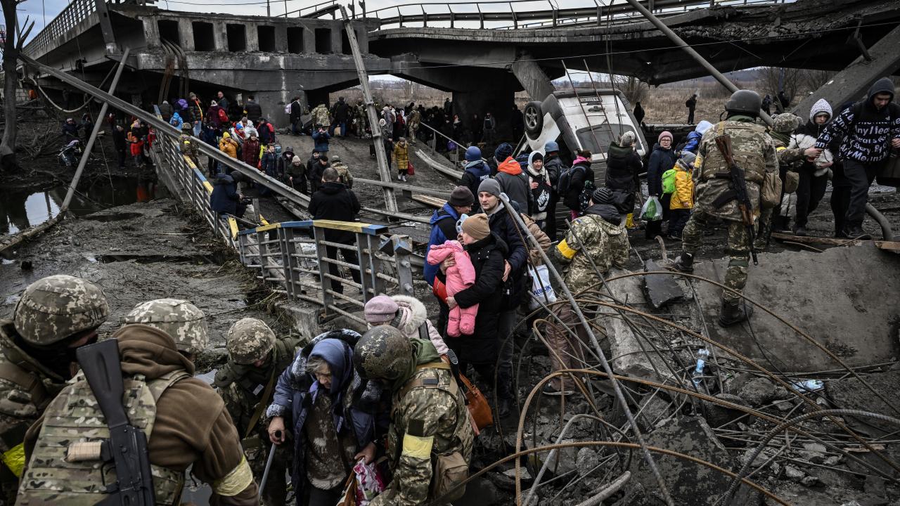 Ukraynalılar, 5 Mart 2022 Cumartesi, Ukrayna, Kiev`in eteklerinde Irpin Nehri`ni geçerek kaçmaya çalışırken yıkılan bir köprünün altında toplanıyor.