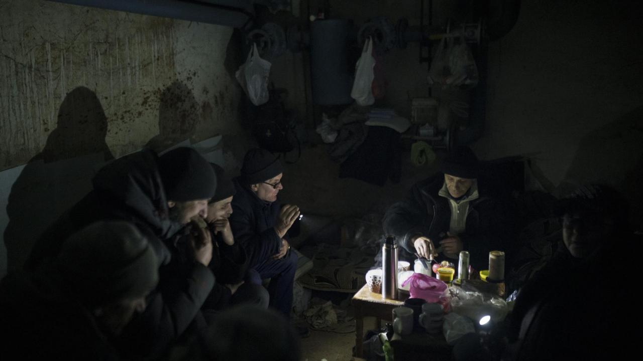 13 Mart 2022`de, Ukrayna, Kiev yakınlarındaki Irpin`de sakinler bomba sığınağı olarak kullanılan bir bodrum katında çay hazırlıyorlar.