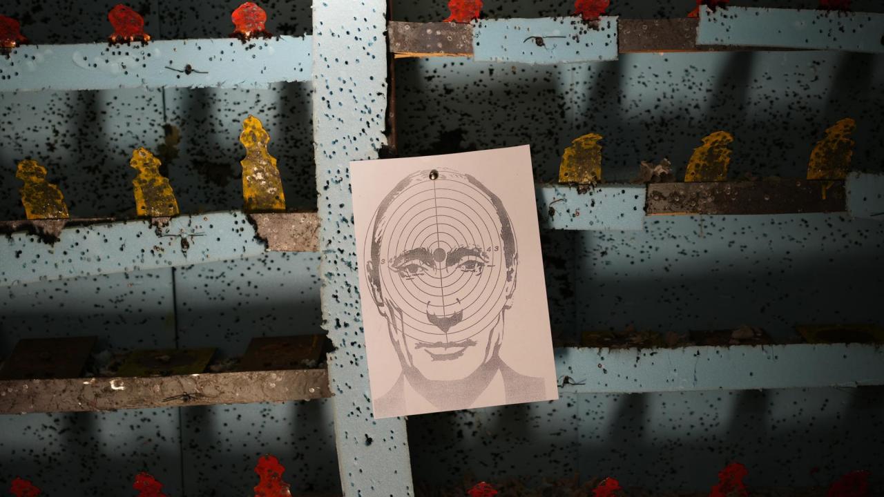 Rusya Devlet Başkanı Vladimir Putin`in bir resmi, Batı Ukrayna`daki Lviv`de bir atış talim sahasında asılı duruyor.