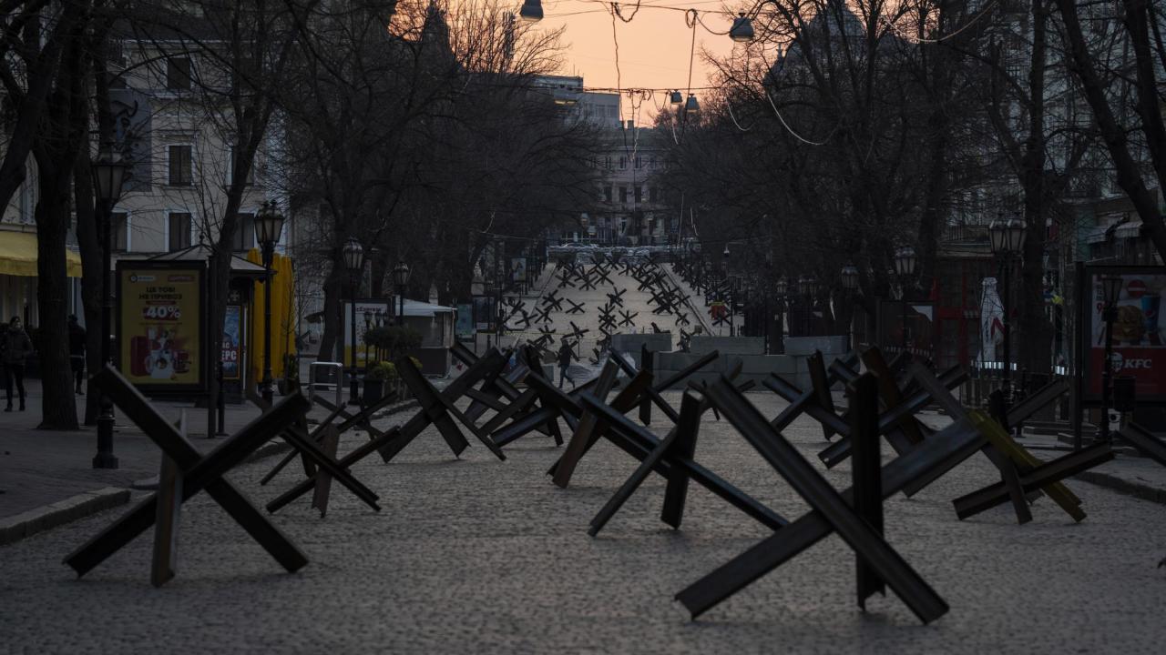 Tanksavar barikatları, 24 Mart 2022`de Ukrayna`nın Odesa kentinde olası bir Rus taarruzuna hazırlık amacıyla yerleştirilen bir caddeyi engelliyor.